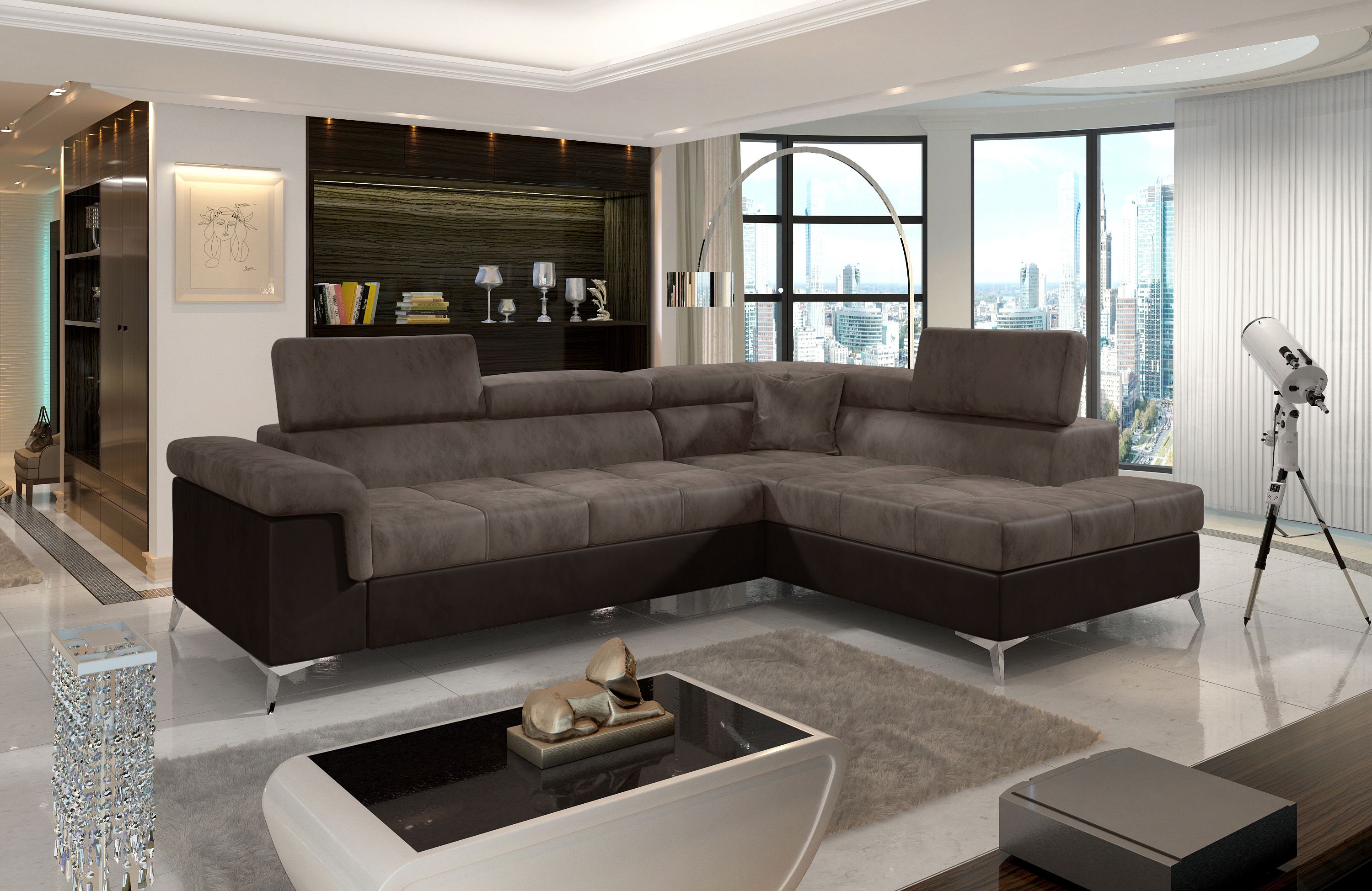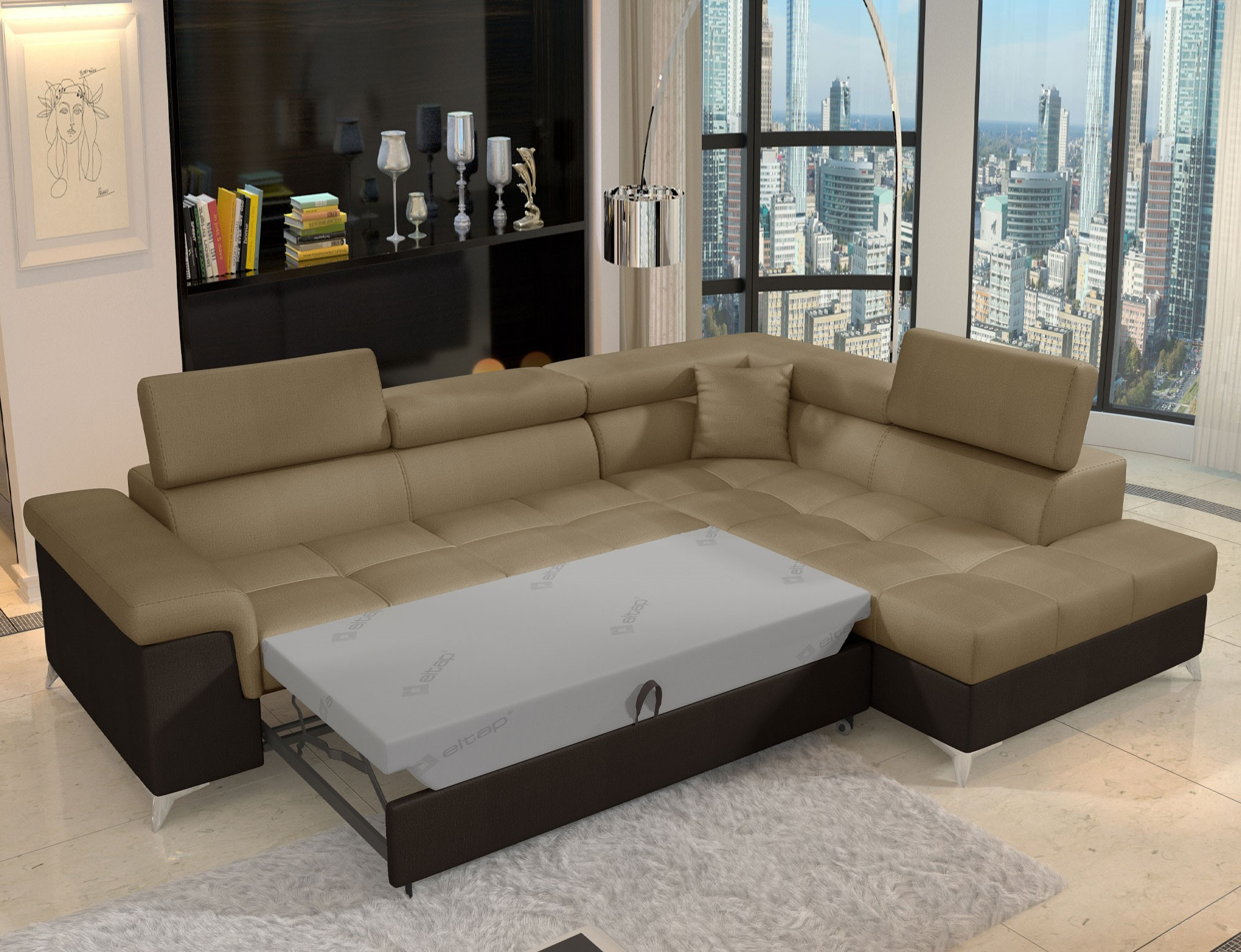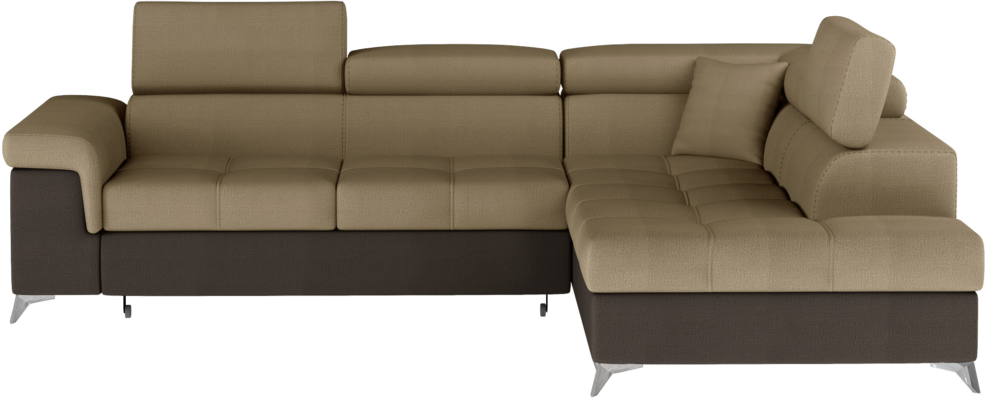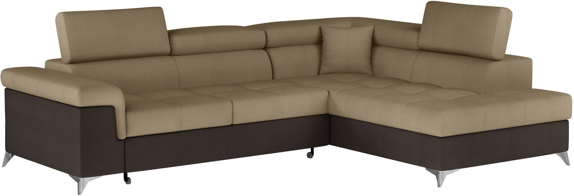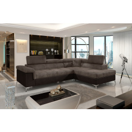 Sedací souprava Eridano v provedení Monolith 09/ MOnolith 29 má rám z borovicového dřeva. Sedadlo je vyplněno vlnovou pružinou s pěnou T3030 a vysoce kvalitní elastickou HR pěnou. Pomocí mechanismu DL vznikne spací plocha o rozměru 193x123 cm. Nožky jsou kovové stříbrné o výšce 9 cm. Disponuje úložným prostorem. Nosnost soupravy 315 kg. Provedení rohu pravé. Dekorační polštářek je součástí. Zboží je částečně smontováno.