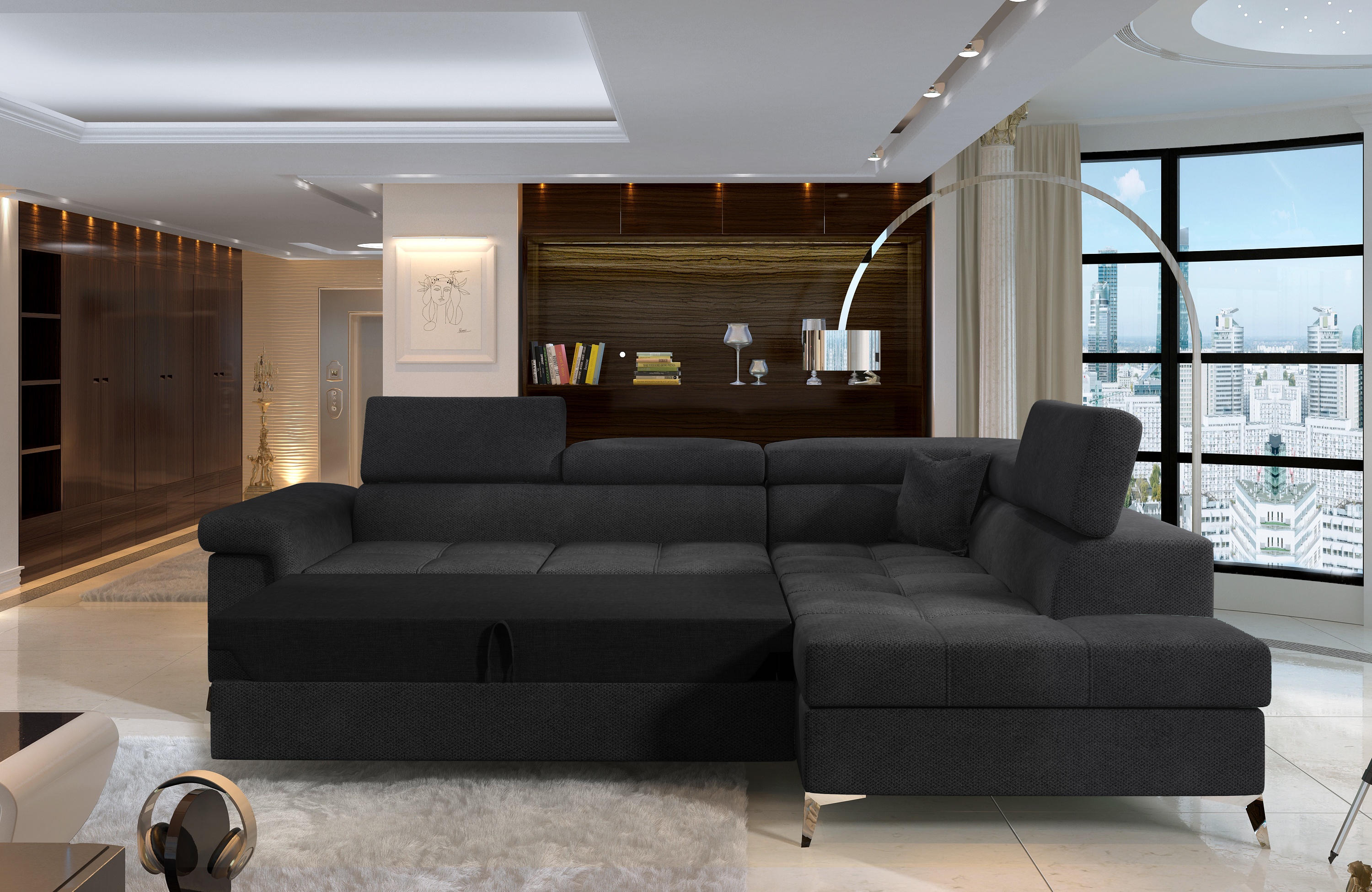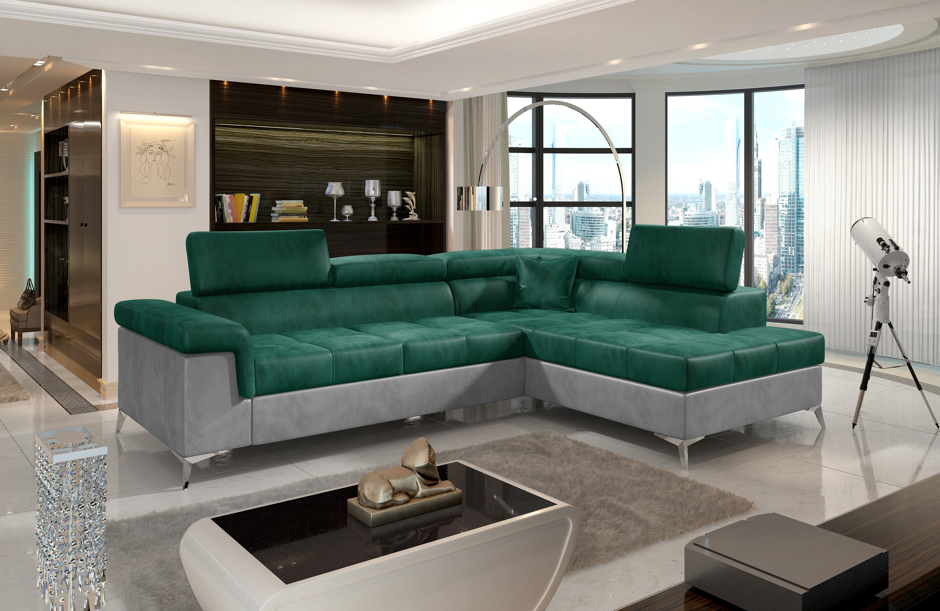 Rozkládací souprava s úložným prostorem v barevném provedení zelená/šedá. Spací plocha 125x193 cm. Výplň sedáků je vyrobena z vlnité pružiny a pěny T30 - tato kombinace zajišťuje měkkost, pružnost a dostatečnou oporu během odpočinku. Souprava nabízí prostorná sedadla, vhodně profilované opěradlo vybavené dodatečnými pohyblivými opěrkami hlavy, širokou loketní opěrku. Mimořádně stylovými dekorativními prvky jsou kovové, chromované nohy s vysokým leskem. Potahová látka jako na hlavní fotografii, provedení pravé. Možnost výběru pravého/levého provedení.