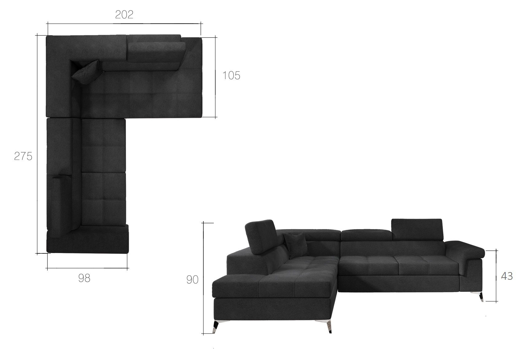 Rozkládací souprava s úložným prostorem v barevném provedení šedá/eko kůže černá. Spací plocha 125x193 cm. Výplň sedáků je vyrobena z vlnité pružiny a pěny T30 - tato kombinace zajišťuje měkkost, pružnost a dostatečnou oporu během odpočinku. Souprava nabízí prostorná sedadla, vhodně profilované opěradlo vybavené dodatečnými pohyblivými opěrkami hlavy, širokou loketní opěrku. Mimořádně stylovými dekorativními prvky jsou kovové, chromované nohy s vysokým leskem. Potahová látka jako na hlavní fotografii, provedení pravé. Možnost výběru pravého/levého provedení.