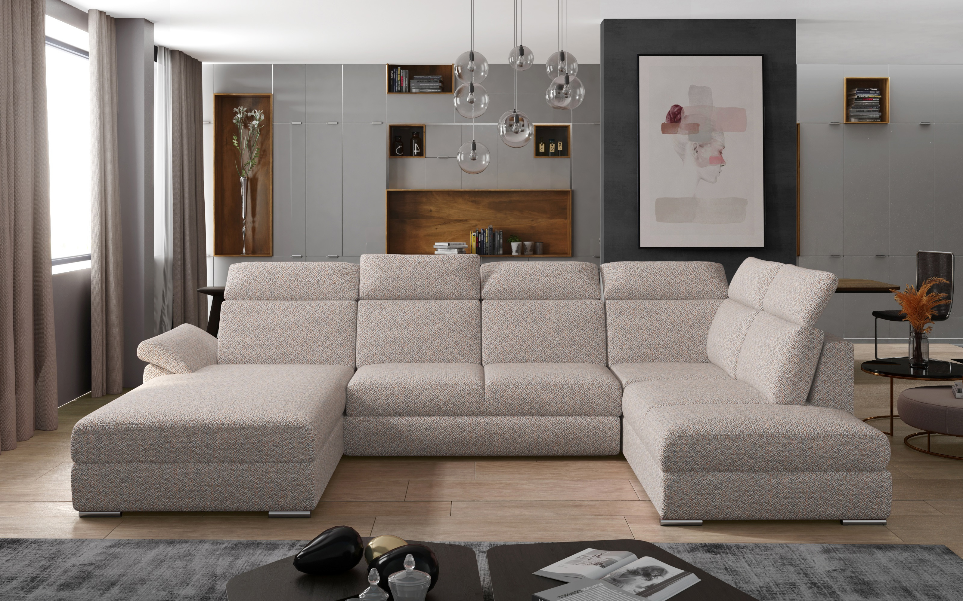 Sedací souprava Evanell v provedení Arte 80A má rám z borovicového dřeva. Sedák má vyrobený z odolných vlnitých pružin a pružné pěny T3030. Rozkladem DL vznikne spací plocha 125x265 cm. Sedací souprava disponuje úložním prostorem, nastavitelnými opěrkami hlavy a šikmou loketní opěrkou. Nosnost pohovky 450 kg. Nohy jsou stříbrné plastové o výšce 4,5 cm. Provedení rohu levé. Zboží je částečně smontováno.