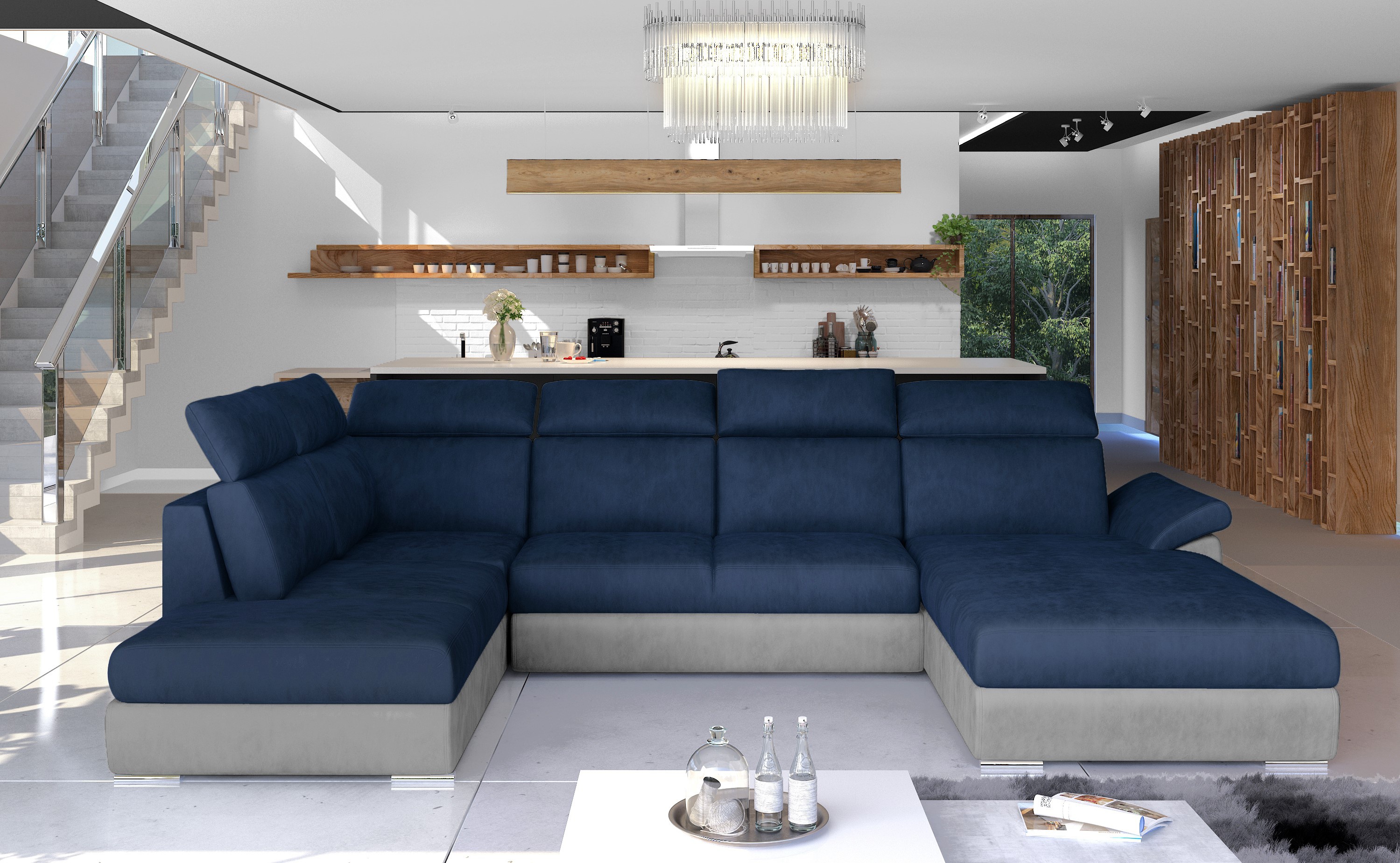 Rozkládací souprava s úložným prostorem v barevném provedení modrá/šedá. Spací plocha 125x265 cm. Výplň sedáků je vyrobena z vlnité pružiny a pěny T30 - tato kombinace zajišťuje měkkost, pružnost a dostatečnou oporu během odpočinku. Díky vhodně profilovaným, vysokým opěradlům se šesti nastavitelnými opěrkami hlavy může uživatel volně přizpůsobit nábytek svým vlastním preferencím. Šikmá loketní opěrka umístěná na jedné ze stran rohu může být také použita jako opěrka hlavy při relaxaci v poloze v lehu. Potahová látka jako na hlavní fotografii, provedení pravé. Možnost výběru pravého/levého provedení.