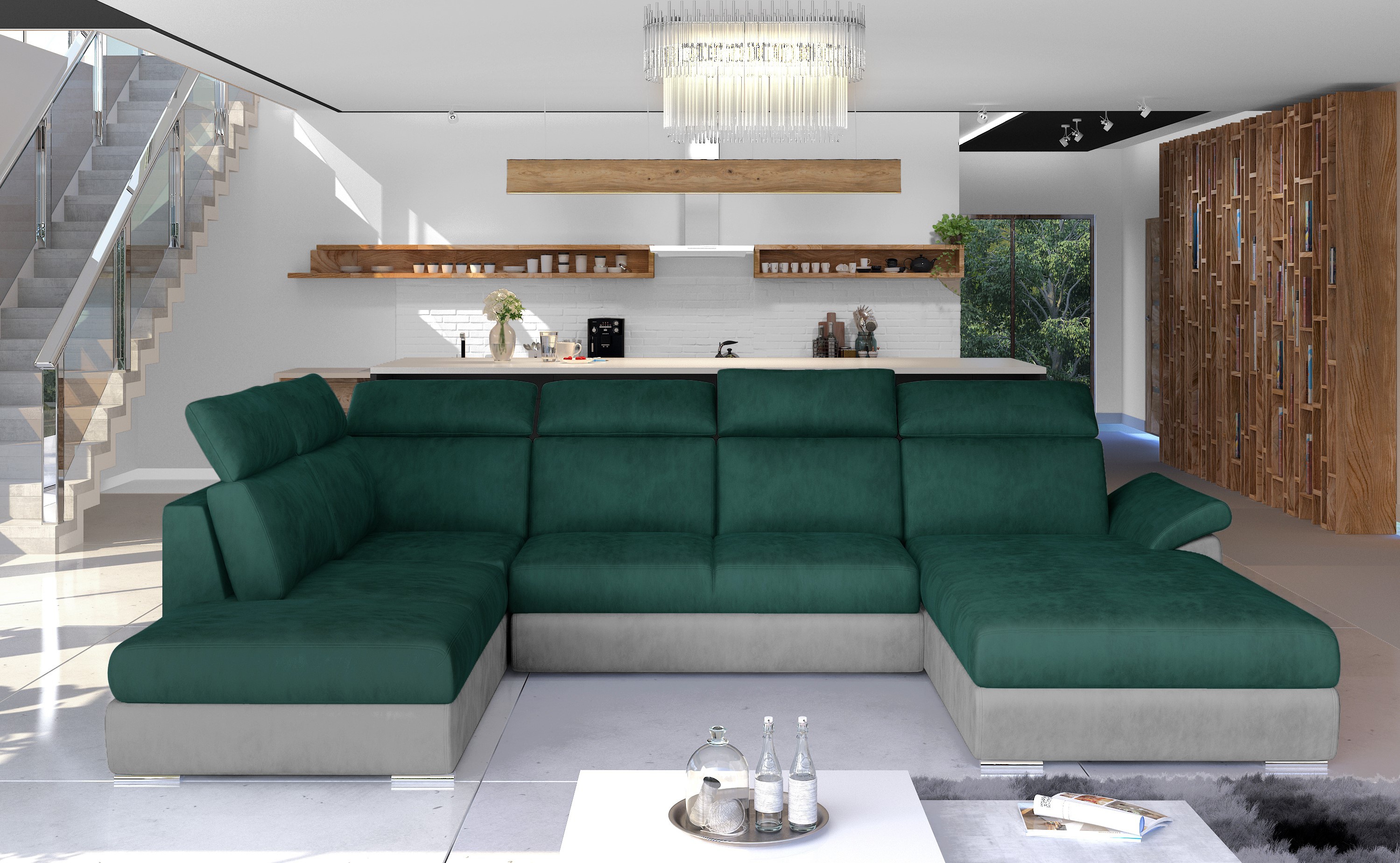 Rozkládací souprava s úložným prostorem v barevném provedení zelená/šedá. Spací plocha 125x265 cm. Výplň sedáků je vyrobena z vlnité pružiny a pěny T30 - tato kombinace zajišťuje měkkost, pružnost a dostatečnou oporu během odpočinku. Díky vhodně profilovaným, vysokým opěradlům se šesti nastavitelnými opěrkami hlavy může uživatel volně přizpůsobit nábytek svým vlastním preferencím. Šikmá loketní opěrka umístěná na jedné ze stran rohu může být také použita jako opěrka hlavy při relaxaci v poloze v lehu. Potahová látka jako na hlavní fotografii, provedení pravé. Možnost výběru pravého/levého provedení.