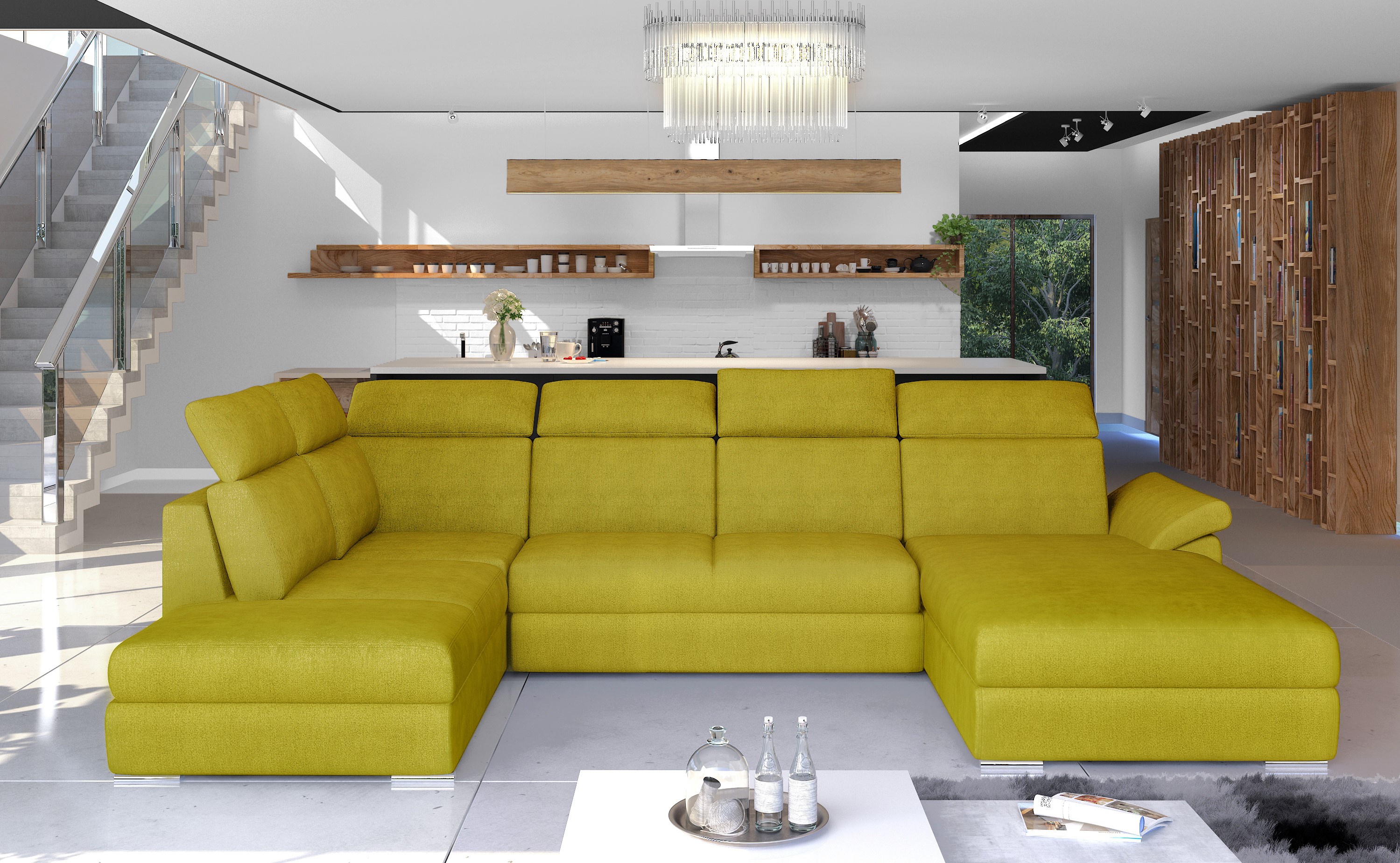 Rozkládací souprava s úložným prostorem v barevném provedení žlutá. Spací plocha 125x265 cm. Výplň sedáků je vyrobena z vlnité pružiny a pěny T30 - tato kombinace zajišťuje měkkost, pružnost a dostatečnou oporu během odpočinku. Díky vhodně profilovaným, vysokým opěradlům se šesti nastavitelnými opěrkami hlavy může uživatel volně přizpůsobit nábytek svým vlastním preferencím. Šikmá loketní opěrka umístěná na jedné ze stran rohu může být také použita jako opěrka hlavy při relaxaci v poloze v lehu. Potahová látka jako na hlavní fotografii, provedení pravé. Možnost výběru pravého/levého provedení.