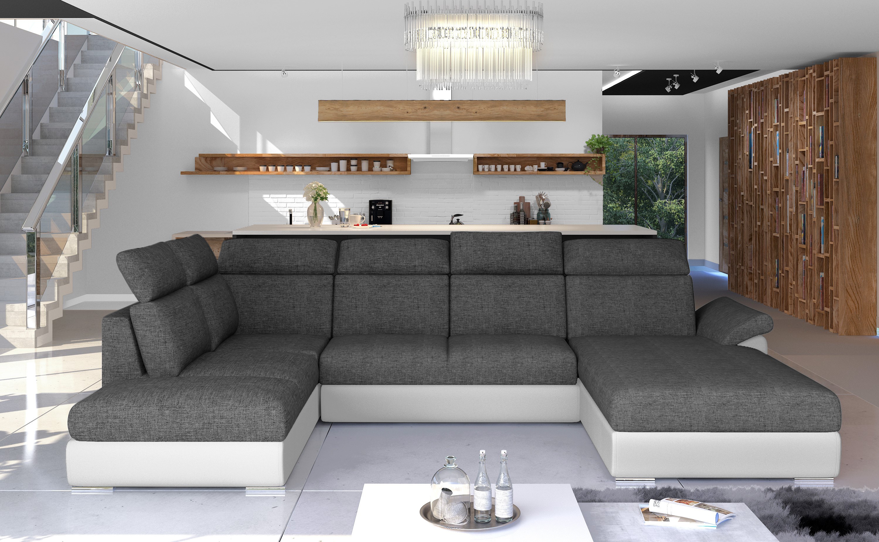 Rozkládací souprava s úložným prostorem v barevném provedení šedá/eko kůže bílá. Spací plocha 125x265 cm. Výplň sedáků je vyrobena z vlnité pružiny a pěny T30 - tato kombinace zajišťuje měkkost, pružnost a dostatečnou oporu během odpočinku. Díky vhodně profilovaným, vysokým opěradlům se šesti nastavitelnými opěrkami hlavy může uživatel volně přizpůsobit nábytek svým vlastním preferencím. Šikmá loketní opěrka umístěná na jedné ze stran rohu může být také použita jako opěrka hlavy při relaxaci v poloze v lehu. Potahová látka jako na hlavní fotografii, provedení pravé. Možnost výběru pravého/levého provedení.