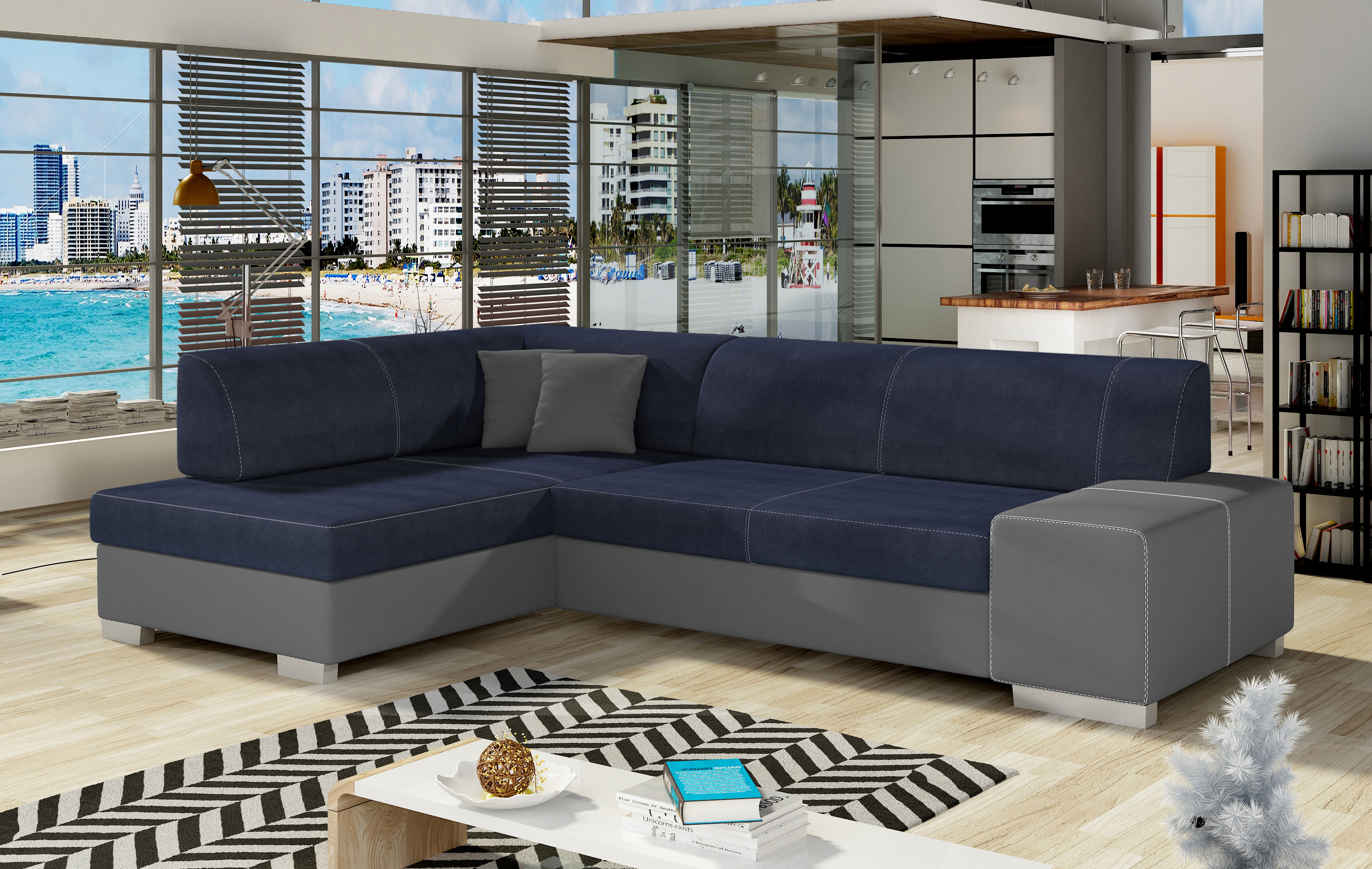 Sedací souprava Fabio v provedení Ontario 81 / eko kůže Soft 29 má rám z borovicového dřeva. Sedadlo je vyplněno vlnitou pružinou a vysoce kvalitní elastickou pěnou T30. Pomocí mechanismu DL vznikne spací plocha o rozměru 195x125 cm. Nožky jsou plastové stříbrné o výšce 8 cm. Disponuje úložným prostorem. Nosnost soupravy 315 kg. Provedení rohu levé. Dekorační polštáře jsou součástí. Zboží je částečně smontováno.