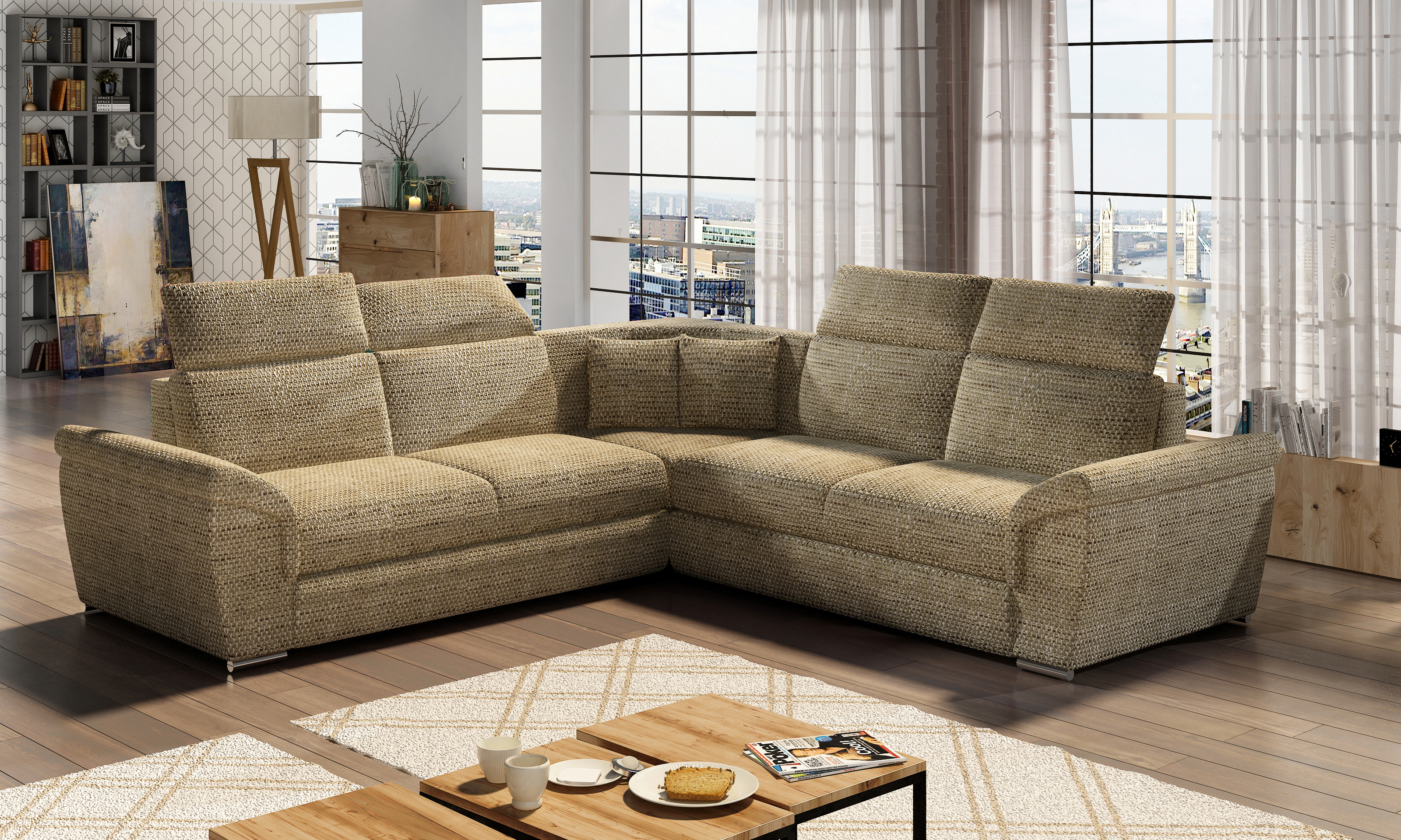 Sedací souprava v barevném provedení látka Berlín 03 má sedák vyroben z vlnité pružiny a pěny T3040 - taková kombinace poskytuje měkkost, pružnost a přiměřenou oporu. Zajímavostí jsou široké, sklopné područky, čtyři nastavitelné opěrky hlavy a plochý rohový díl. Rozkladem vznikne spací plocha o rozměru 120x200 cm. Samozřejmostí je úložný prostor. Potahová látka jako na hlavní fotografii.
