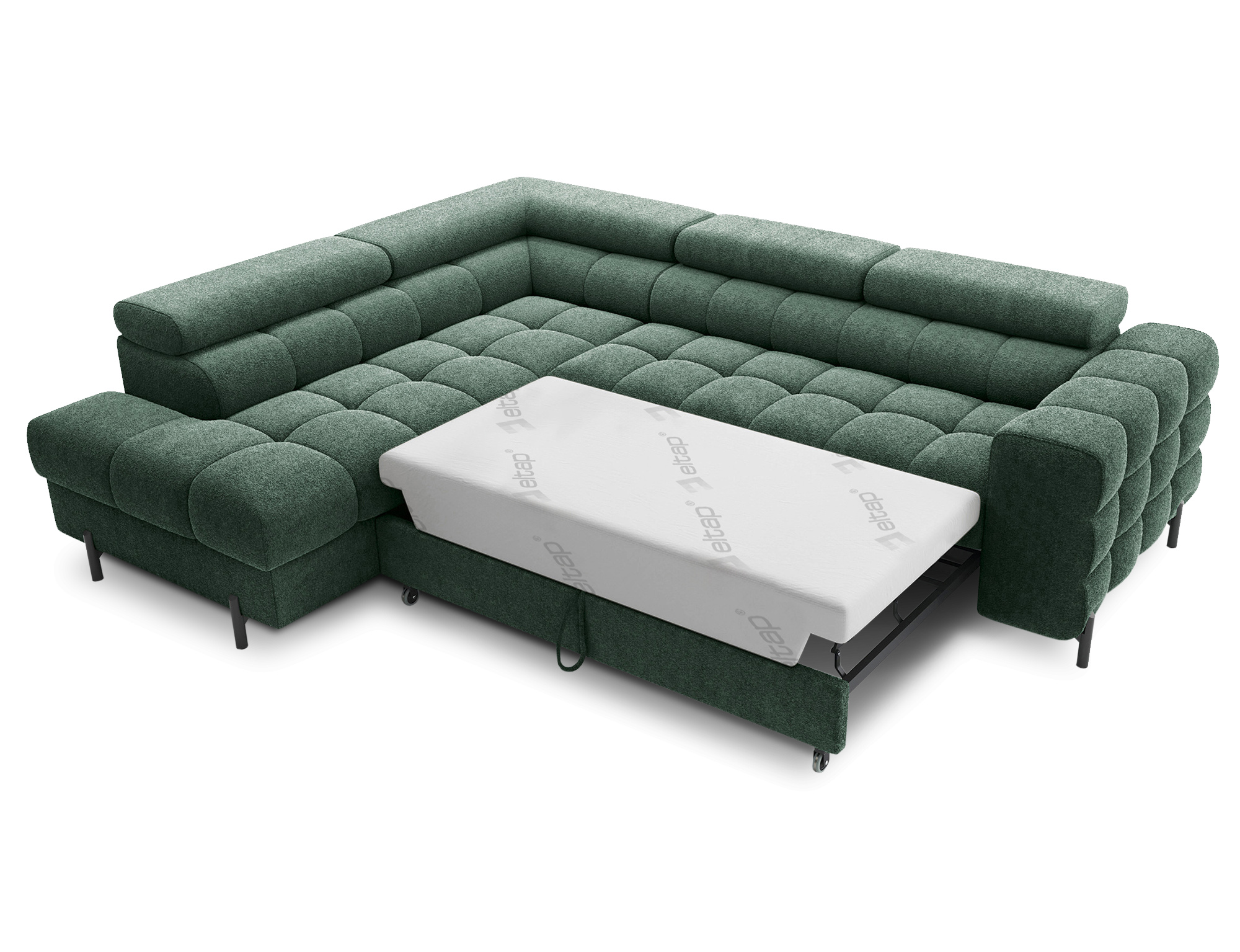 Sedací souprava Ferucce v barevném provedení Amore 35 má sedák vyplněný vlnovou pružinou typu B a pěnou T3030+HR3030( profilová). Opěradlo má výplň polyuretanovou pěnou T 2130. Rozkladem vznikne spací plocha 123x193 cm. Samozřejmostí je úložný prostor. Nohy jsou černé kovové o výšce 9 cm.. Nosnost sedací soupravy je 315 kg. Potahová látka jako na hlavní fotografii, provedení levé.