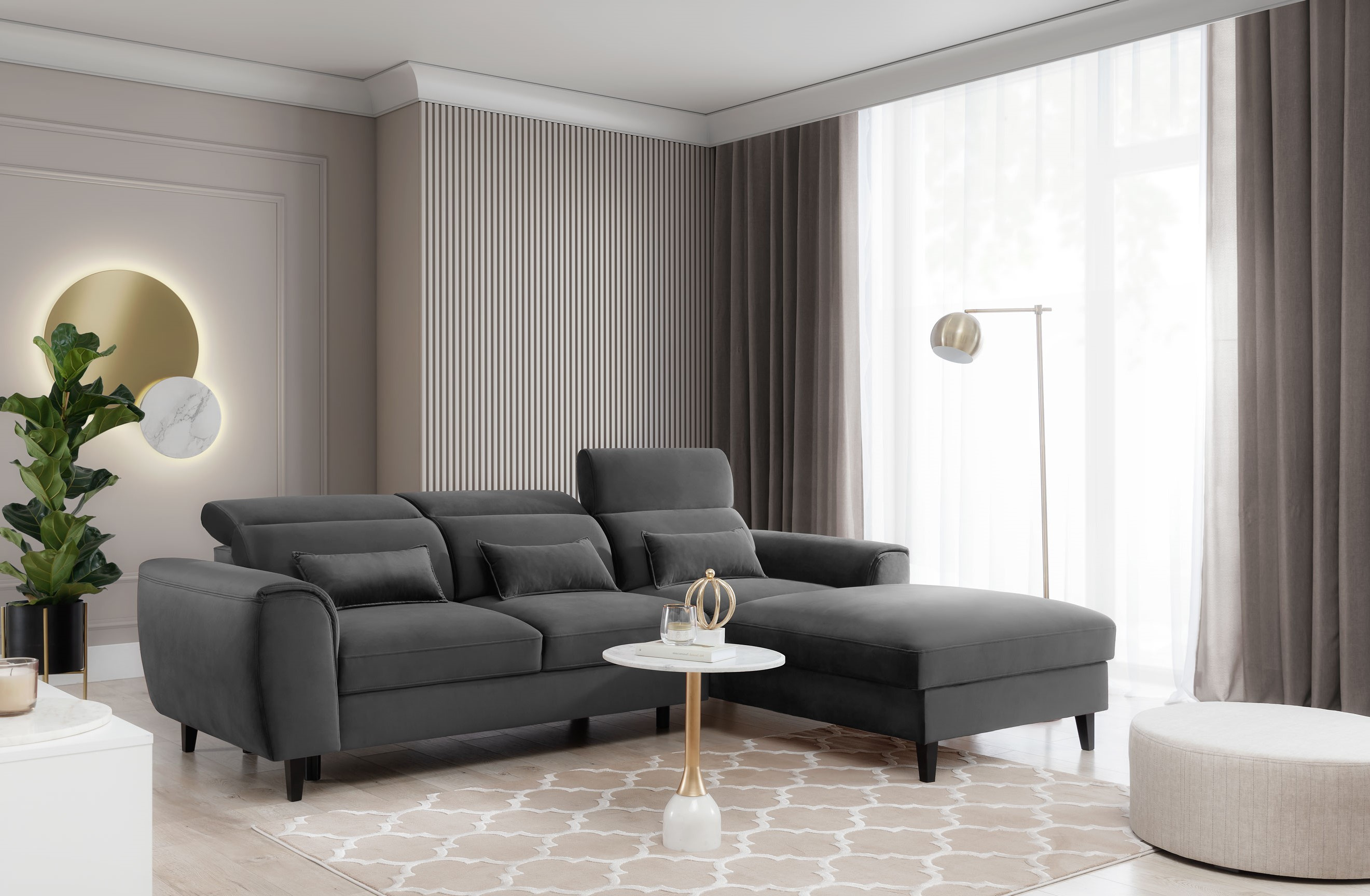 Sedací souprava Foble v provedení Nube 5 má rám z borovicového dřeva. Sedadlo je vyplněno vysoce pružnou pěnu HR, elastickým pásem, pěnou T2130 a vlnitými pružinami typu B. Tři dekorativní polštáře jsou nabízené ve standardní verzi. Pomocí mechanismu DL vznikne spací plocha o rozměru 240x121 cm. Nožky jsou černé dřevěné o výšce 13 cm. Nosnost soupravy 320kg. Záda jsou čalouněné stejnou látkou a tudíž sedací souprava je vhodná do prostoru. Provedení rohu pravé. Zboží je částečně smontováno.