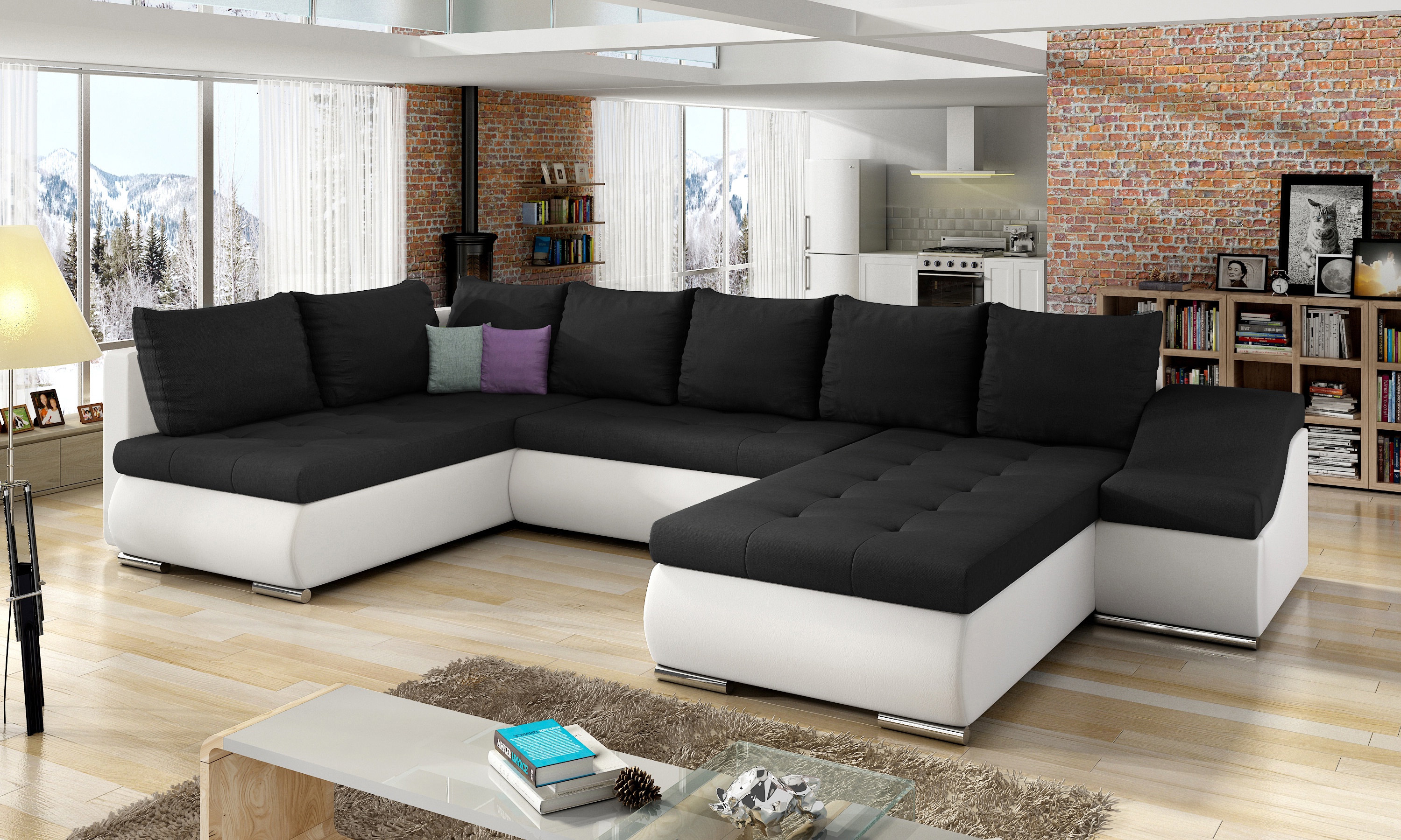 Moderní čalouněná sedací souprava Giovanni v dezénu látka černá/ eko kůže bílá. Giovanni je velká, prostorná sedací souprava do tvaru U. Kostra sedací soupravy je vyrobena z kombinace tvrdého a měkkého dřeva. Výplň sedáku a opěrek je z kvalitní polyuretanové PUR pěny T30, která zaručuje maximální pohodlí. Sedačka je rozkládací a disponuje velkým úložným prostorem. Po rozložení se nábytek změní na postel 295x120. Pro zvýšení pohodlí při používání je roh vybaven další funkcí pro spaní. Po rozložení dostane uživatel další kontejner na ložní prádlo. Rohová s.s. Giovanni je zárukou pohodlného odpočinku. Potahová látka jako na hlavní fotografii, provedení pravé.