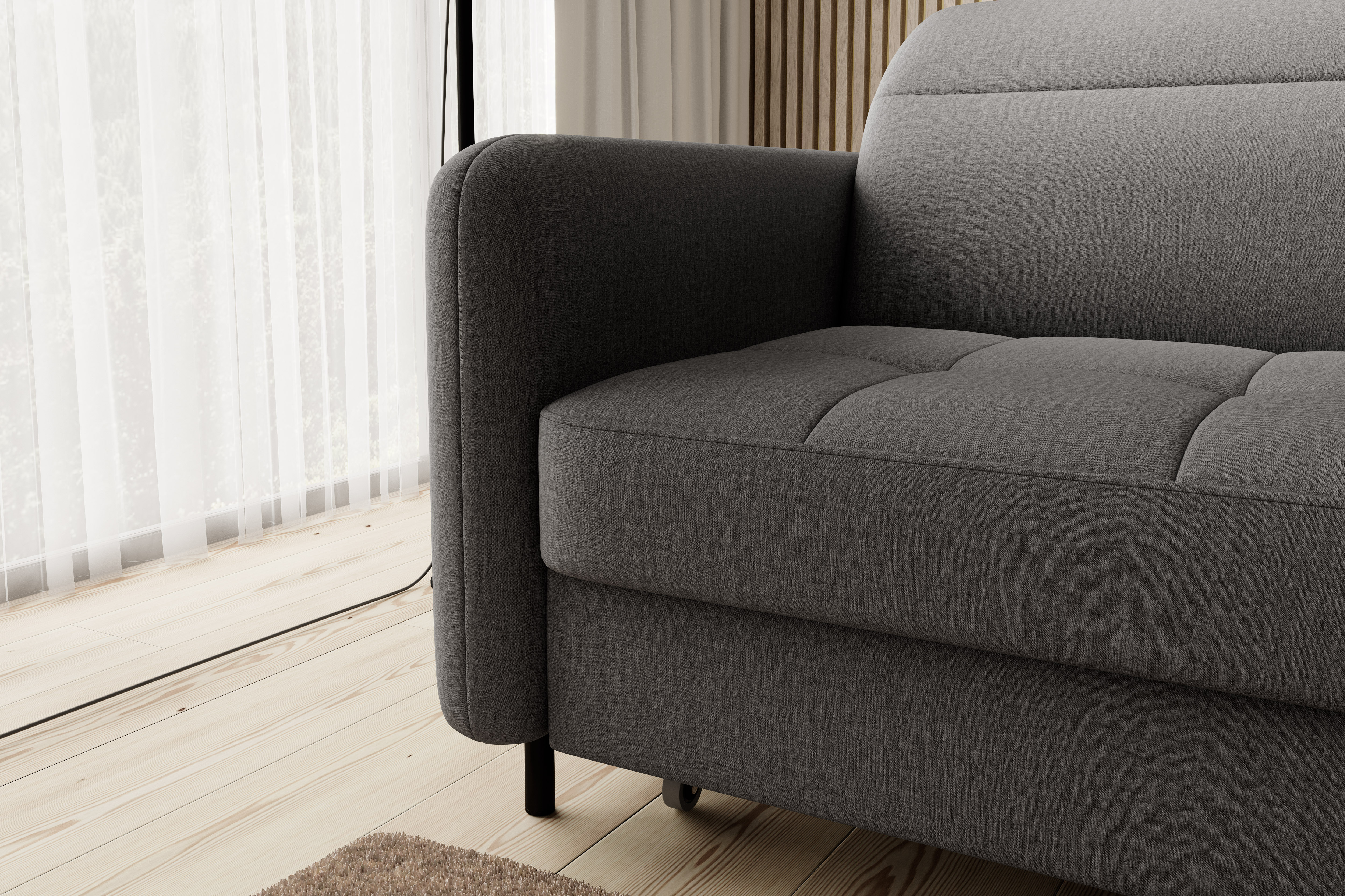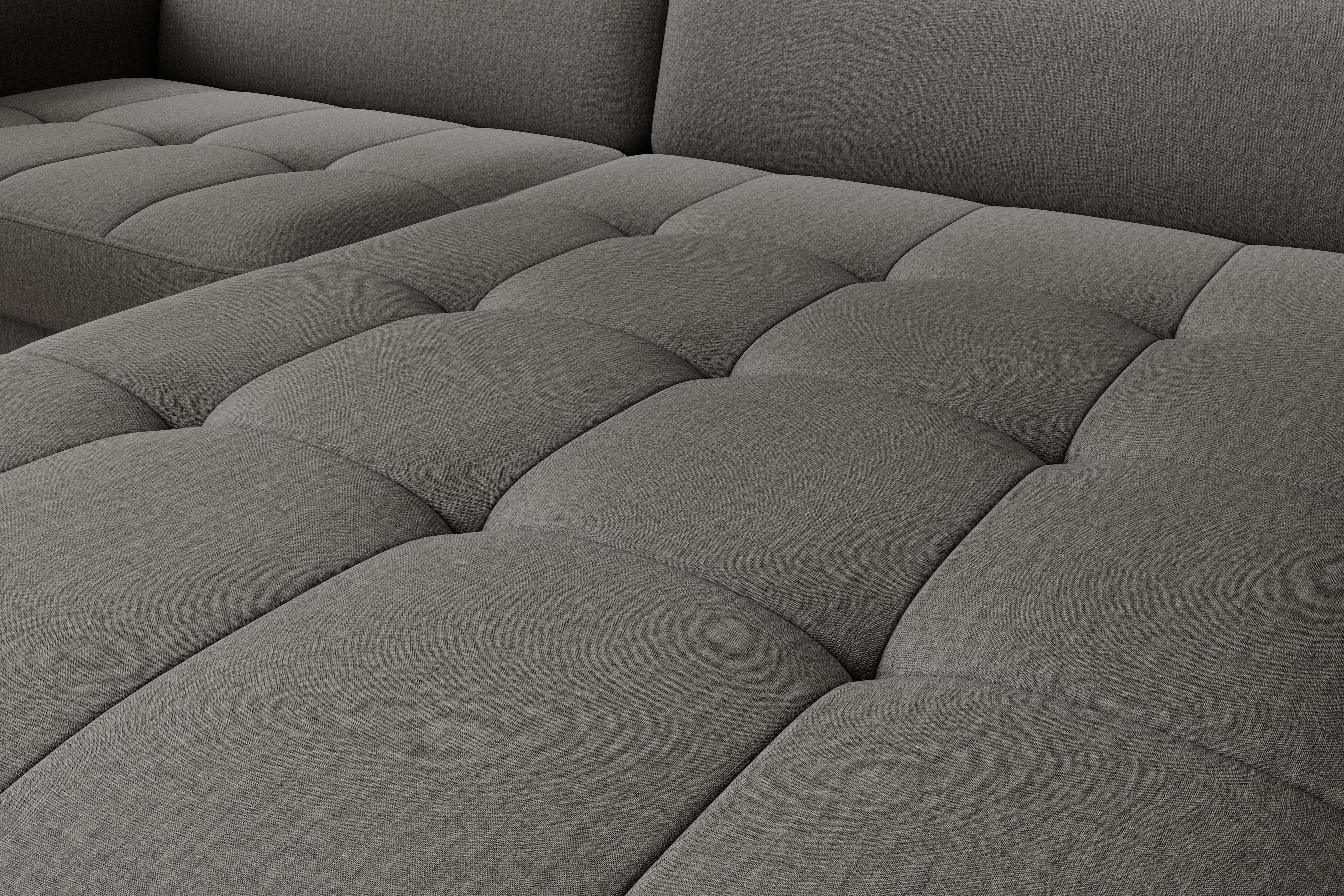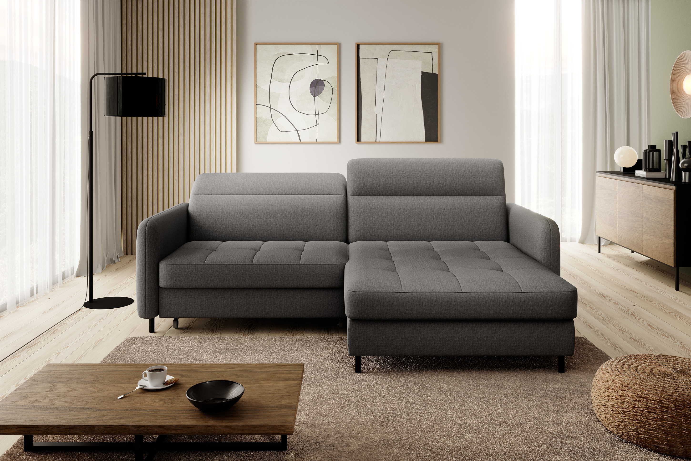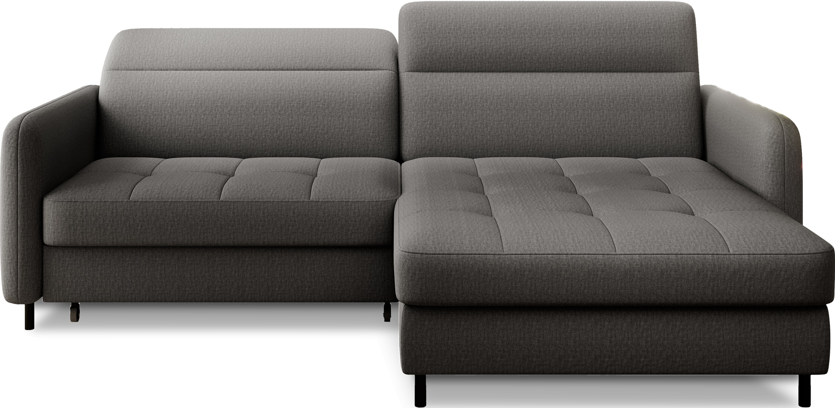 Sedací souprava Gomsi v provedení Manhattan 06 má rám z borovicového dřeva. Sedadlo je vyplněno elastickou HR pěnou a kvalitními vlnitými pružinami typu B. Pomocí mechanismu DL vznikne spací plocha o rozměru 200x128 cm. Nožky jsou černé kovové o výšce 10 cm. Nosnost soupravy 260 kg. Provedení rohu pravé. Zboží je částečně smontováno.