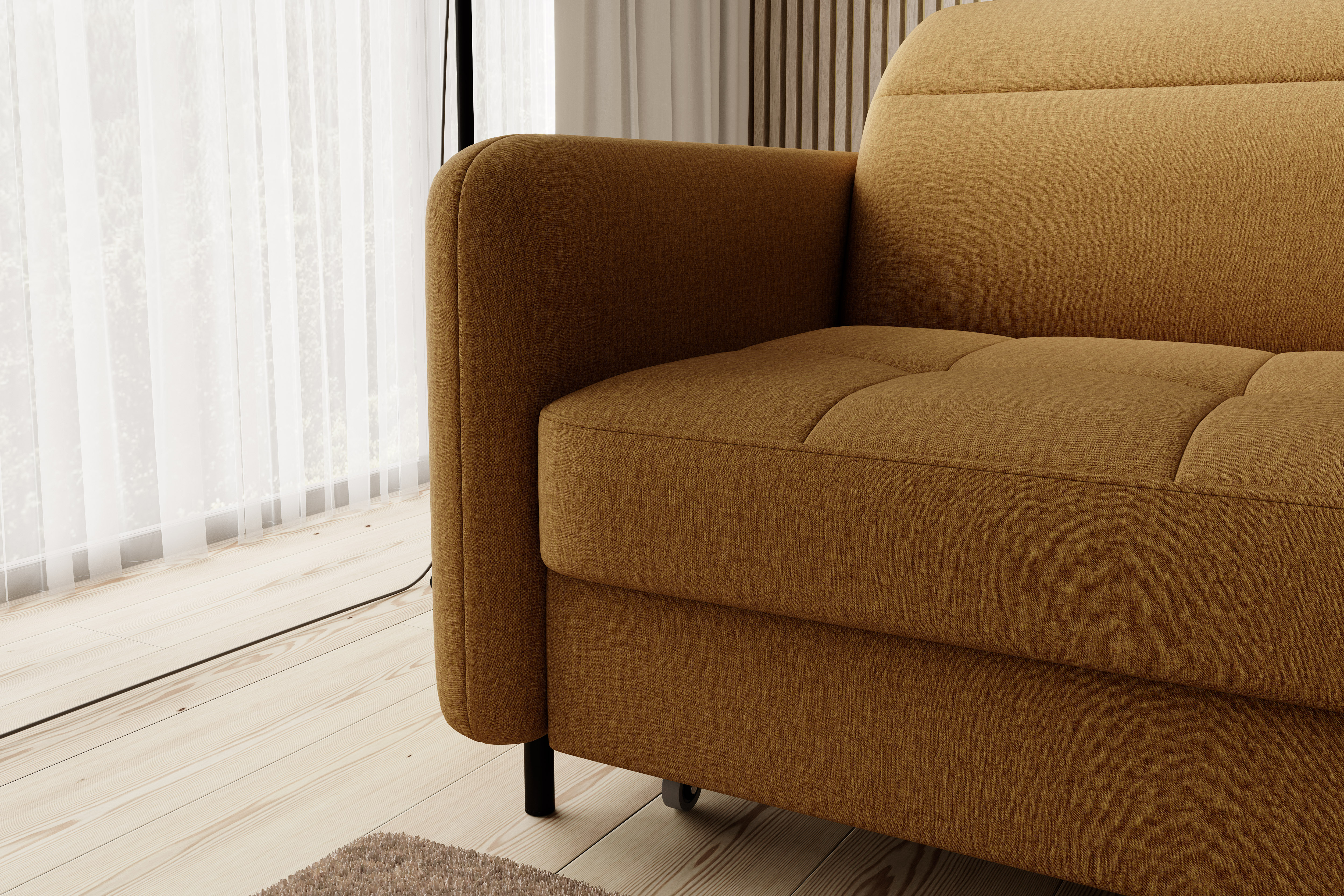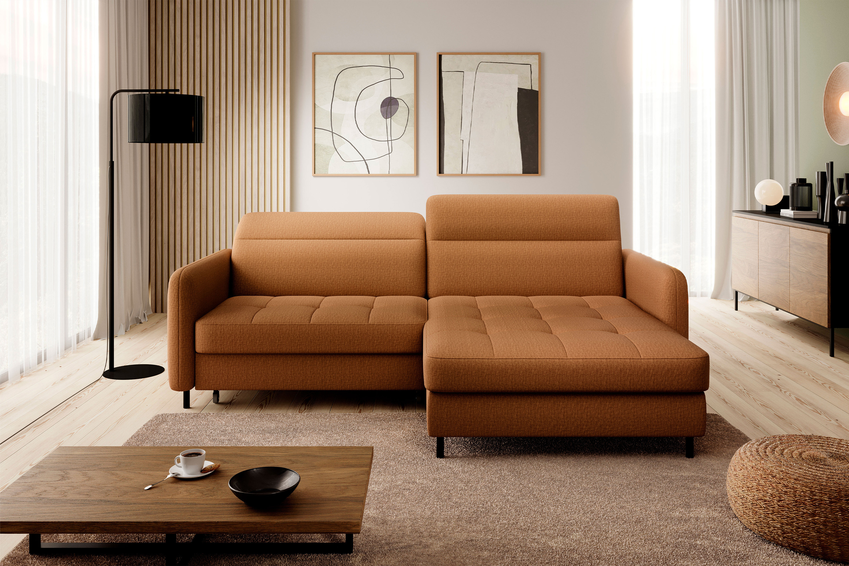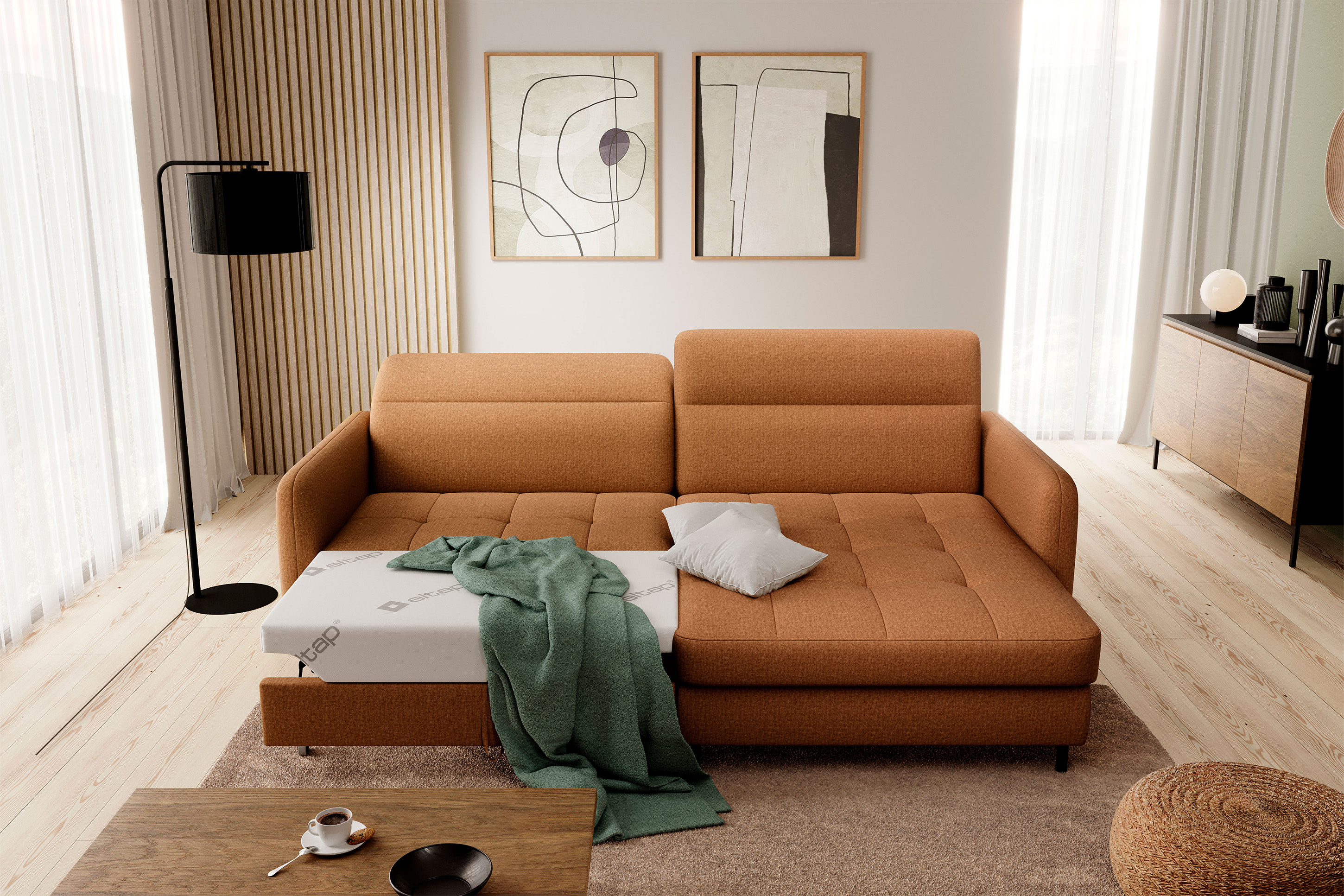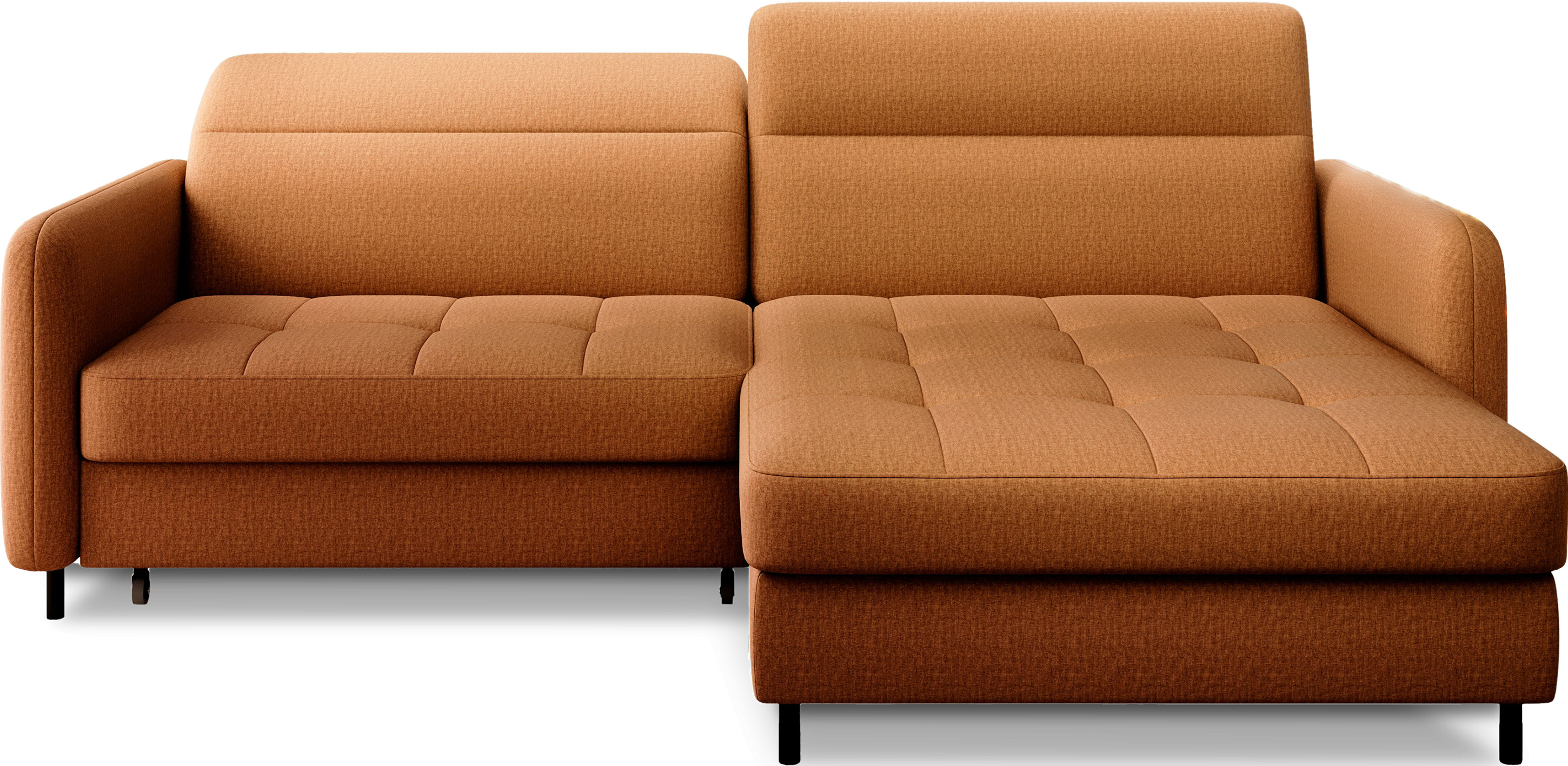 Sedací souprava Gomsi v provedení Manhattan 45 má rám z borovicového dřeva. Sedadlo je vyplněno elastickou HR pěnou a kvalitními vlnitými pružinami typu B. Pomocí mechanismu DL vznikne spací plocha o rozměru 200x128 cm. Nožky jsou černé kovové o výšce 10 cm. Nosnost soupravy 260 kg. Provedení rohu pravé. Zboží je částečně smontováno.