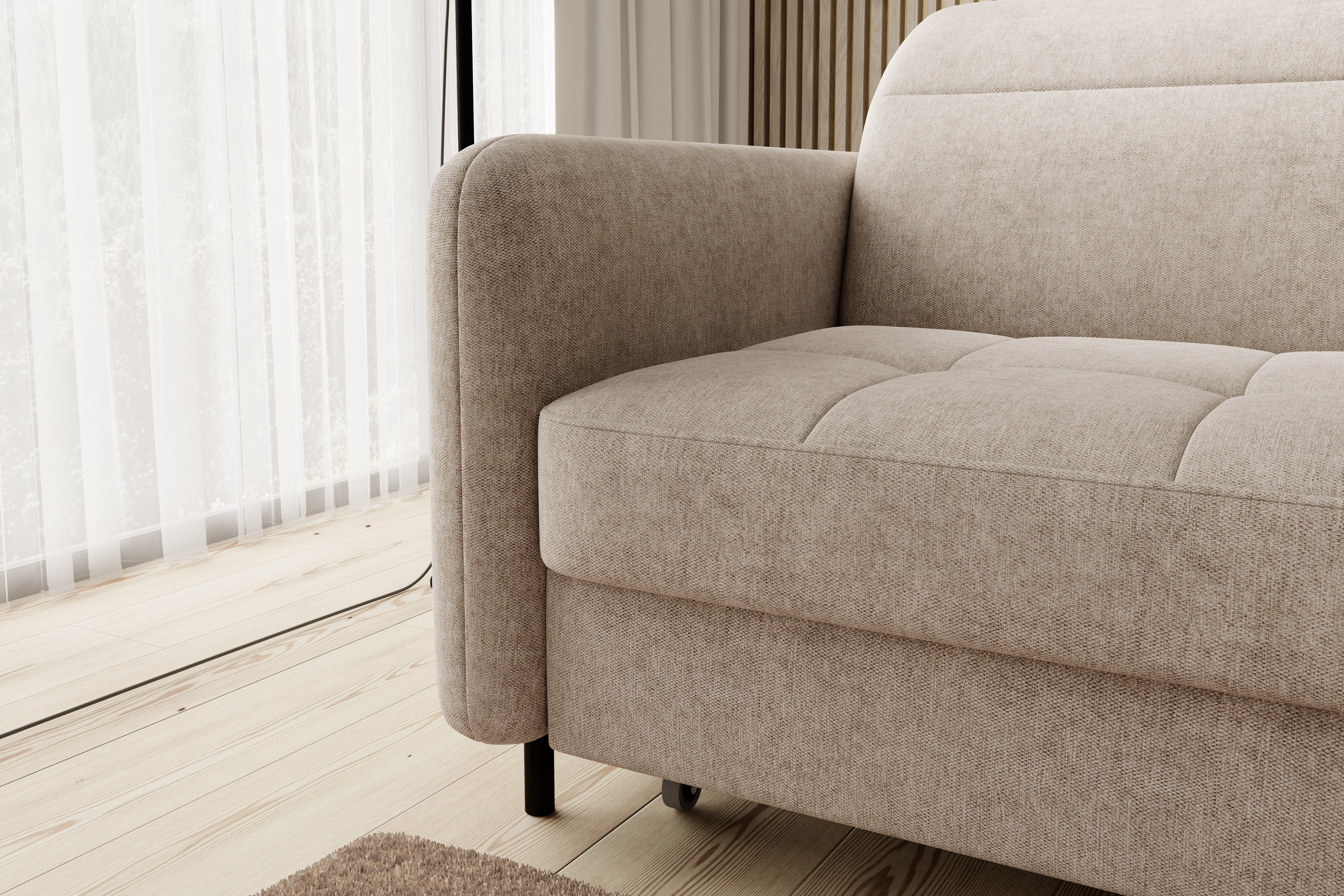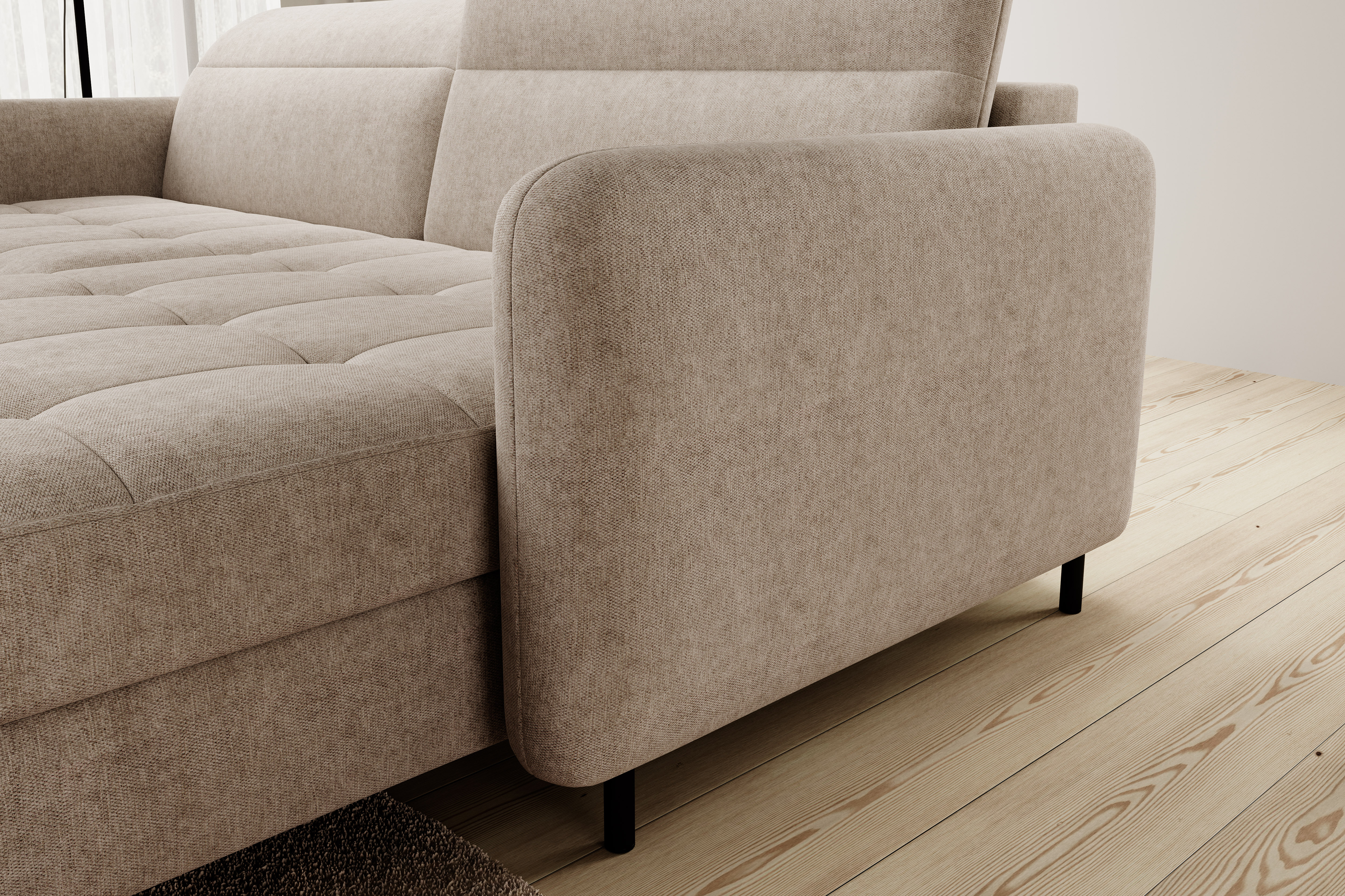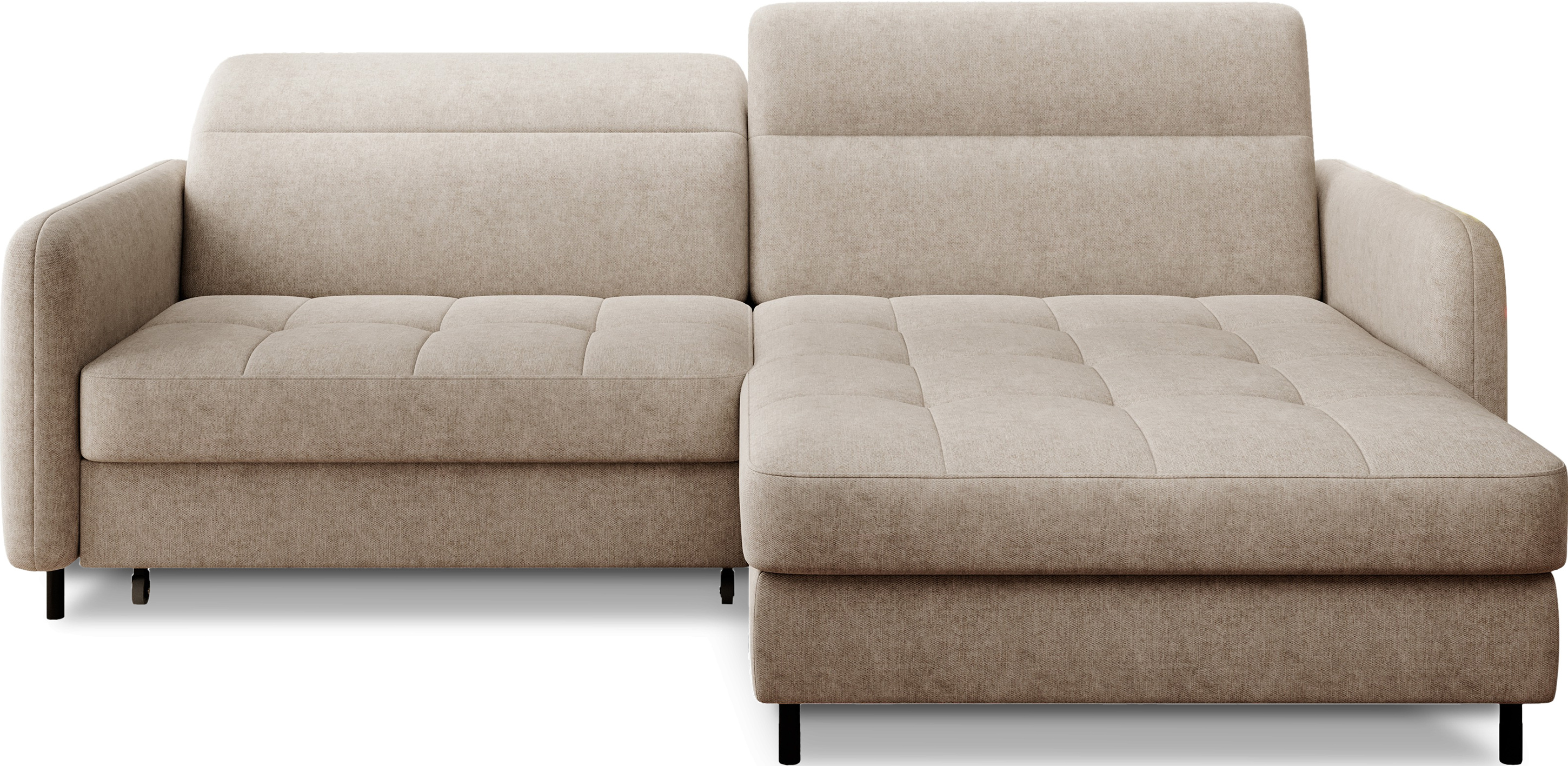 Sedací souprava Gomsi v provedení Raquel 18 má rám z borovicového dřeva. Sedadlo je vyplněno elastickou HR pěnou a kvalitními vlnitými pružinami typu B. Pomocí mechanismu DL vznikne spací plocha o rozměru 200x128 cm. Nožky jsou černé kovové o výšce 10 cm. Nosnost soupravy 260 kg. Provedení rohu pravé. Zboží je částečně smontováno.