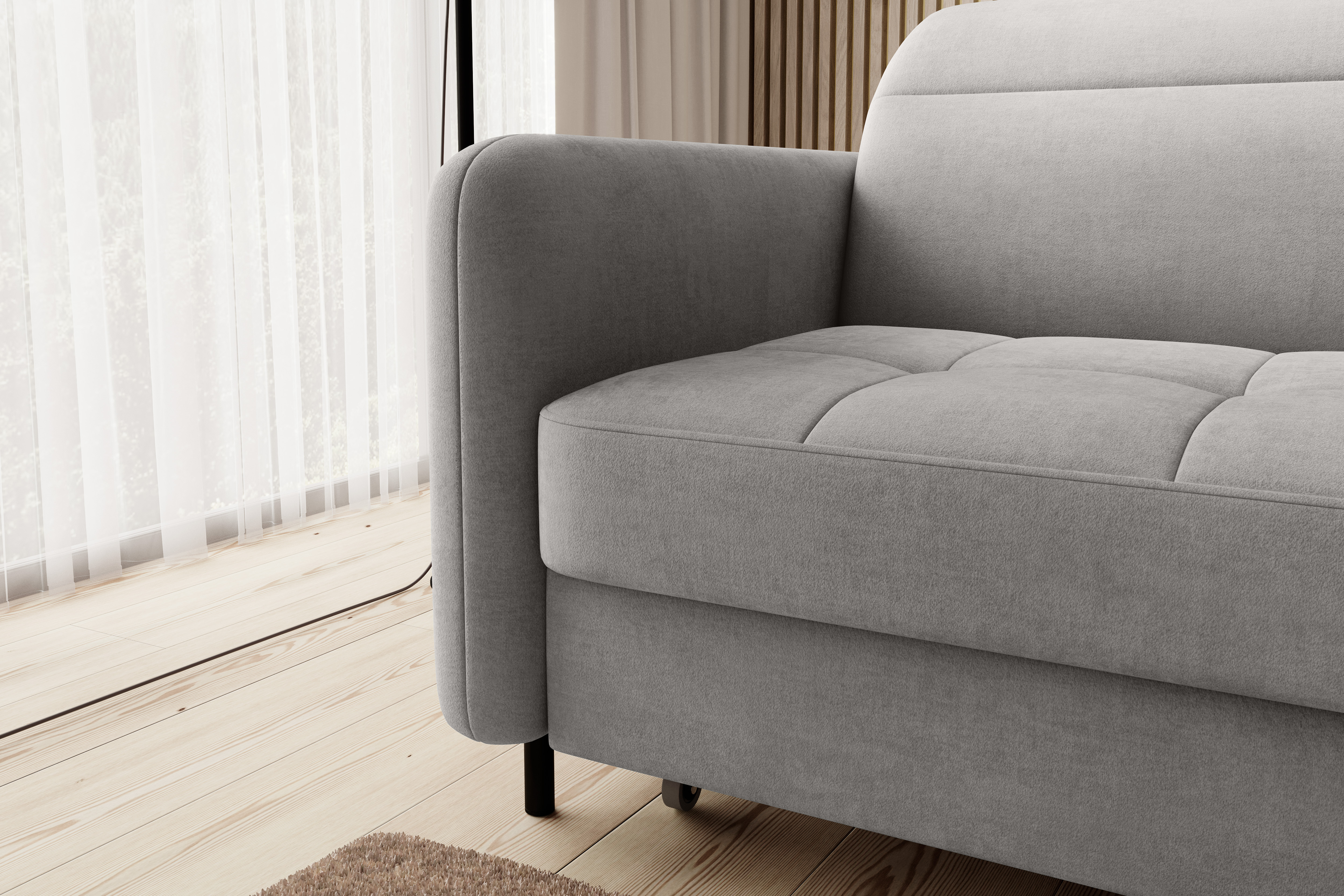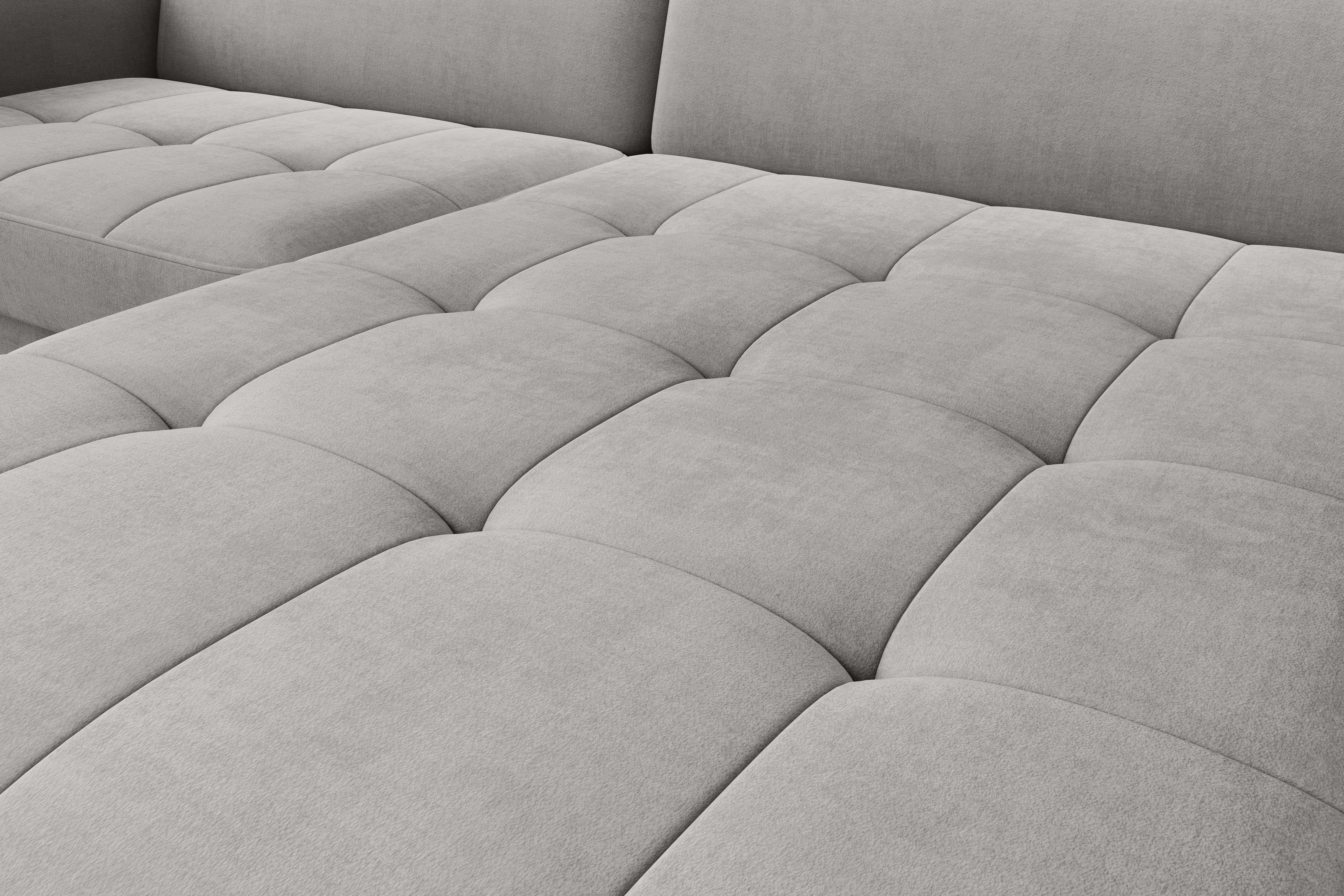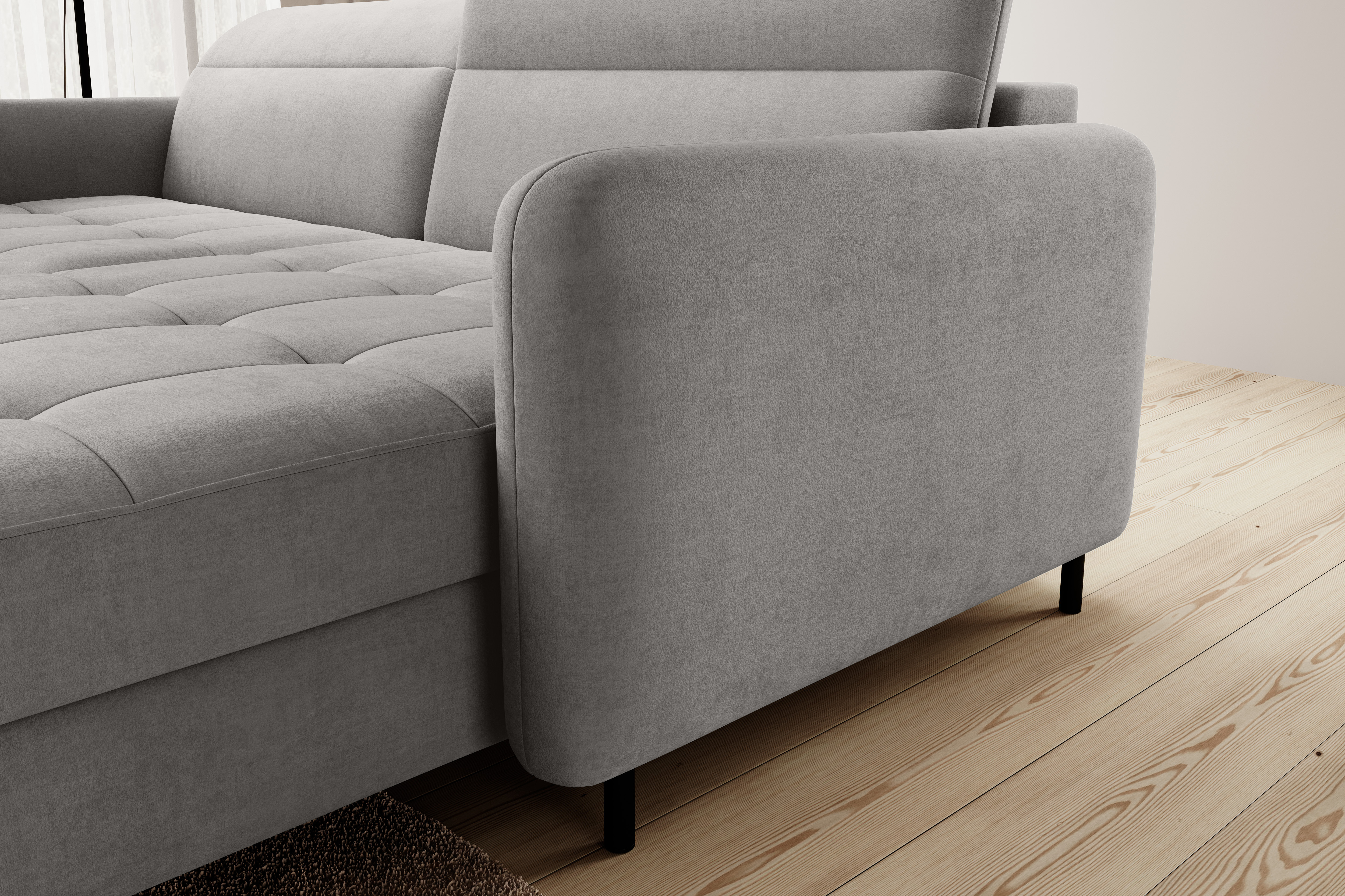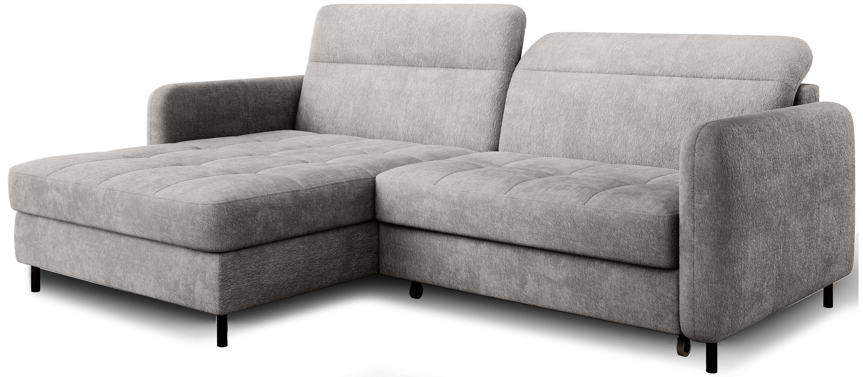 Sedací souprava Gomsi v provedení Touch 03 má rám z borovicového dřeva. Sedadlo je vyplněno elastickou HR pěnou a kvalitními vlnitými pružinami typu B. Pomocí mechanismu DL vznikne spací plocha o rozměru 200x128 cm. Nožky jsou černé kovové o výšce 10 cm. Nosnost soupravy 260 kg. Provedení rohu levé. Zboží je částečně smontováno.
