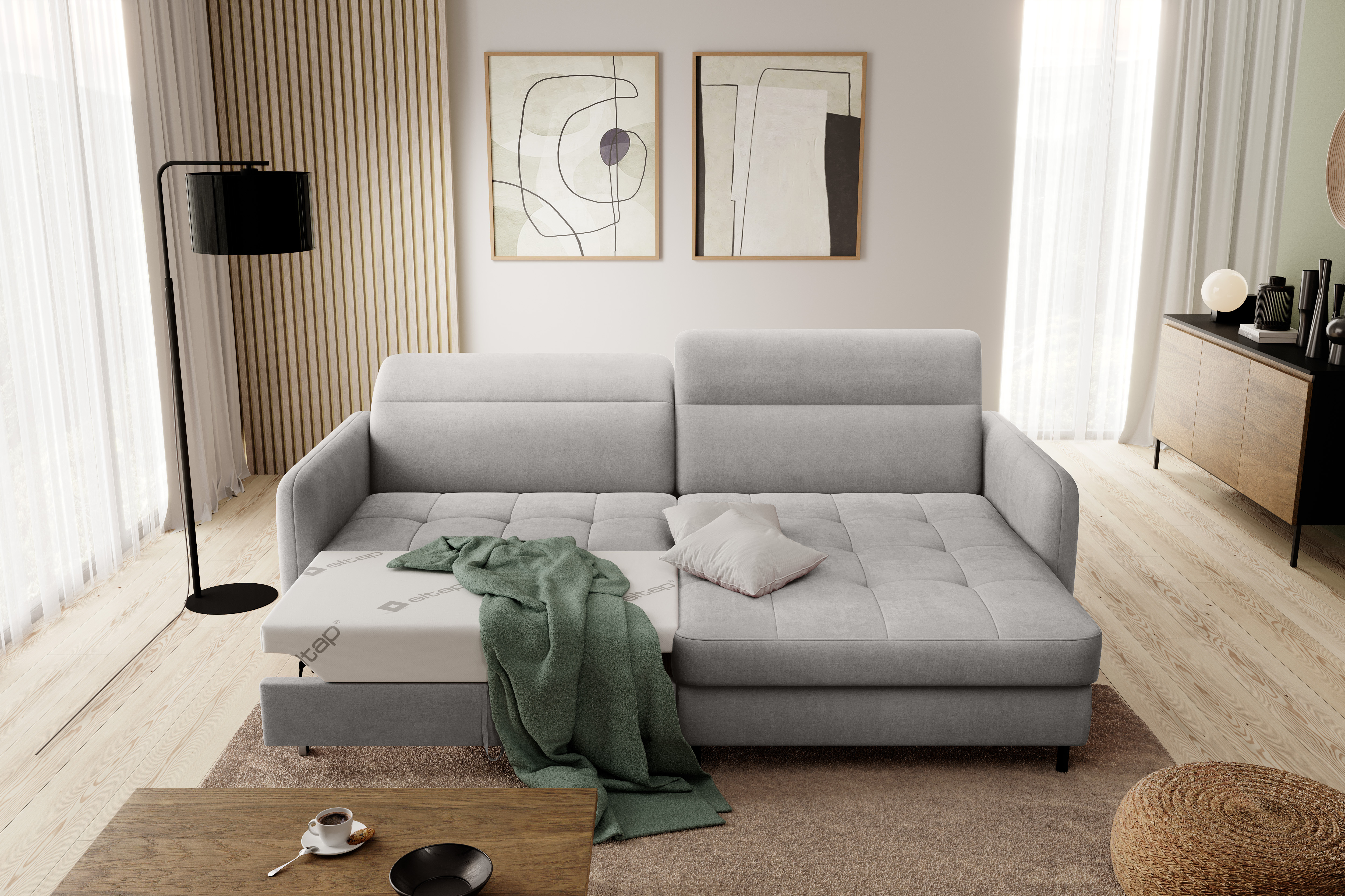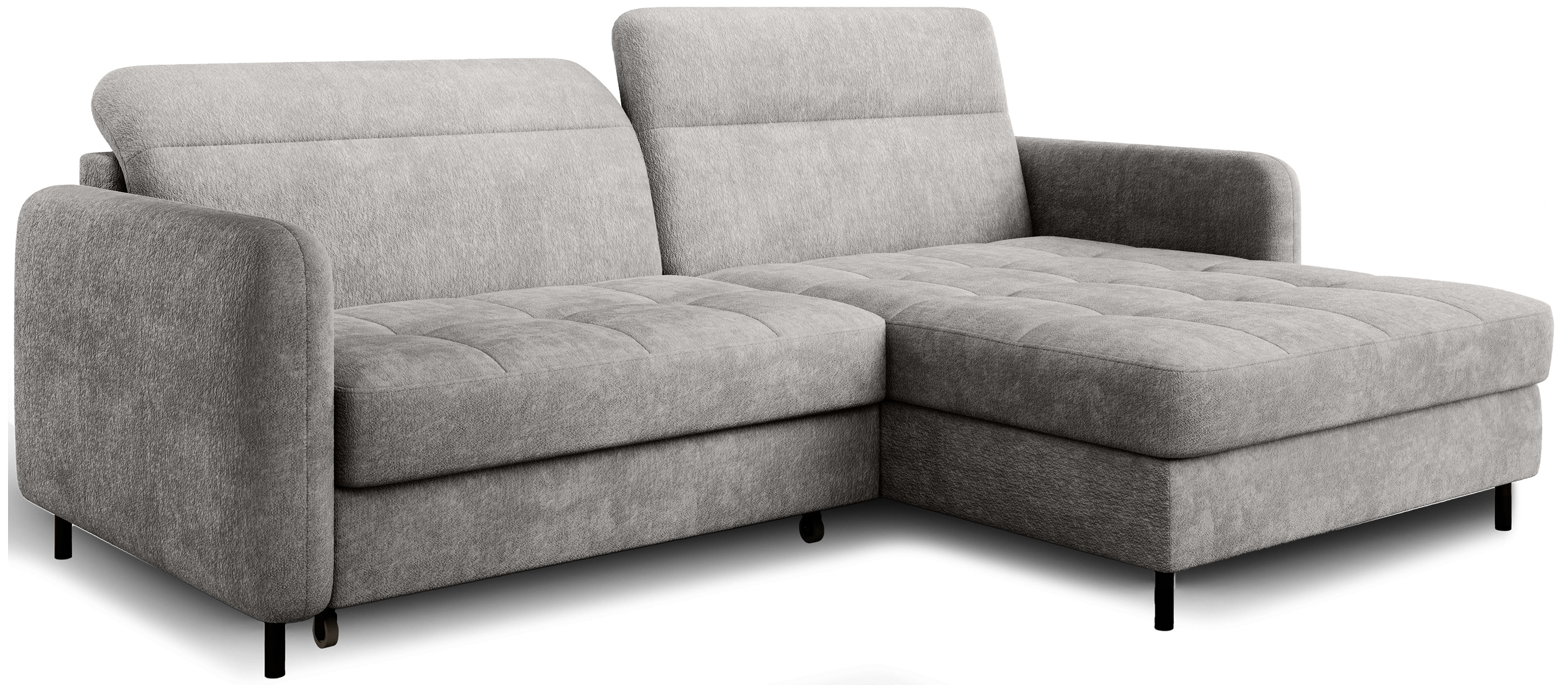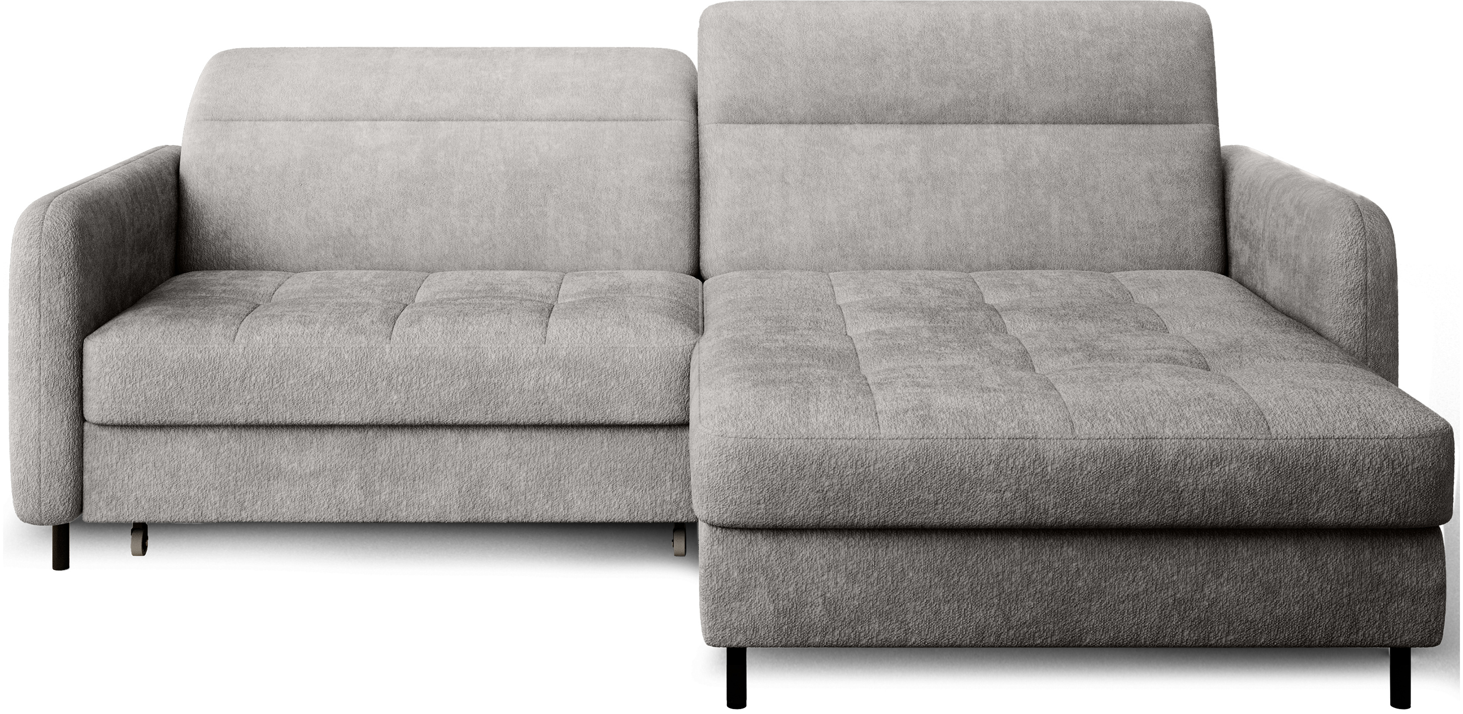 Sedací souprava Gomsi v provedení Touch 03 má rám z borovicového dřeva. Sedadlo je vyplněno elastickou HR pěnou a kvalitními vlnitými pružinami typu B. Pomocí mechanismu DL vznikne spací plocha o rozměru 200x128 cm. Nožky jsou černé kovové o výšce 10 cm. Nosnost soupravy 260 kg. Provedení rohu pravé. Zboží je částečně smontováno.