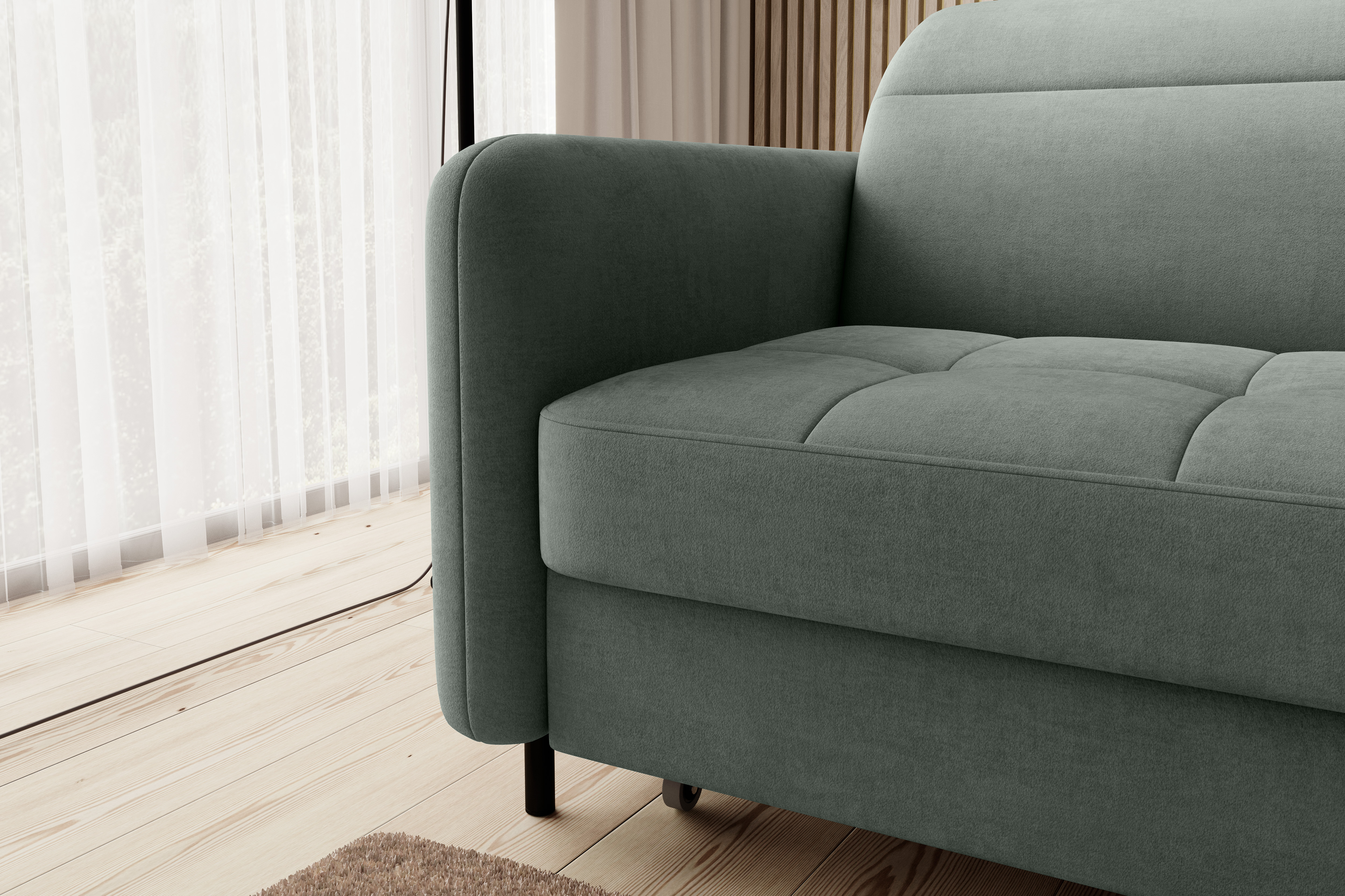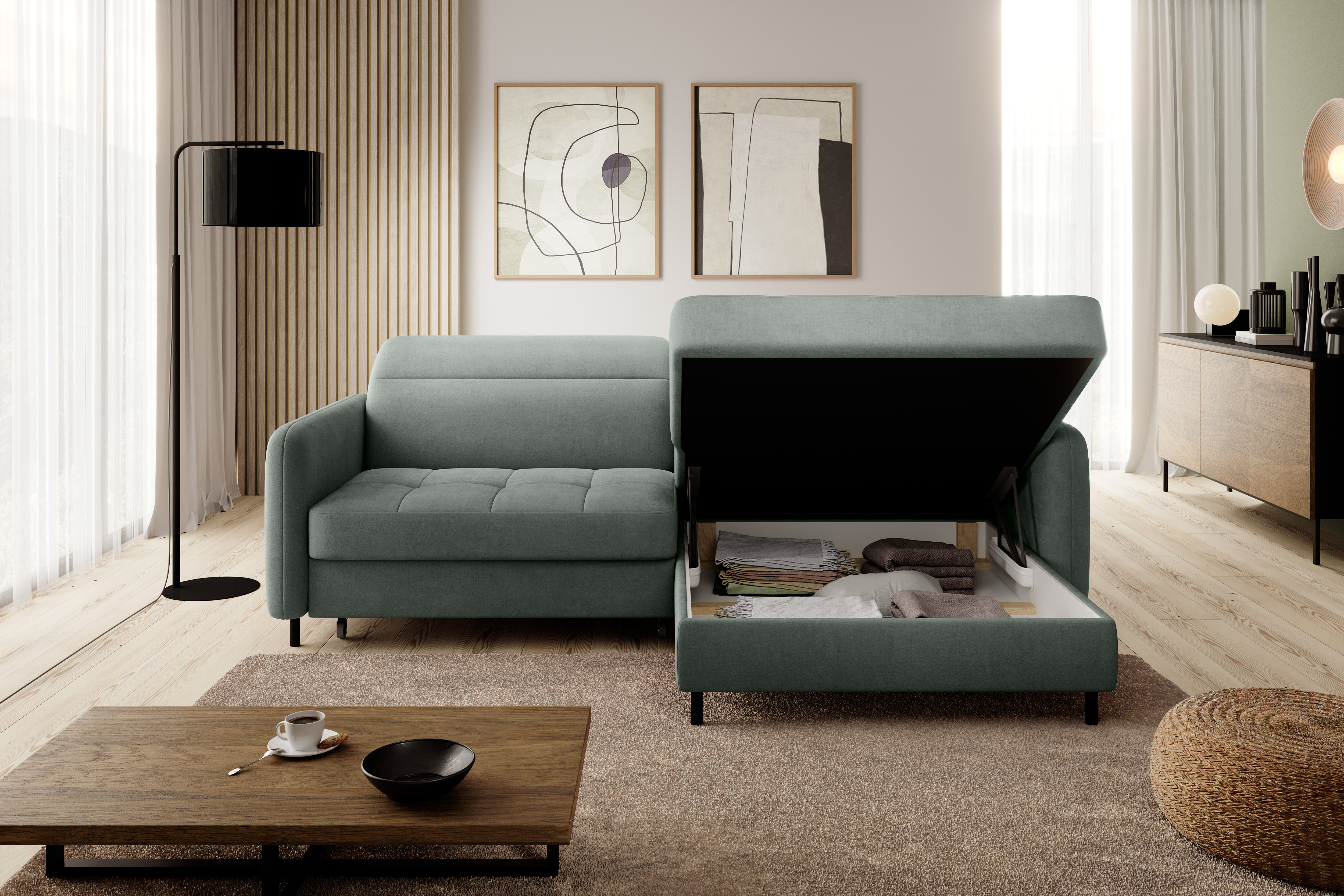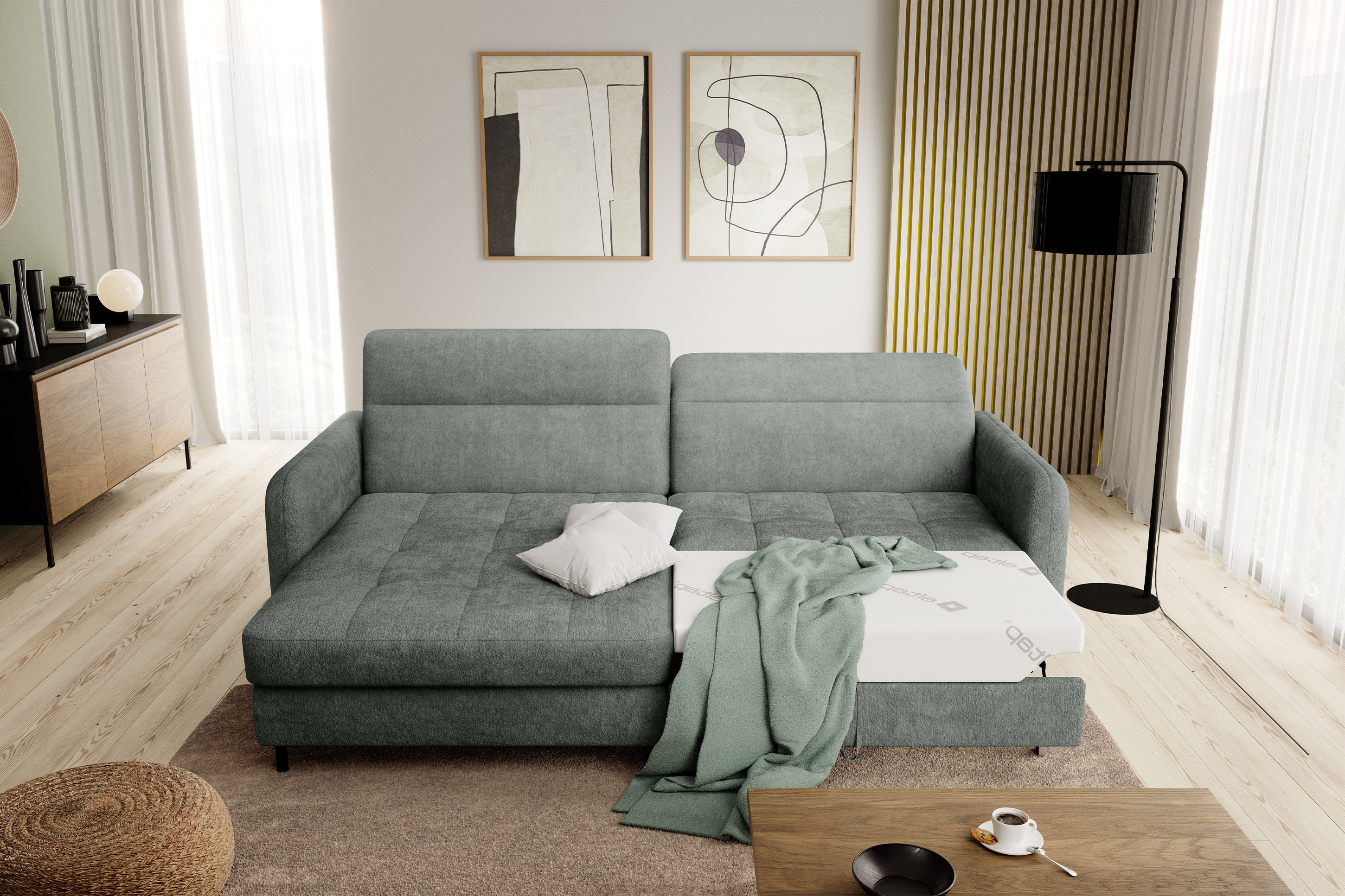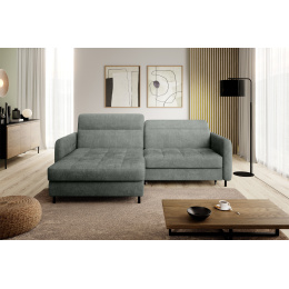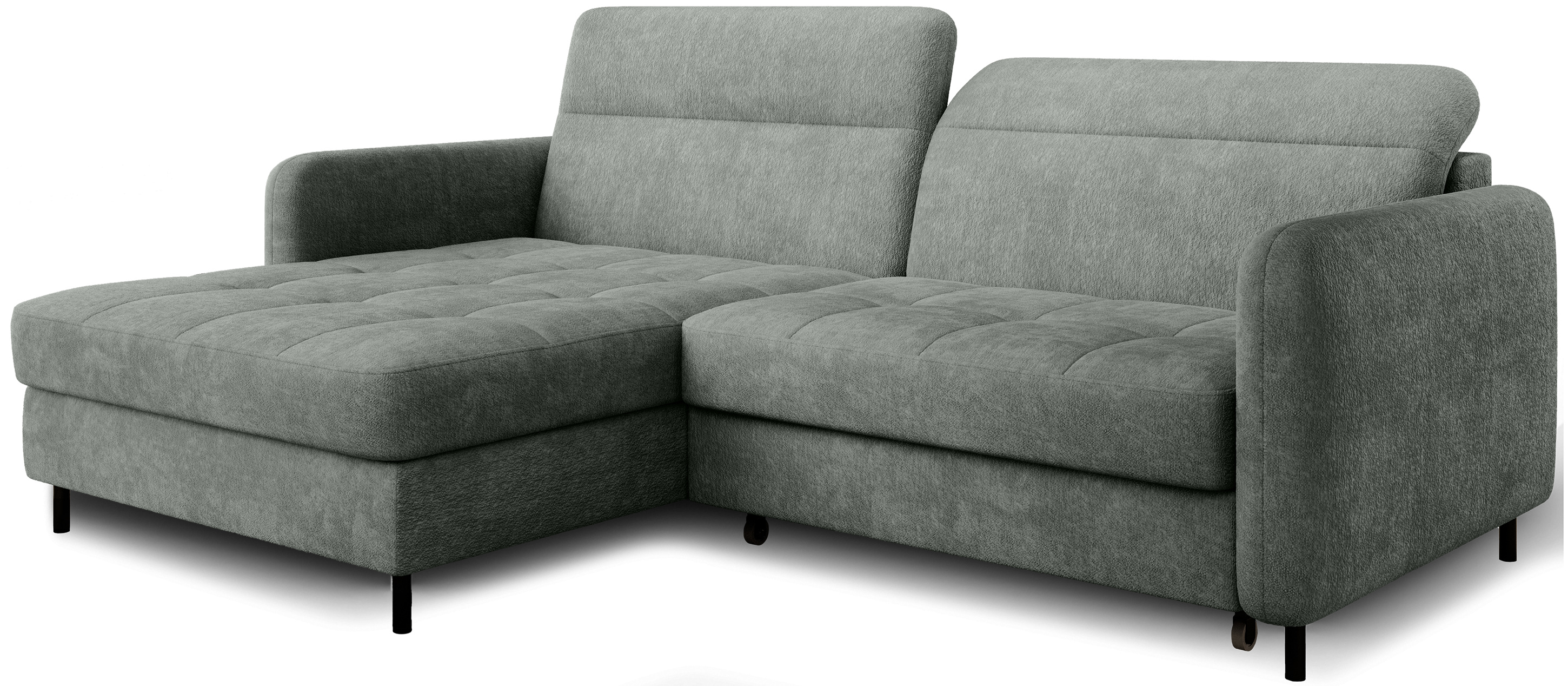 Sedací souprava Gomsi v provedení Touch 100 má rám z borovicového dřeva. Sedadlo je vyplněno elastickou HR pěnou a kvalitními vlnitými pružinami typu B. Pomocí mechanismu DL vznikne spací plocha o rozměru 200x128 cm. Nožky jsou černé kovové o výšce 10 cm. Nosnost soupravy 260 kg. Provedení rohu levé. Zboží je částečně smontováno.