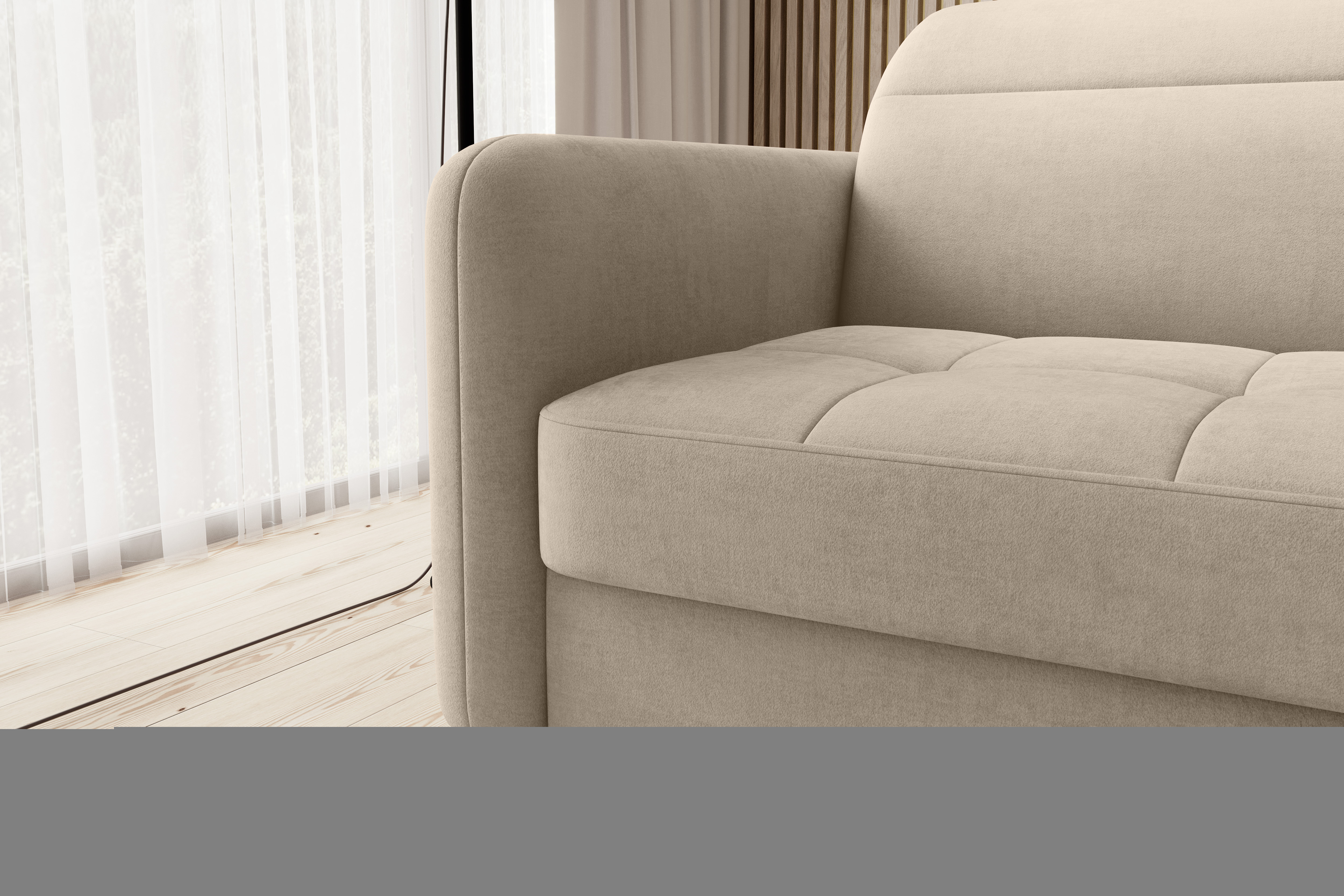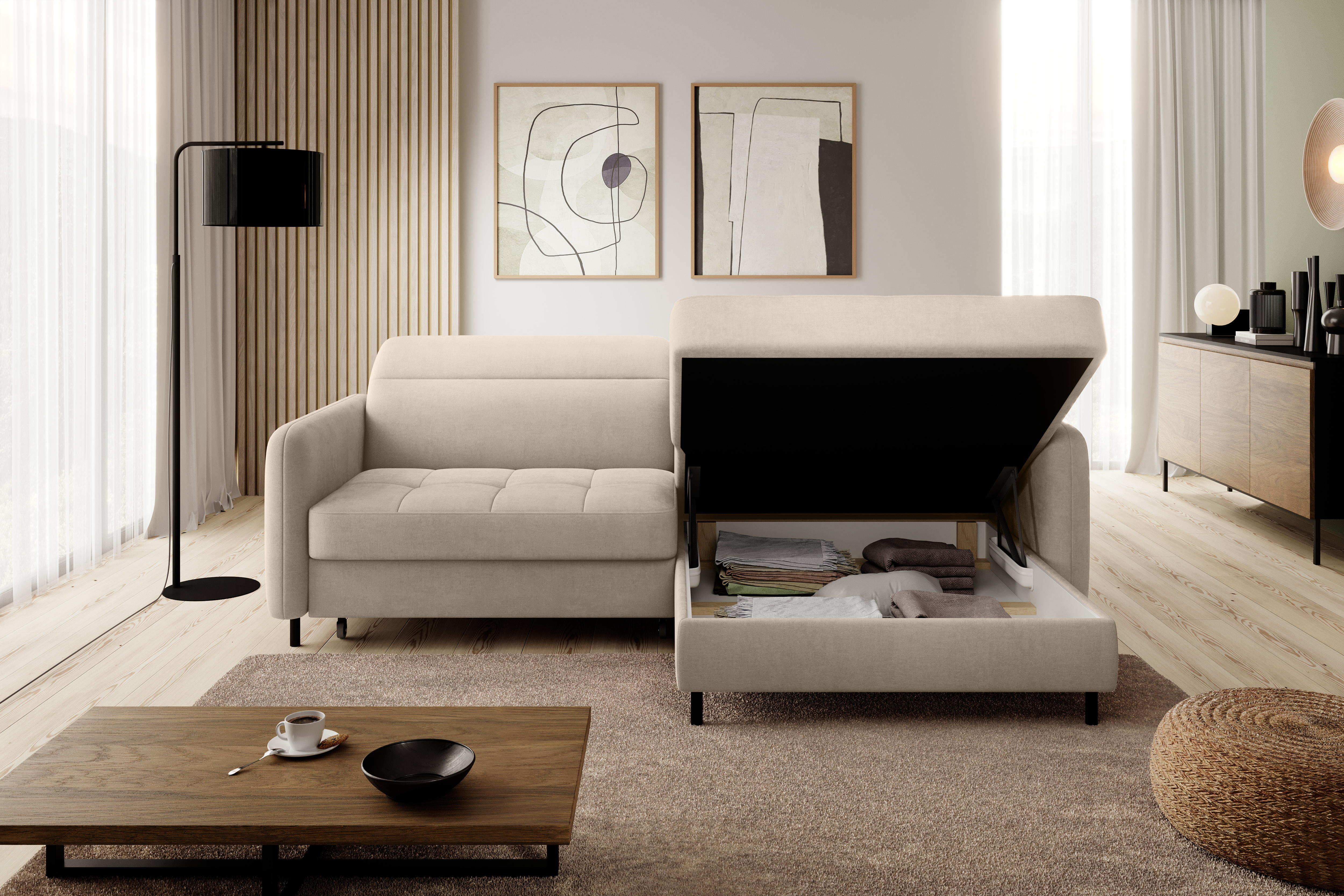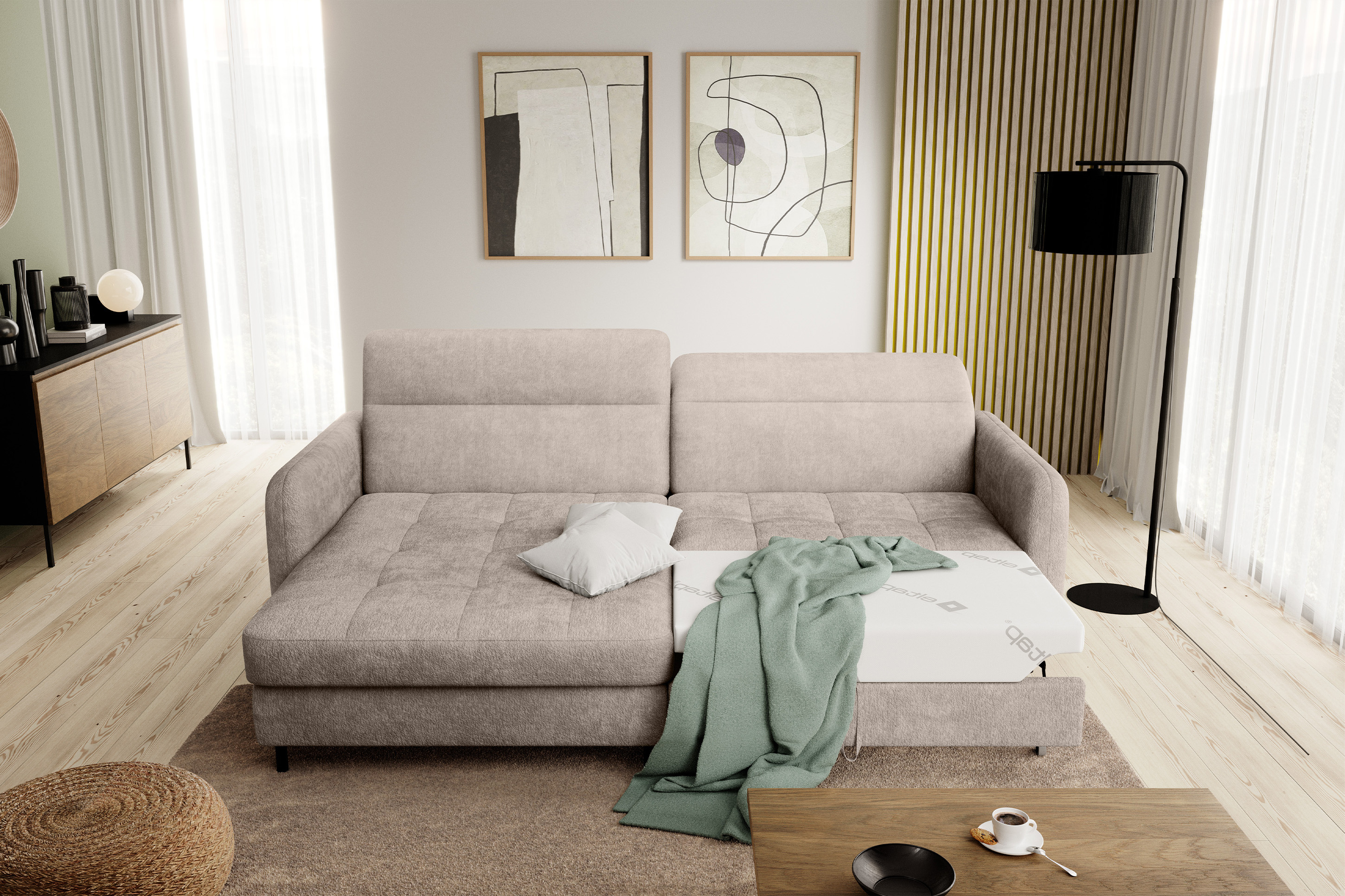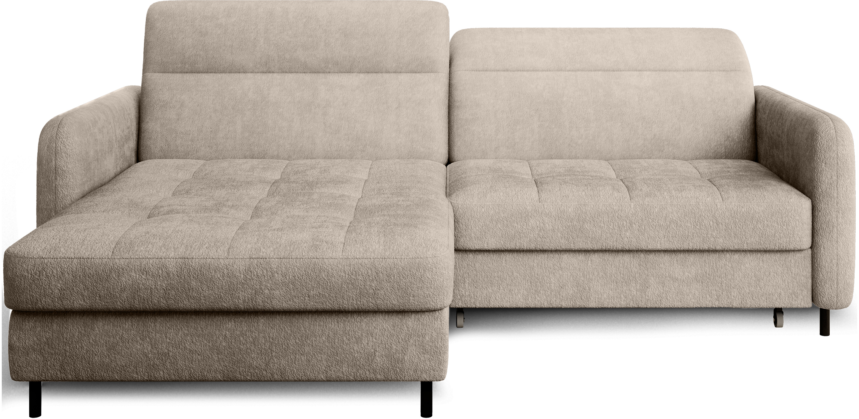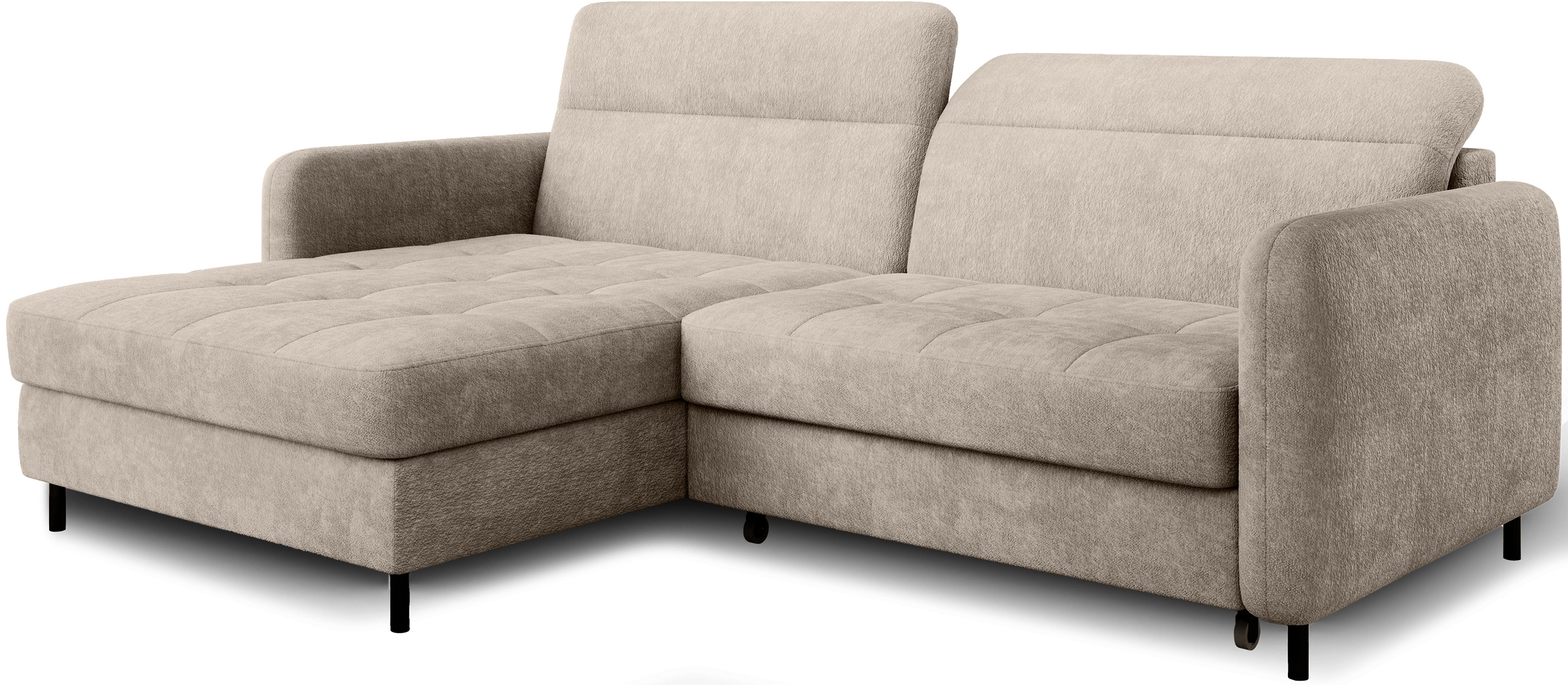 Sedací souprava Gomsi v provedení Touch 18 má rám z borovicového dřeva. Sedadlo je vyplněno elastickou HR pěnou a kvalitními vlnitými pružinami typu B. Pomocí mechanismu DL vznikne spací plocha o rozměru 200x128 cm. Nožky jsou černé kovové o výšce 10 cm. Nosnost soupravy 260 kg. Provedení rohu levé. Zboží je částečně smontováno.