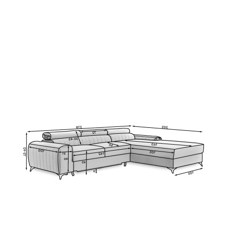 Sedací souprava Grayson v provedení Lukso 40 má rám z borovicového dřeva. Sedadlo je vyplněno elastickou HR pěnou a pěnou T30. Pomocí mechanismu DL vznikne spací plocha o rozměru 125x216 cm. Disponuje úložným prostorem. Nožky jsou stříbrné kovové o výšce 9 cm. Nosnost soupravy 315 kg. Provedení rohu pravé. Zboží je částečně smontováno.
