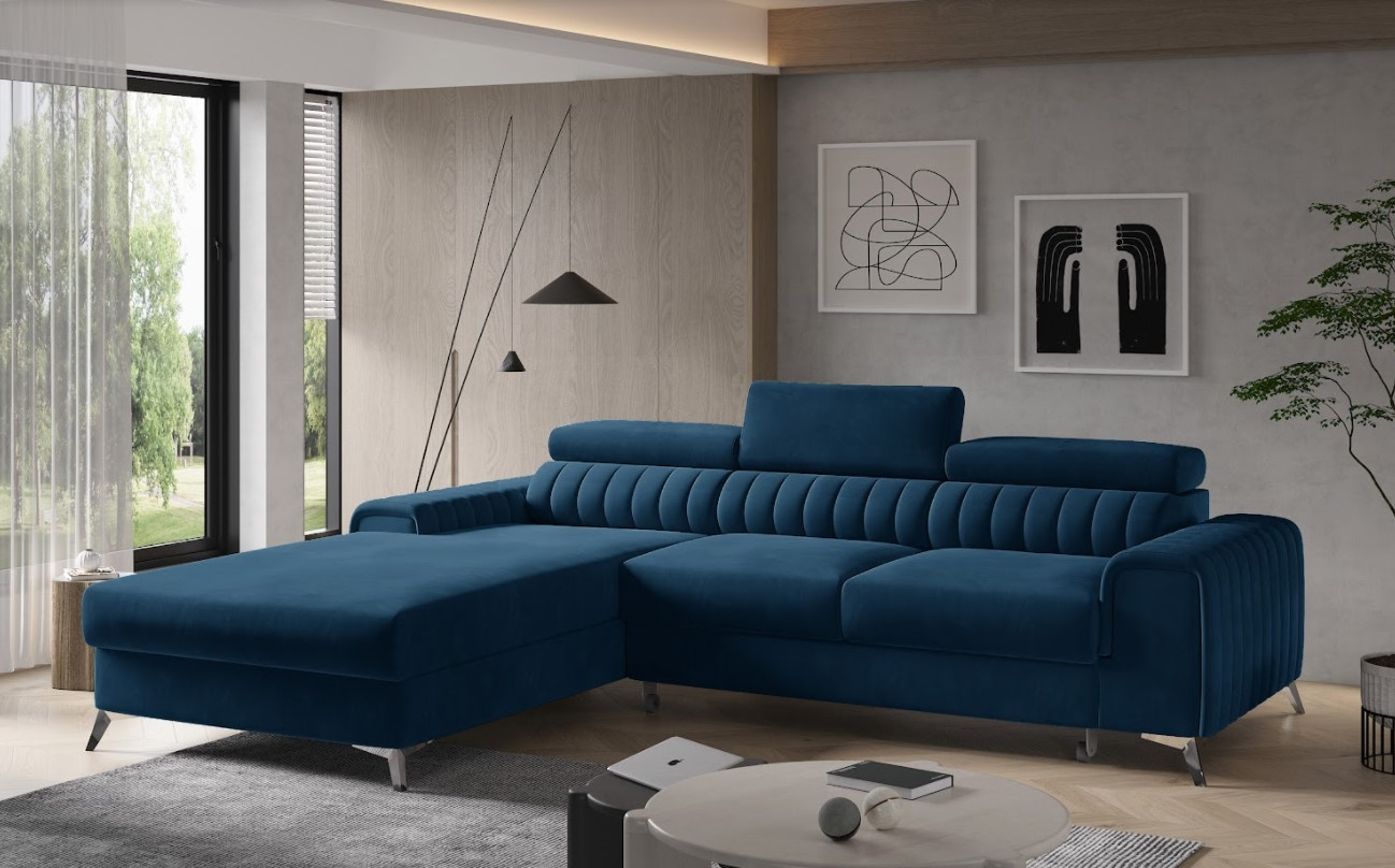 Rohová sedací souprava GRAYSON, Vás zaujme svým elegantním a moderním designem. Vyrobena je z dřevěného rámu a laminované desky. Do výplně byla použita vysoko elastická PUR pěna T25 a T30 v kombinaci s pružinami typu falliste. Pomocí rozkládacího mechanismu ji můžete snadno přeměnit na lůžko. Součástí je úložný prostor. Potažena je na dotek příjemnou látkou, zdobenou prošíváním v dezénu modrém. Komfort zajistí polohovatelné opěrky s možností nastavení výšky. Stojí na vyšších nožičkách pro větší stabilitu a vzdušnost. Vybrat si můžete nejen barevnou kombinaci, ale také orientaci rohu. Spací plocha 125 x 210 cm. Zboží dodáváme v demontu.