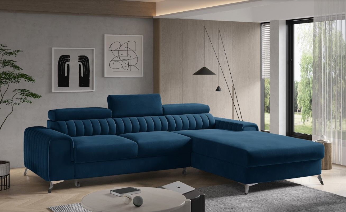 Rohová sedací souprava GRAYSON, Vás zaujme svým elegantním a moderním designem. Vyrobena je z dřevěného rámu a laminované desky. Do výplně byla použita vysoko elastická PUR pěna T25 a T30 v kombinaci s pružinami typu falliste. Pomocí rozkládacího mechanismu ji můžete snadno přeměnit na lůžko. Součástí je úložný prostor. Potažena je na dotek příjemnou látkou, zdobenou prošíváním v dezénu modrém. Komfort zajistí polohovatelné opěrky s možností nastavení výšky. Stojí na vyšších nožičkách pro větší stabilitu a vzdušnost. Vybrat si můžete nejen barevnou kombinaci, ale také orientaci rohu. Spací plocha 125 x 210 cm. Zboží dodáváme v demontu.