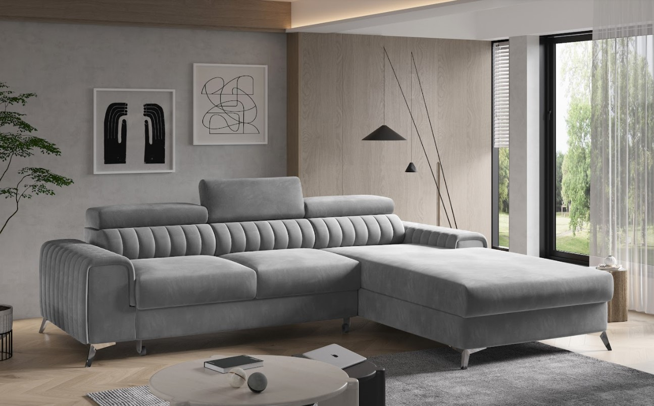Rohová sedací souprava GRAYSON, Vás zaujme svým elegantním a moderním designem. Vyrobena je z dřevěného rámu a laminované desky. Do výplně byla použita vysoko elastická PUR pěna T25 a T30 v kombinaci s pružinami typu falliste. Pomocí rozkládacího mechanismu ji můžete snadno přeměnit na lůžko. Součástí je úložný prostor. Potažena je na dotek příjemnou látkou, zdobenou prošíváním v dezénu šedém. Komfort zajistí polohovatelné opěrky s možností nastavení výšky. Stojí na vyšších nožičkách pro větší stabilitu a vzdušnost. Vybrat si můžete nejen barevnou kombinaci, ale také orientaci rohu. Spací plocha 125 x 210 cm. Zboží dodáváme v demontu.