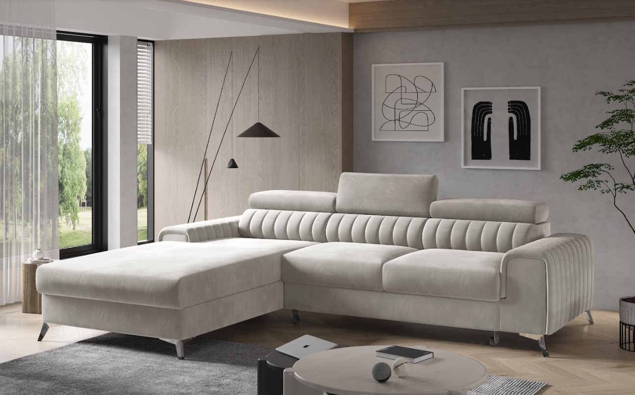 Rohová sedací souprava GRAYSON, Vás zaujme svým elegantním a moderním designem. Vyrobena je z dřevěného rámu a laminované desky. Do výplně byla použita vysoko elastická PUR pěna T25 a T30 v kombinaci s pružinami typu falliste. Pomocí rozkládacího mechanismu ji můžete snadno přeměnit na lůžko. Součástí je úložný prostor. Potažena je na dotek příjemnou látkou, zdobenou prošíváním v dezénu béžovém. Komfort zajistí polohovatelné opěrky s možností nastavení výšky. Stojí na vyšších nožičkách pro větší stabilitu a vzdušnost. Vybrat si můžete nejen barevnou kombinaci, ale také orientaci rohu. Spací plocha 125 x 210 cm. Zboží dodáváme v demontu.