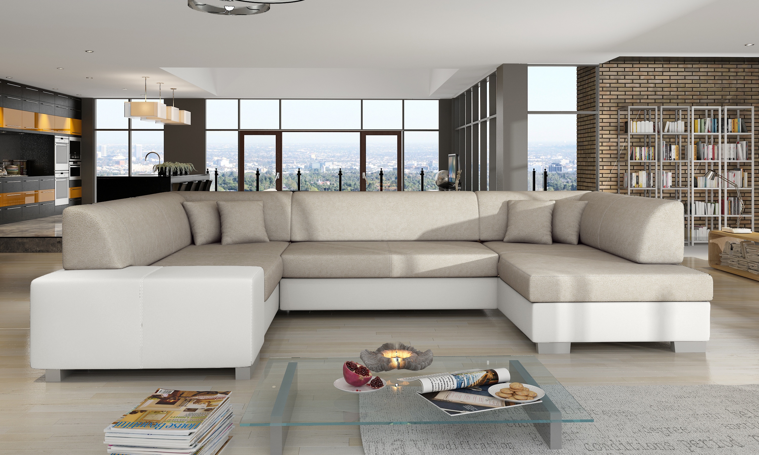Rozkládací souprava s úložným prostorem v barevném provedení béžová látka/eko kůže bílá. Spací plocha 280x125 cm. Výplň sedáků je vyrobena z vlnité pružiny a pěny T30 - tato kombinace zajišťuje měkkost, pružnost a dostatečnou oporu během odpočinku. Nabídka zahrnuje jak klasické, tlumené barevné kombinace, tak výraznější a kontrastnější kombinace. Souprava je vybavena dalšími ozdobnými polštáři, které dodávají kouzlo a zároveň zvyšují pohodlí odpočinku. Potahová látka jako na hlavní fotografii, provedení pravé. Možnost výběru pravého/levého provedení.