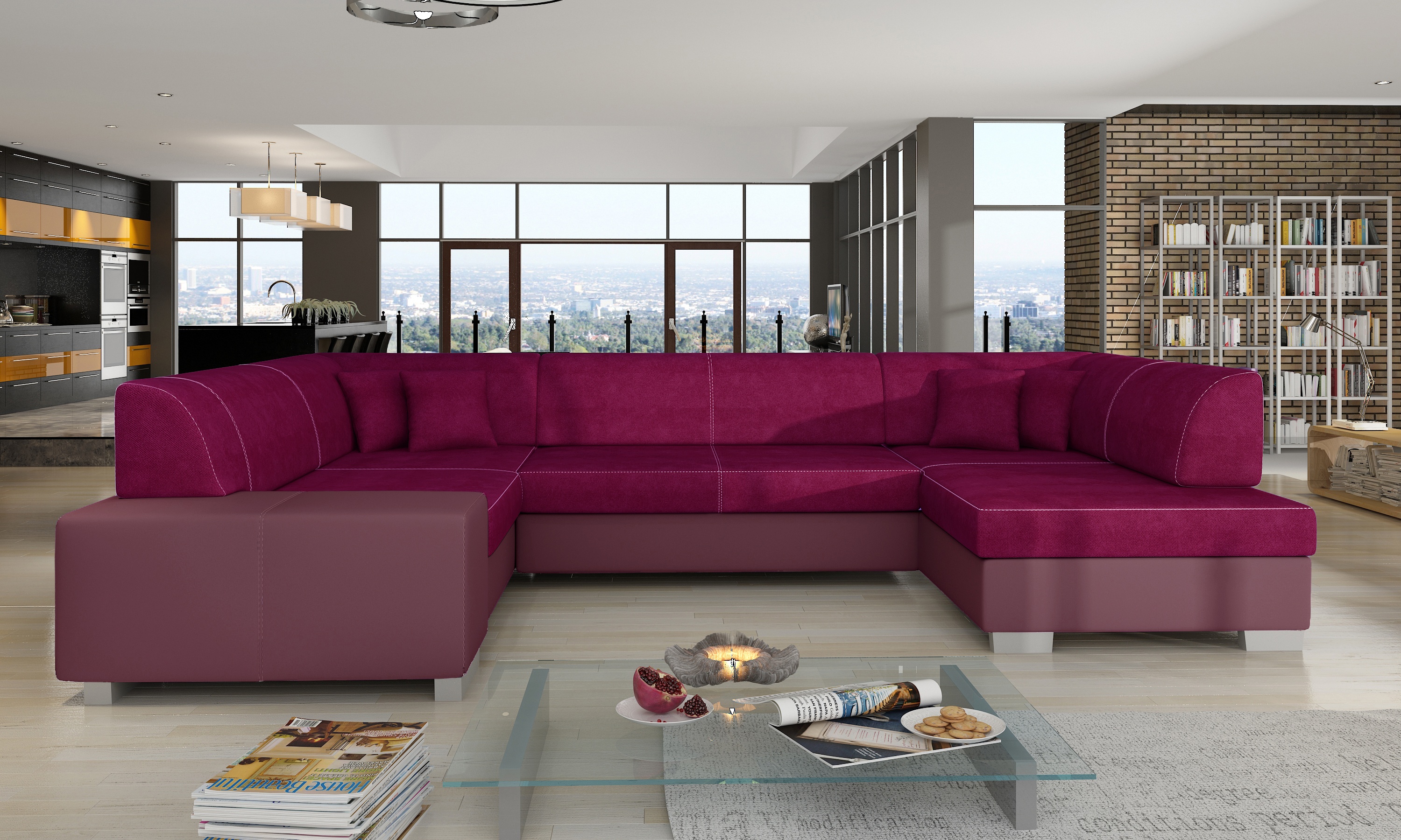 Rozkládací souprava s úložným prostorem v barevném provedení tmavě fialová látka/eko kůže fialová. Spací plocha 280x125 cm. Výplň sedáků je vyrobena z vlnité pružiny a pěny T30 - tato kombinace zajišťuje měkkost, pružnost a dostatečnou oporu během odpočinku. Nabídka zahrnuje jak klasické, tlumené barevné kombinace, tak výraznější a kontrastnější kombinace. Souprava je vybavena dalšími ozdobnými polštáři, které dodávají kouzlo a zároveň zvyšují pohodlí odpočinku. Potahová látka jako na hlavní fotografii, provedení pravé. Možnost výběru pravého/levého provedení.