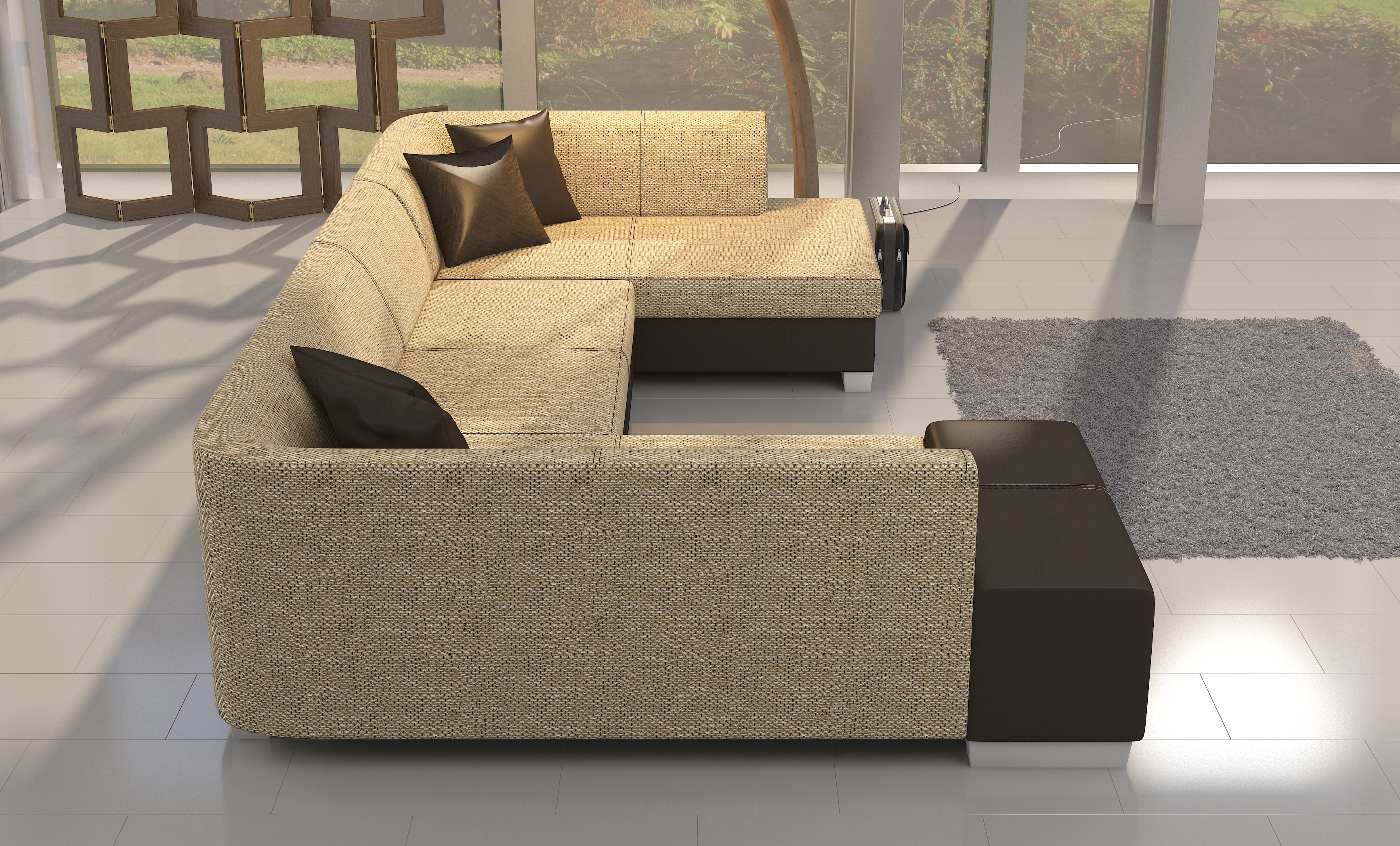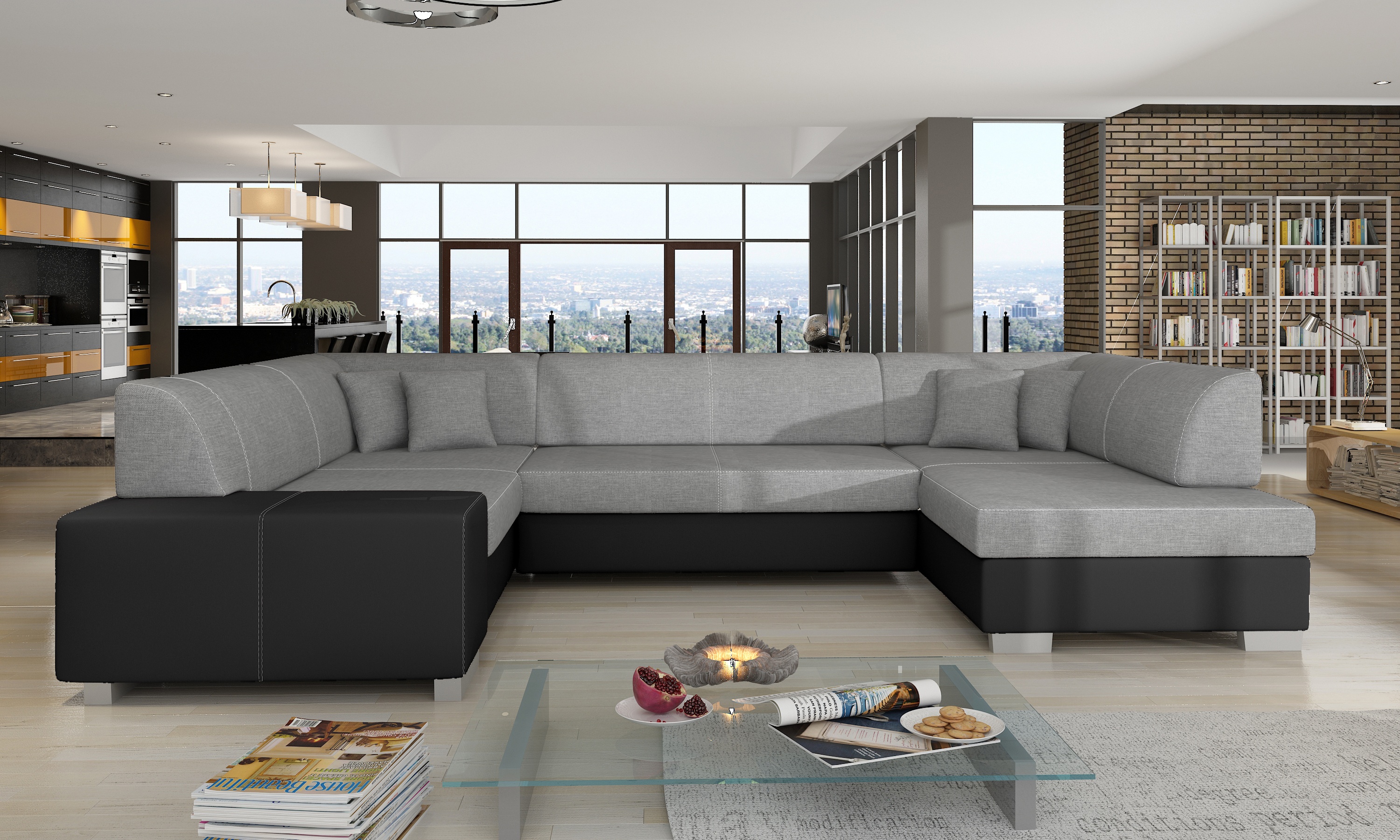 Rozkládací souprava s úložným prostorem v barevném provedení světle šedá látka/eko kůže černá. Spací plocha 280x125 cm. Výplň sedáků je vyrobena z vlnité pružiny a pěny T30 - tato kombinace zajišťuje měkkost, pružnost a dostatečnou oporu během odpočinku. Nabídka zahrnuje jak klasické, tlumené barevné kombinace, tak výraznější a kontrastnější kombinace. Souprava je vybavena dalšími ozdobnými polštáři, které dodávají kouzlo a zároveň zvyšují pohodlí odpočinku. Potahová látka jako na hlavní fotografii, provedení pravé. Možnost výběru pravého/levého provedení.