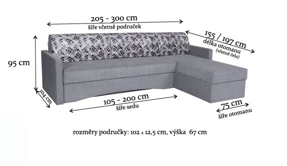 Sedací souprava pro každodenní spaní v barevném provedení dle výběru se 2 opěrnými polštáři. Sedací části jsou z vyztužené matrace Kombliflex o nosnosti 130 kg. Jednoduchý rozklad pomocí pružinového mechanizmu, šíře spací plochy 155 cmVýška sedací plochy 51 cm. Rozměry područky : 102x12,5 cm, výška 67 cm. Sedací souprava je univerzální, strany si určíte při montáži. Sedací souprava je bez područek, lze objednat také pouze 1 ks područky za 1.990,- Kč.