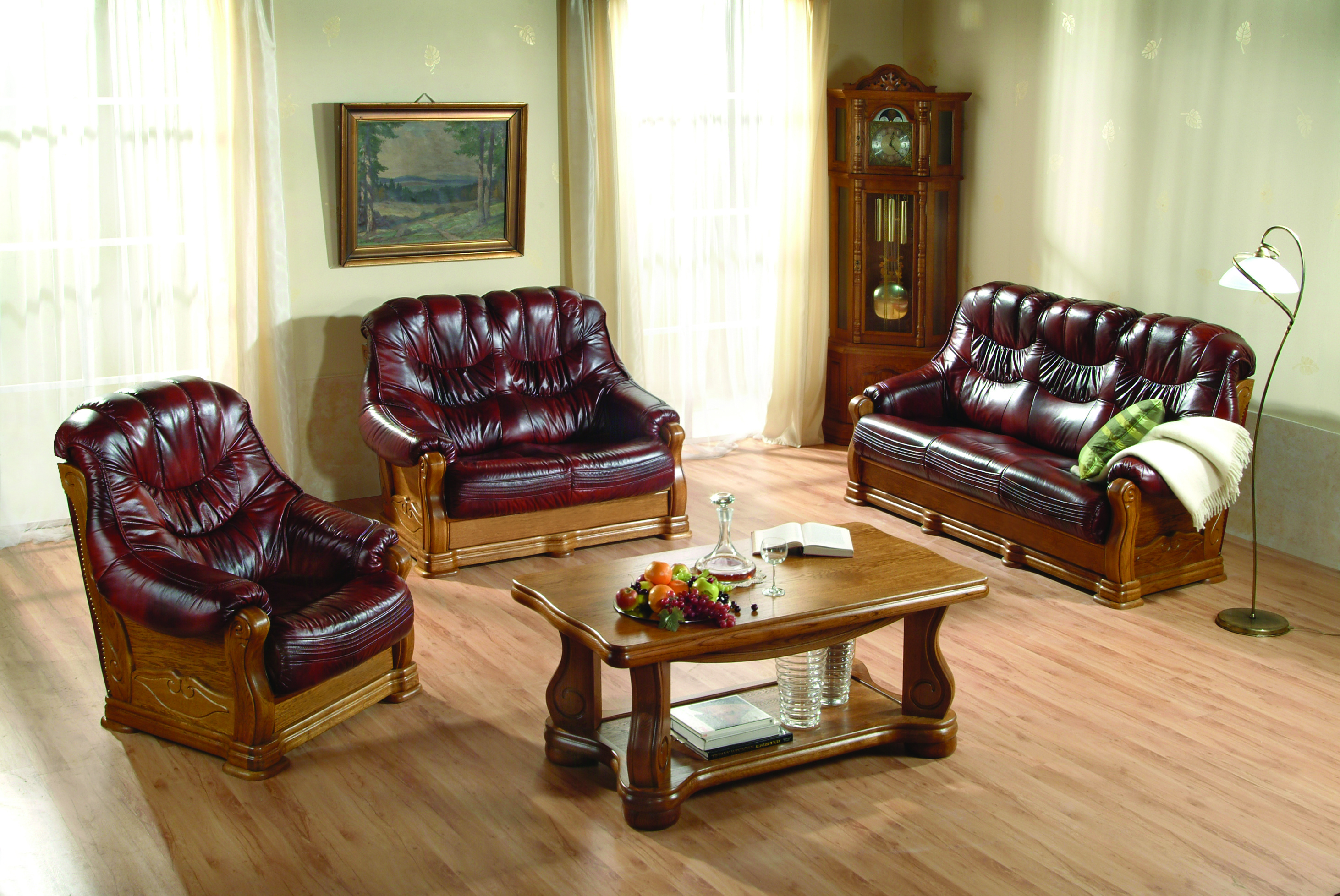 Luxusní sedací souprava je vyrobena z pravé hovězí kůže. Kostra je vyrobena z tvrdého dubového dřeva s pevnou konstrukcí. Na bocích této soupravy je ručně vyřezaný motiv. Výplň sedáků je vysoce kvalitní polyuretanová pěna s pružinou bonel. Souprava se skládá z pohovky 3-sed. + pohovky 2-sed. + křesla. Pohovka 3-sed. je rozkládací pro příležitostné spaní, spací plocha 140x190 cm. Možnost výběru barvy kůže a dřeva. Vámi zvolenou variantu barvy kůže i dřeva (dle přiloženého vzorníku ve fotkách) uveďte do objednávky. Záda soupravy jsou očalouněné látkou. V případě zájmu o dočalounění zad v provedení kůže příplatek za pohovku 3R částka 5.989,- Kč, pohovku 2N částka 4.773,- Kč a křeslo částka 3.557,- Kč.