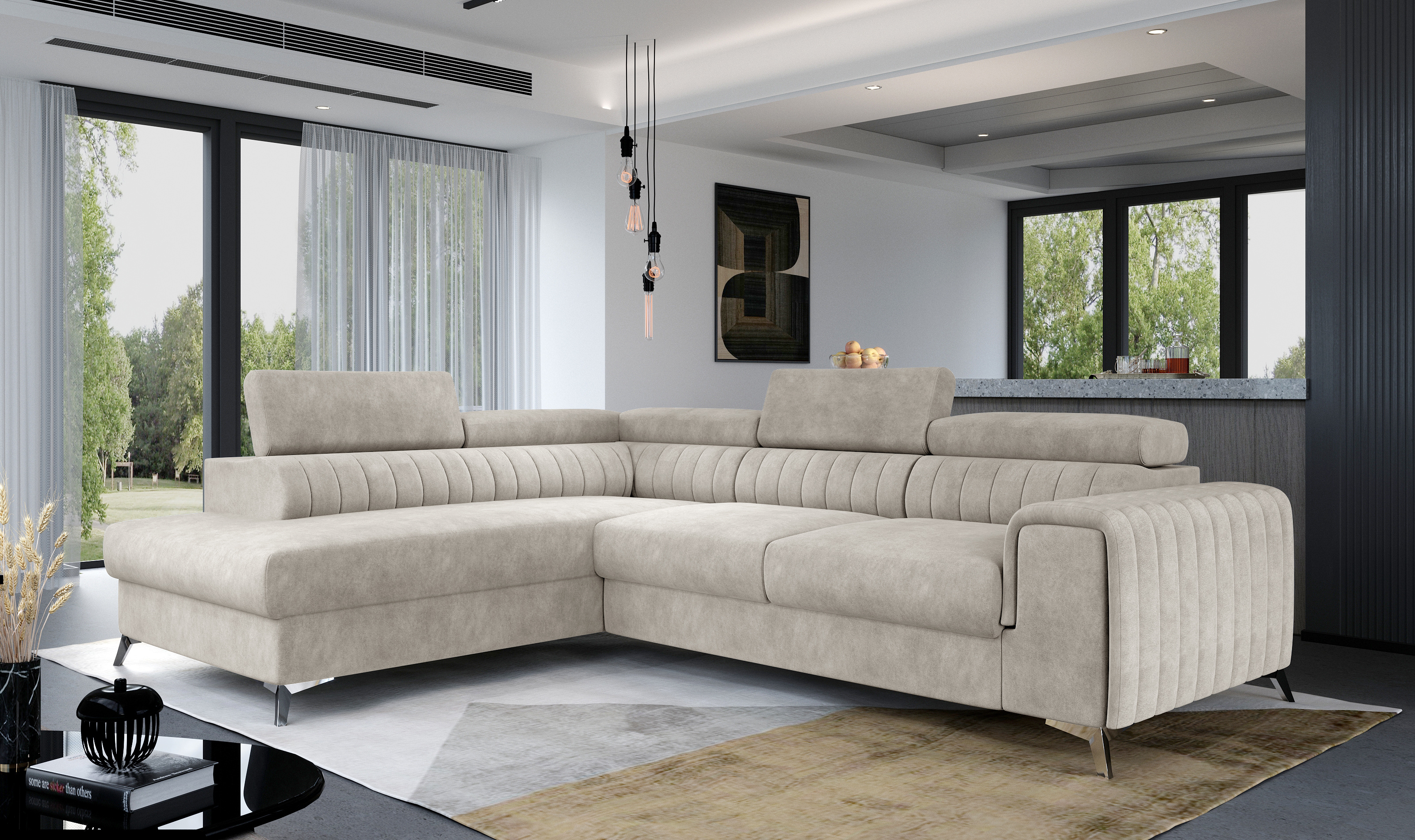 Sedací souprava Laurence v dezénu Dora 21 má zádovou opěrku vyplněná pěnou T25 a sedák kombinací pěn T30 a HR. Potahová látka Dora: pevná a měkká látka, sametová látka imitující kůži, snadno se čistí, velmi odolná proti oděru. Rozkladem vznikne spací plocha 123x193 cm pro občasné přespání. Sedačka stojí na chromovaných nožkách stříbrné barvy o výšce 9 cm.