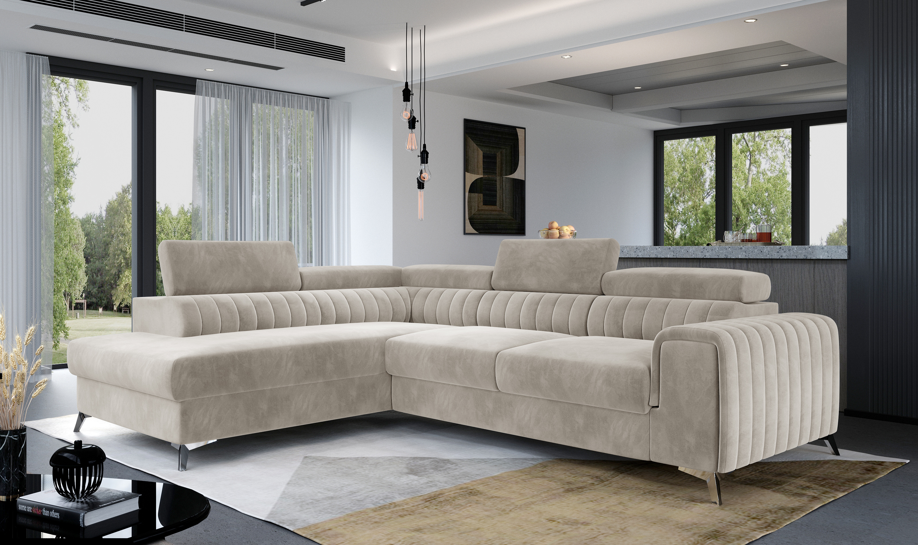 Sedací souprava Laurence v dezénu Paros 02 má zádovou opěrku vyplněná pěnou T25 a sedák kombinací pěn T30 a HR. Potahová látka Paros: označovaná jako sametová látka, látka po přejetí rukou stínuje, odolná proti roztažení a slunečnímu záření. Rozkladem vznikne spací plocha 123x193 cm pro občasné přespání. Sedačka stojí na chromovaných nožkách stříbrné barvy o výšce 9 cm.