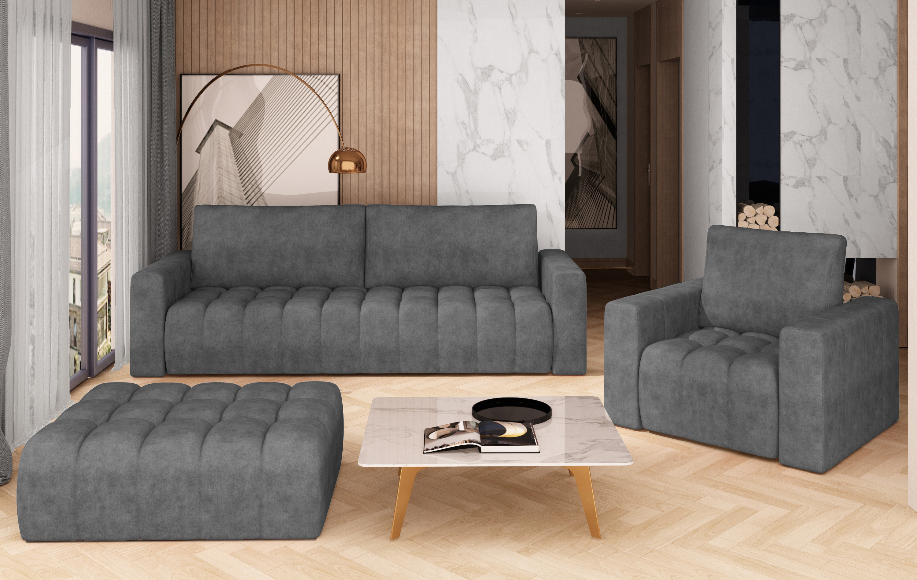 Sedací souprava Lazaro v dezénu Dora 95 má sedáky vyroben z vlnité pružiny a pěny HR+T21. Sestava se skládá z pohovky, křesla a taburetu. Potahová látka Dora: pevná a měkká látka, sametová látka imitující kůži, snadno se čistí, velmi odolná proti oděru. Rozkladem pohovky vznikne spací plocha 125x195 cm pro občasné přespání. Výška nožek 3 cm.