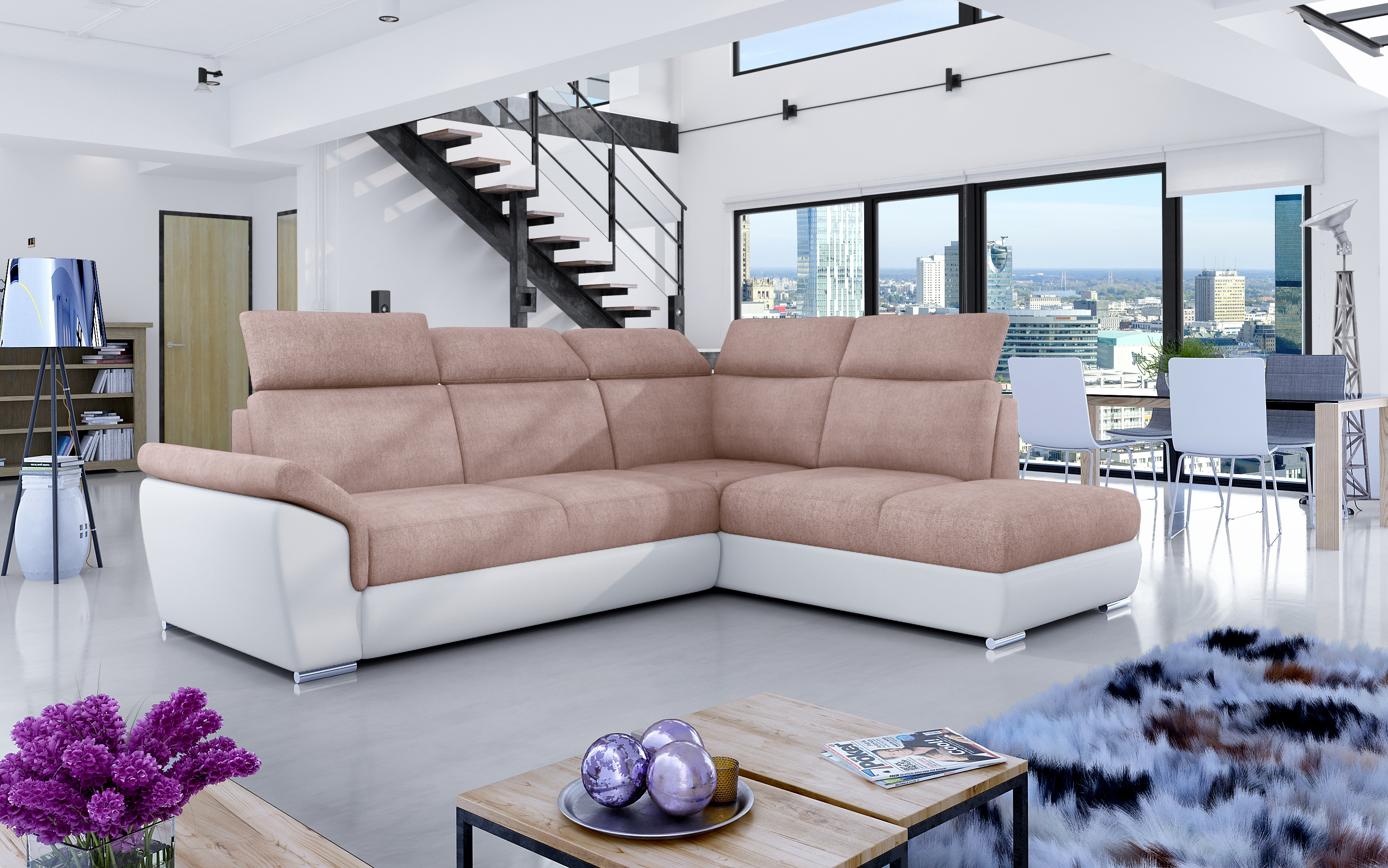 Sedací souprava v dezénu Omega 91/ eko kůže Soft 17 má sedák vyplněn pěnou T3030 a opěradlo pěnou T2542. Potahová látka Omega: hladká, jemná, prodyšná, odolná proti oděru a pevná. Potahová látka Soft: silná, pevná, nepružná a odolná eko kůže, měkká a na dotek příjemná s velmi sytým barevným provedením. Rozkladem vznikne ložná plocha 125x190 cm pro občasné přespání. Úložný prostor je přístupný pomocí pružinového zvedáku. Oválné chromované nohy jsou vysoké 5 cm.