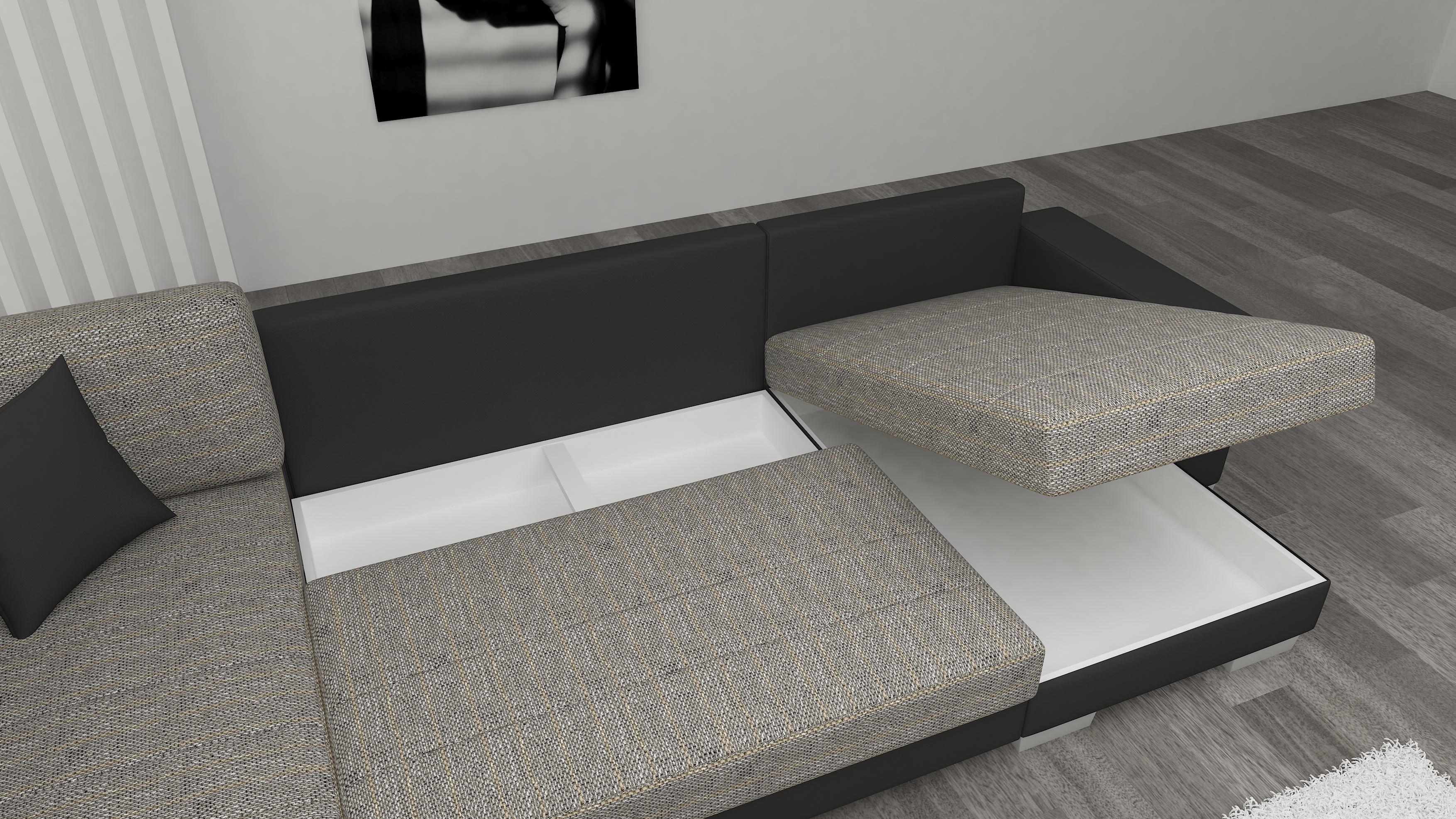Rozkládací souprava s úložným prostorem v barevném provedení světle šedá látka. Spací plocha 285x130 cm. Výplň sedáků je vyrobena z vlnité pružiny a pěny T30 - tato kombinace zajišťuje měkkost, pružnost a dostatečnou oporu během odpočinku. Souprava je k dispozici ve smíšené barevné verzi - kombinace dvou kontrastních odstínů s možnosti volby barvy čalounění se promítá do moderního vzhledu. Opěradla jsou vybavena prostornými polštáři, díky nimž relaxace v pohodlí vašeho domova získá kvalitu. Přídavek ve formě dvou menších dekorativních polštářů, které odkazují na barvu zad, loketní opěrky a spodní části nábytku. Potahová látka jako na hlavní fotografii, provedení pravé. Možnost výběru pravého/levého provedení.
