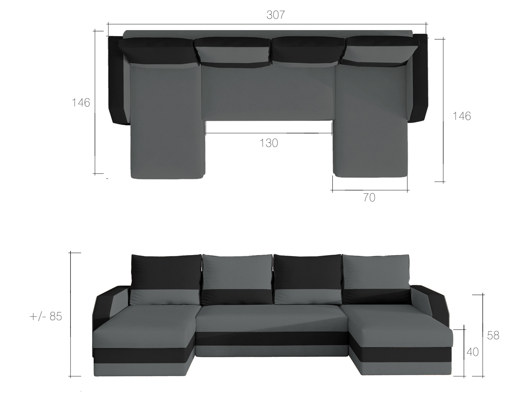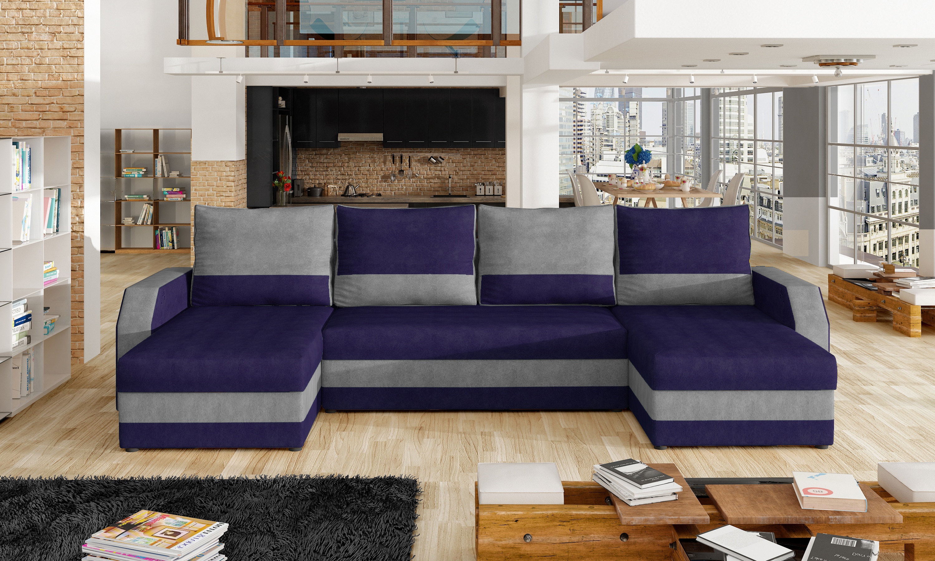 Rozkládací souprava s úložným prostorem v barevném provedení modrá/světle šedá látka. Spací plocha 268x125 cm. Výplň sedáků ve formě bonel a pěny T25, která je měkká a pružná. Tato sedací souprava je variabilní. Jednoduchý design nábytku byl kombinován s geometrickými konci loketní opěrky a barevnou kombinací čalounění, které na nábytku i polštářích tvoří dva odstíny materiálu, což ovlivňuje výraznost rohu. Potahová látka jako na hlavní fotografii.
