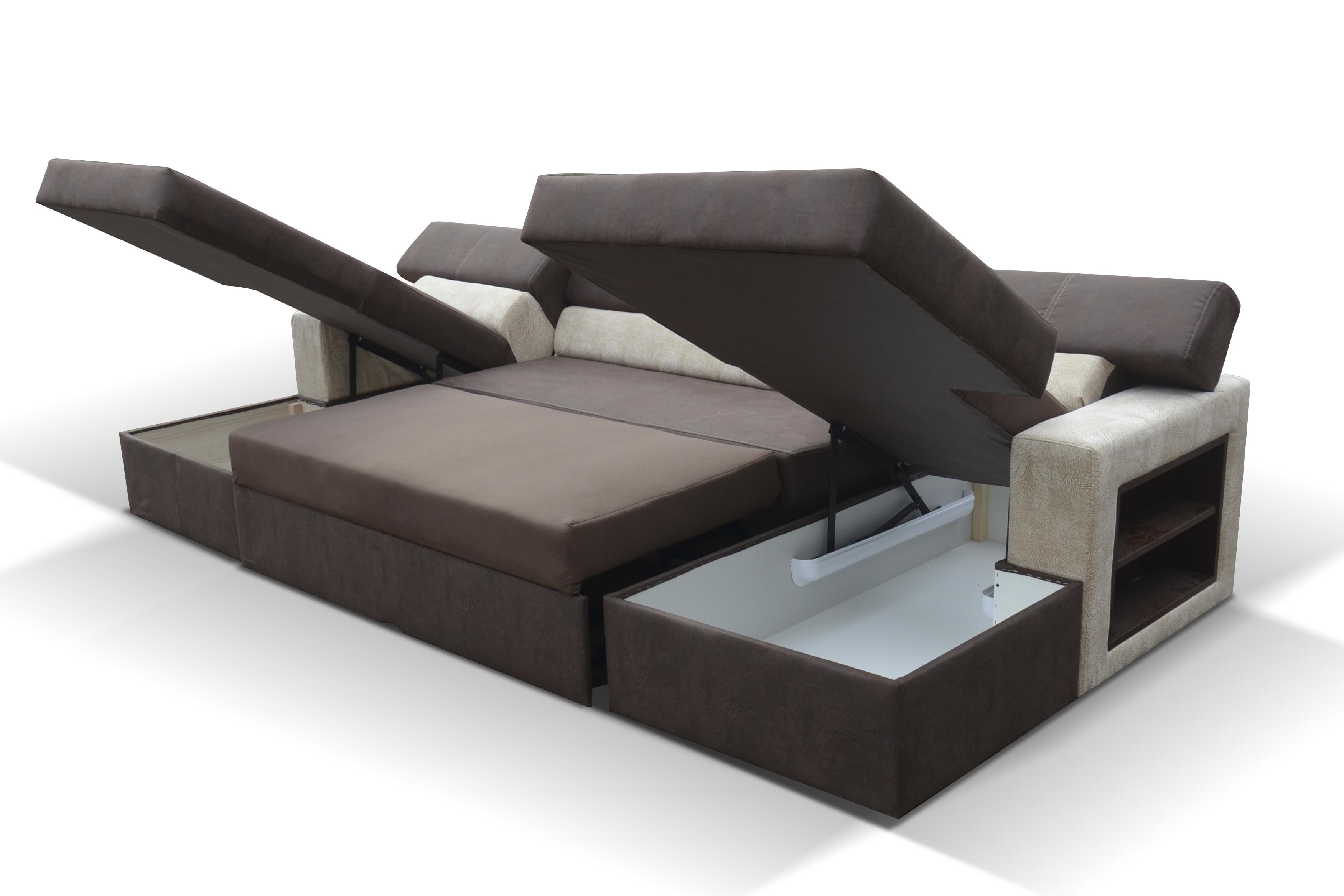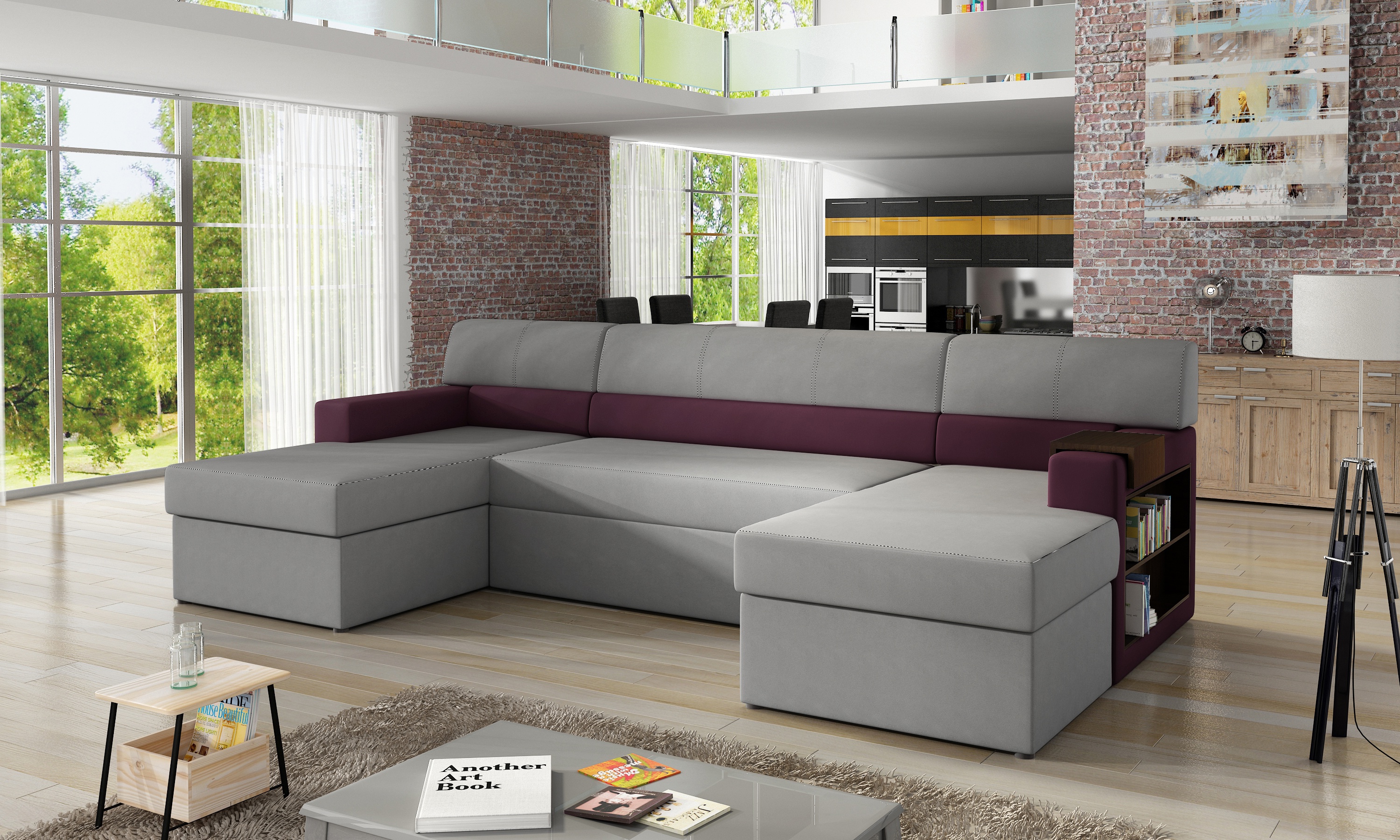Rozkládací souprava s úložným prostorem v barevném provedení světle šedá látka/eko kůže fialová . Spací plocha 275x125 cm. Výplň sedáků je vyrobena z vlnité pružiny a pěny T30 - tato kombinace zajišťuje měkkost, pružnost a dostatečnou oporu během odpočinku. Silným bodem soupravy je bezpochyby doplňkové vybavení ve formě dřevěných polic, které lze integrovat do loketní opěrky nábytku, ozdoby v podobě kontrastních opěrek a pásů procházejících celou šířkou opěradla. Potahová látka jako na hlavní fotografii, provedení pravé. Sedací souprava není určena do prostoru, nemá očalouněná záda (očalounění zad za příplatek, na dotaz). Možnost výběru pravého/levého provedení.