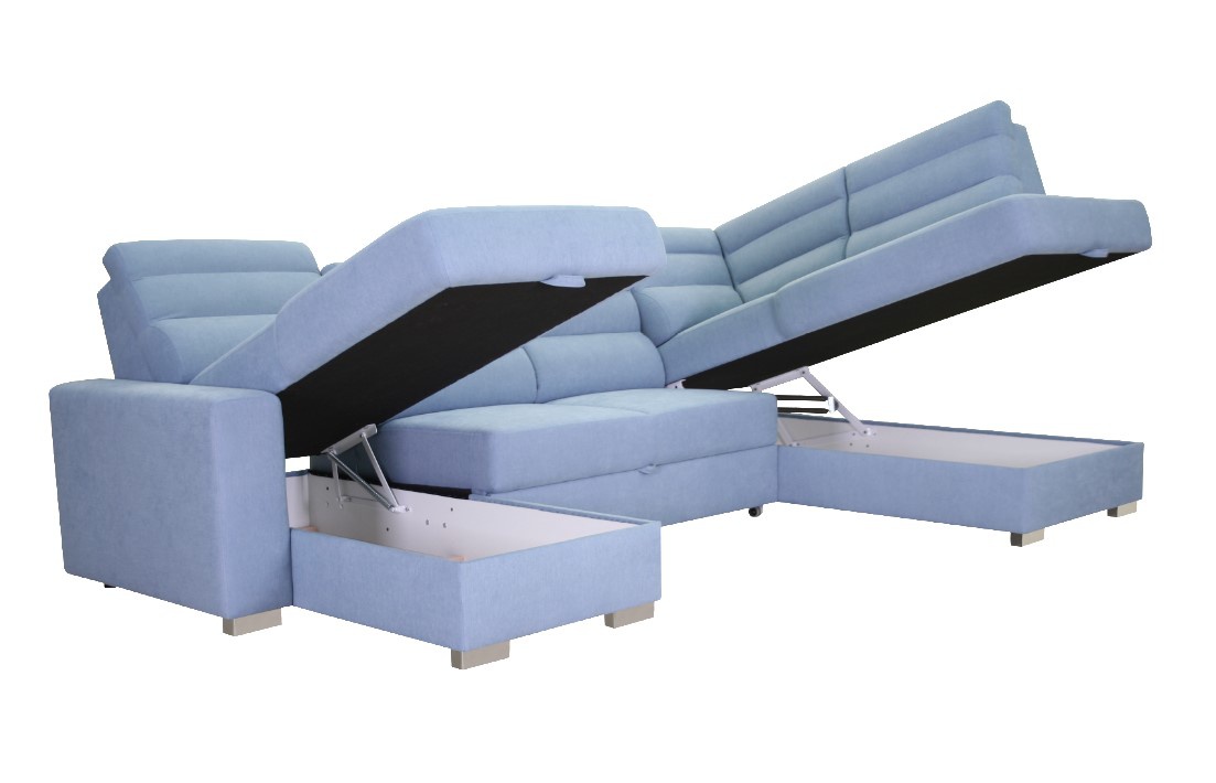Moderní rohová sedací souprava rozkládací s úložným prostorem. Kvalitní konstrukce z tvrdého dřeva a kvalitní HR studené pěny. Sedačka je celočalouněná, vhodná do prostoru. Spací plocha po rozložení 255 x 118 cm, možnost pravého i levého rohu. Možnost výběru z několika druhů látek, cena je uvedena za sestavu v nejlevnější látce. Potahová látka Pecos 13 viz.foto, čelně pravý roh.