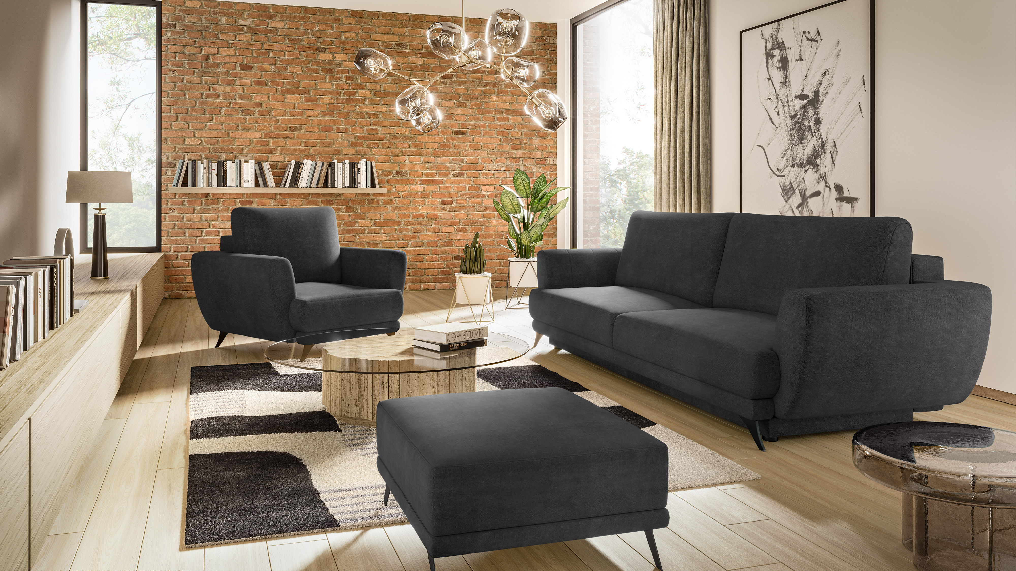 Sedací souprava Megis v barevném provedení Lukso 10 se skládá z pohovky, křesla a taburetu. Sedáky jsou vyrobeny z vysoce elastické HR pěny. Pohovka se pomocí DL mechanismu dá rozložit na spací plochu 200x145 cm a disponuje úložným prostorem. Nohy pohovky, taburetu a křesla jsou z černé oceli s výškou až 13 centimetrů. Každý prvek setu lze zakoupit i samostatně.