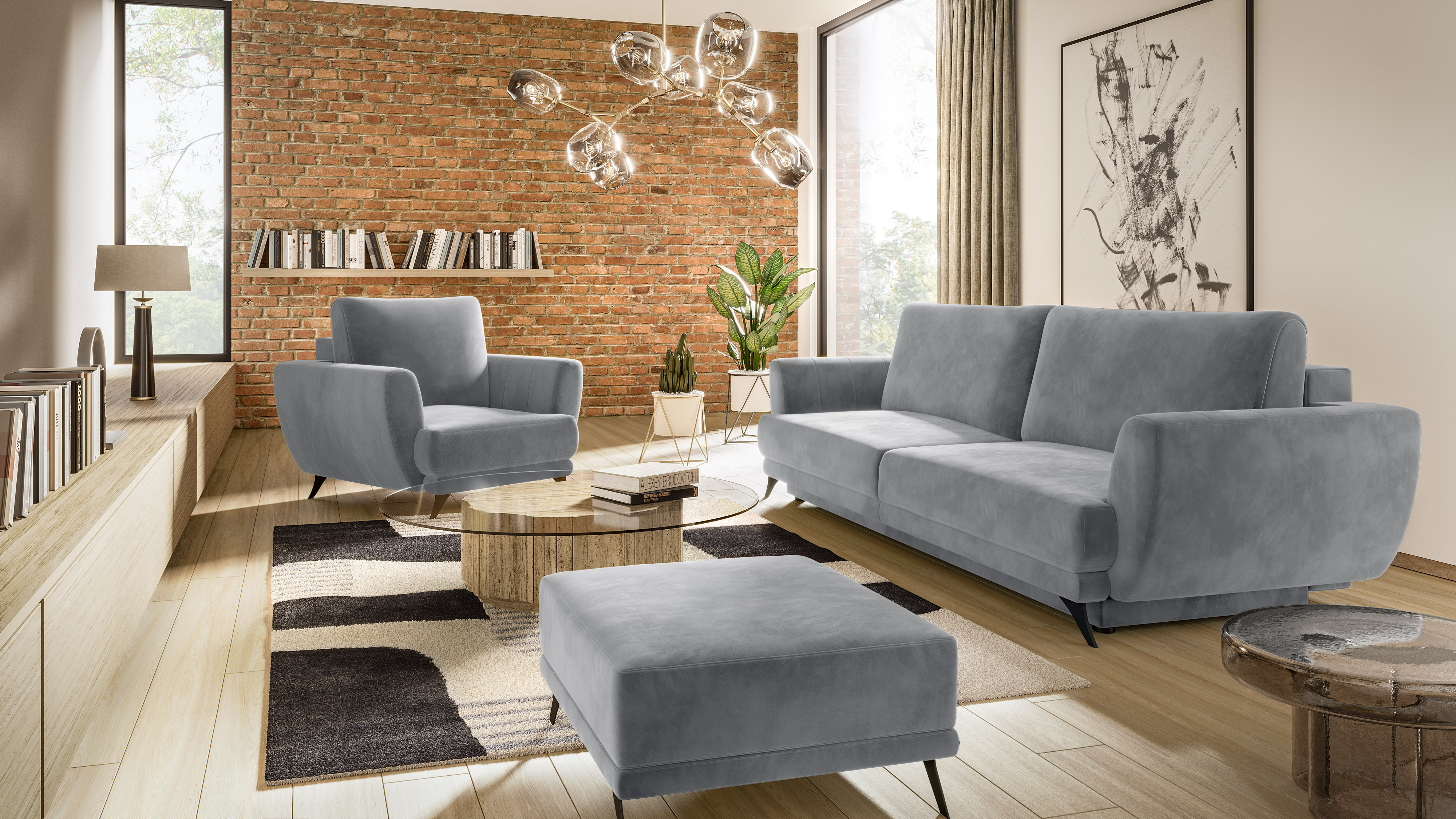 Sedací souprava Megis v barevném provedení Sola 4 se skládá z pohovky, křesla a taburetu. Sedáky jsou vyrobeny z vysoce elastické HR pěny. Pohovka se pomocí DL mechanismu dá rozložit na spací plochu 200x145 cm a disponuje úložným prostorem. Nohy pohovky, taburetu a křesla jsou z černé oceli s výškou až 13 centimetrů. Každý prvek setu lze zakoupit i samostatně.