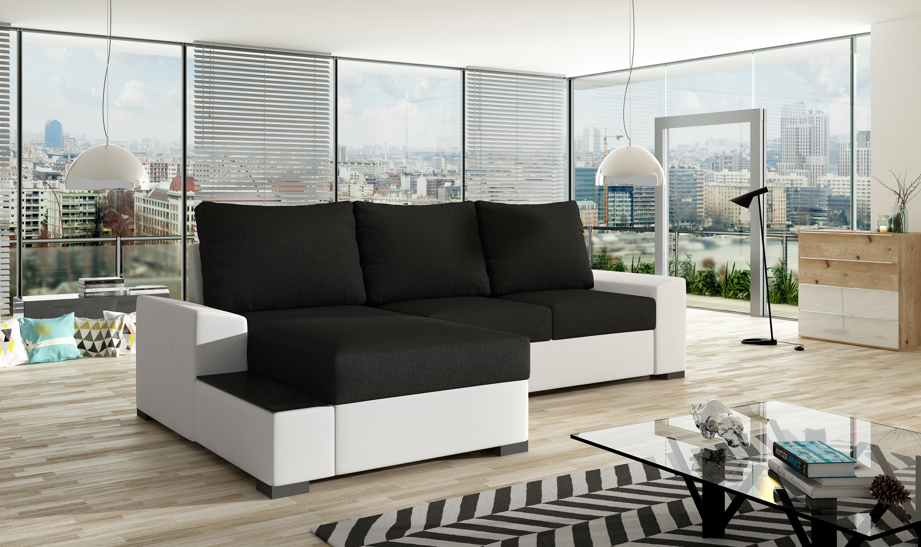 Sedací souprava Negro v provedení Sawana 14/ eko kůže Soft 17 má rám z borovicového dřeva. Sedadlo je vyplněno vyplněn bonellem a pěnou T30. Pomocí mechanismu DL vznikne spací plocha o rozměru 205x145 cm. Nožky jsou černé dřevěné. Disponuje úložným prostorem a prodlouženým taburetem ve stylu police zdobené sklem. Nosnost soupravy 270 kg. Provedení rohu je levé. Zboží je částečně smontováno.
