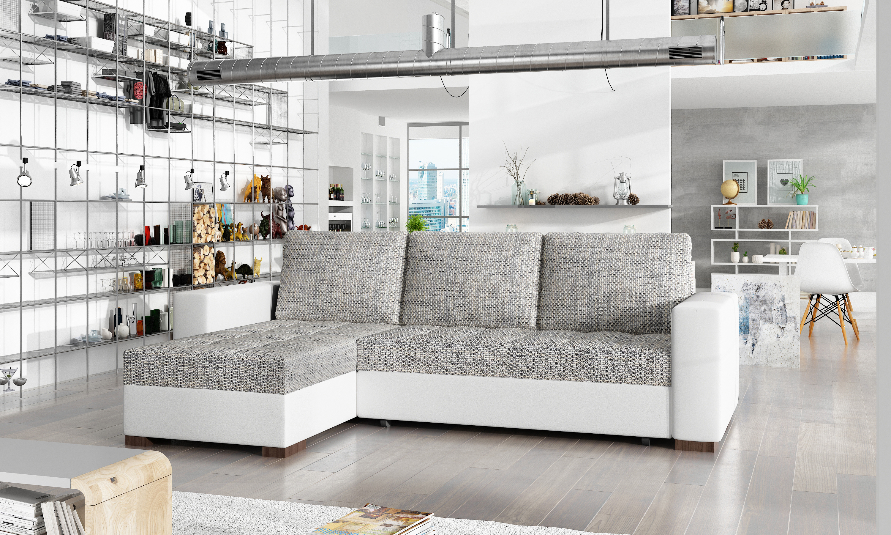 Sedací souprava Newark v provedení Berlin 01/ eko kůže Soft 17 má rám z borovicového dřeva. Sedadlo je vyplněno vyplněn bonellem a pěnou T25. Pomocí mechanismu DL vznikne spací plocha o rozměru 195x125 cm. Nožky jsou  černé dřevěné. Disponuje úložným prostorem. Nosnost soupravy 270 kg. Provedení rohu je variabilní. Zboží je částečně smontováno