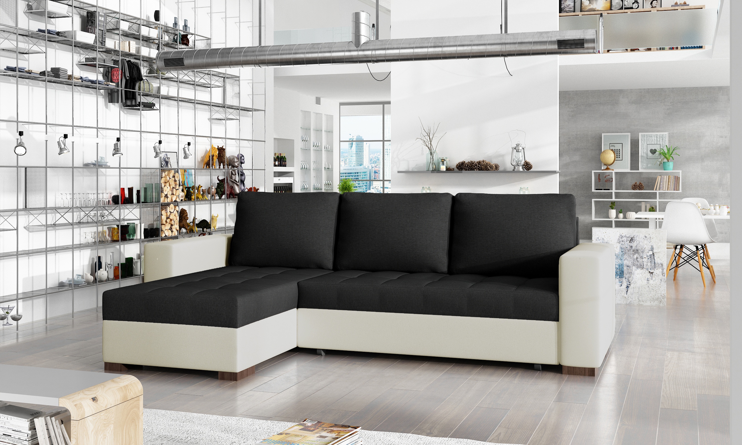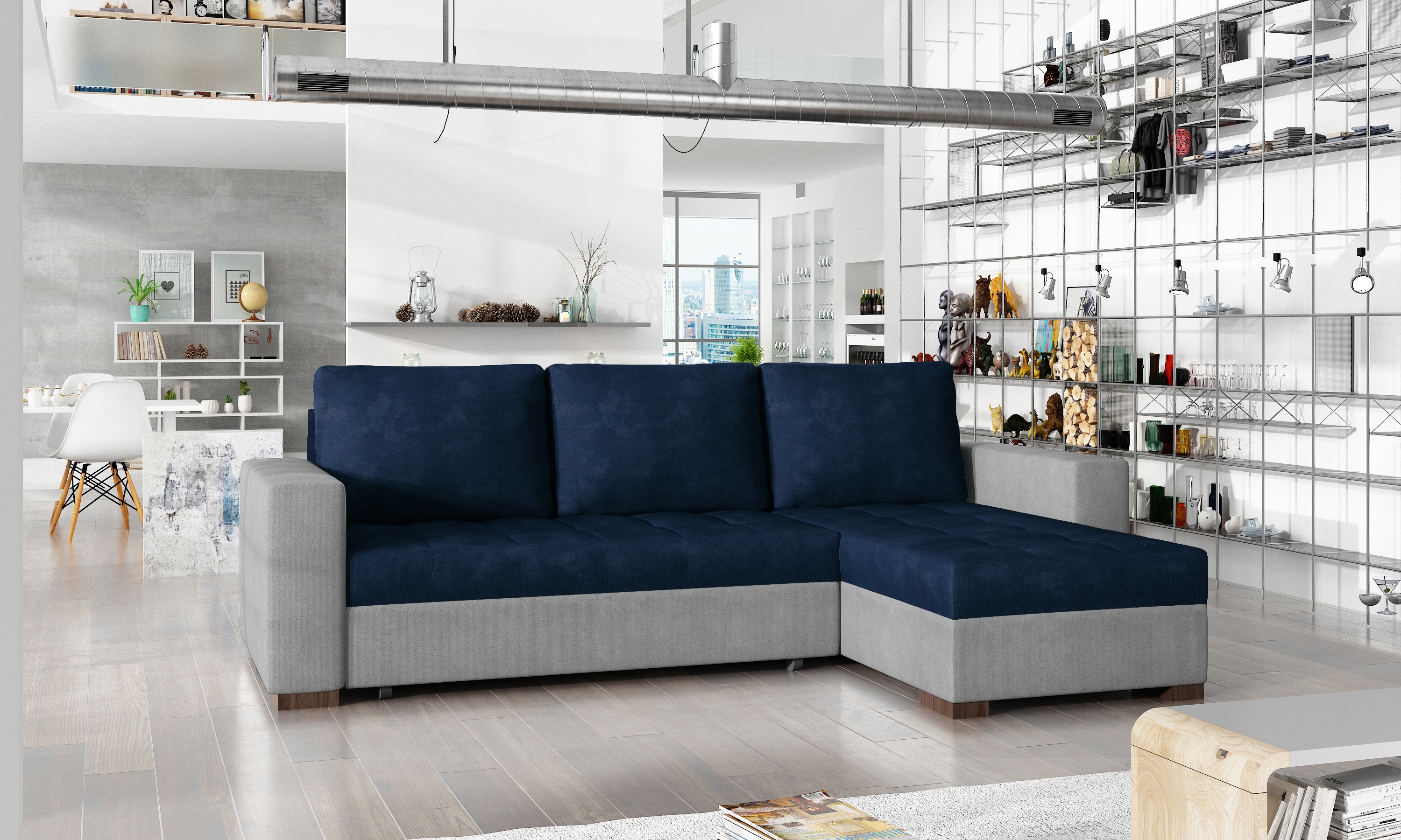 Rozkládací souprava s úložným prostorem v barevném provedení modrá/šedá. Spací plocha 195x125 cm. Výplň sedáků ve formě bonel a pěny T25, která je měkká a pružná. Moderní, jednoduchý design byl kombinován s dekorativními prvky ve formě prostorných polštářů a prošívání na sedadlech. Tato sedací souprava je variabilní. Potahová látka jako na hlavní fotografii.