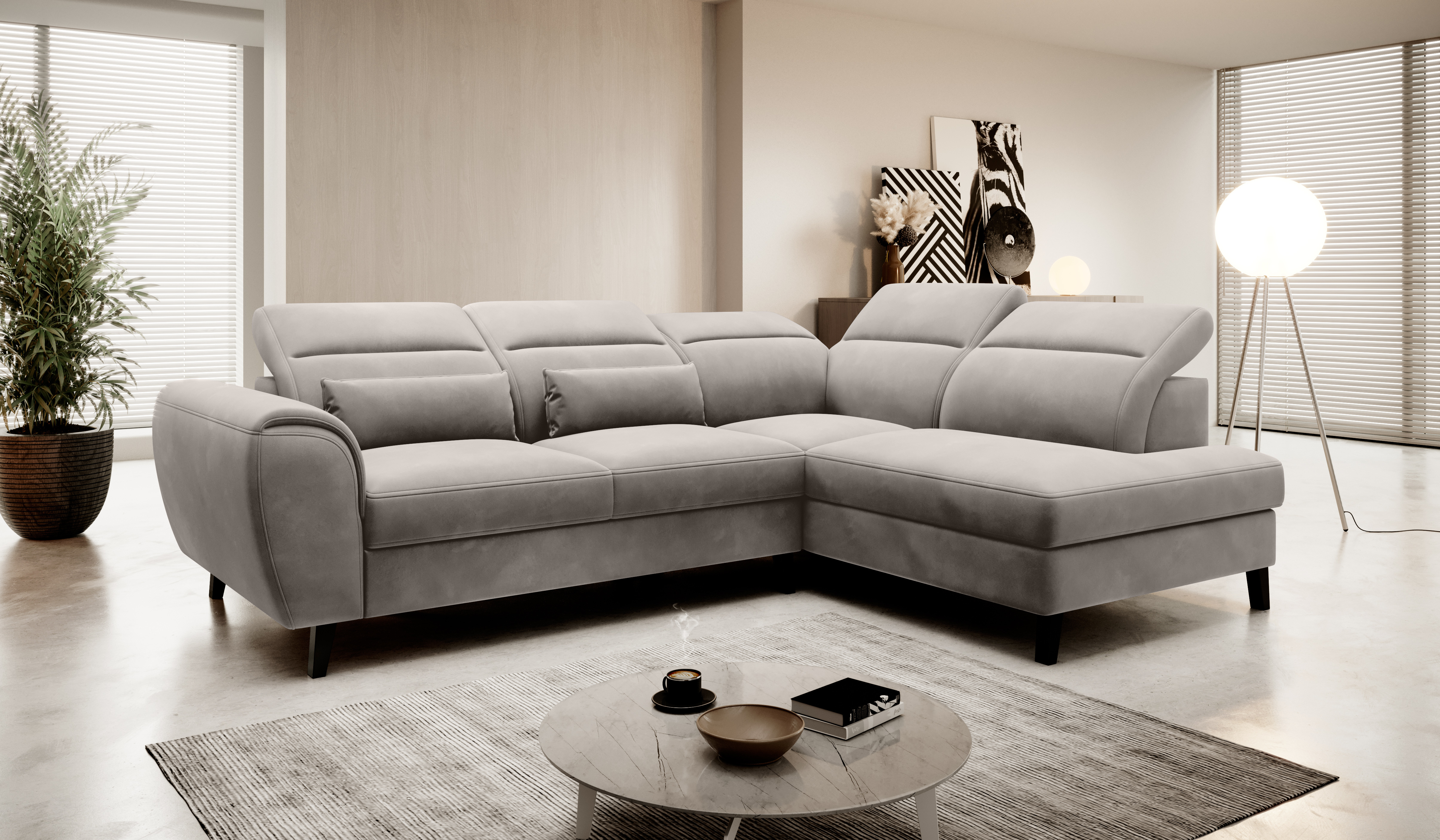 Sedací souprava Noble v provedení Loco 4 má rám z borovicového dřeva. Sedák má vyrobený z odolné vlnité pružiny typu B a vysoce flexibilní HR pěny. Výplň polštářů pěnový granulát. Rozkladem DL vznikne spací plocha 120x195 cm. Sedací souprava disponuje úložným prostorem a 5 nastavitelnými opěrkami hlavy. Nosnost pohovky 320 kg. Nohy jsou dřevěné černé o výšce 13 cm. Provedení rohu pravé. Souprava je vhodná do prostoru. Zboží je částečně smontováno.