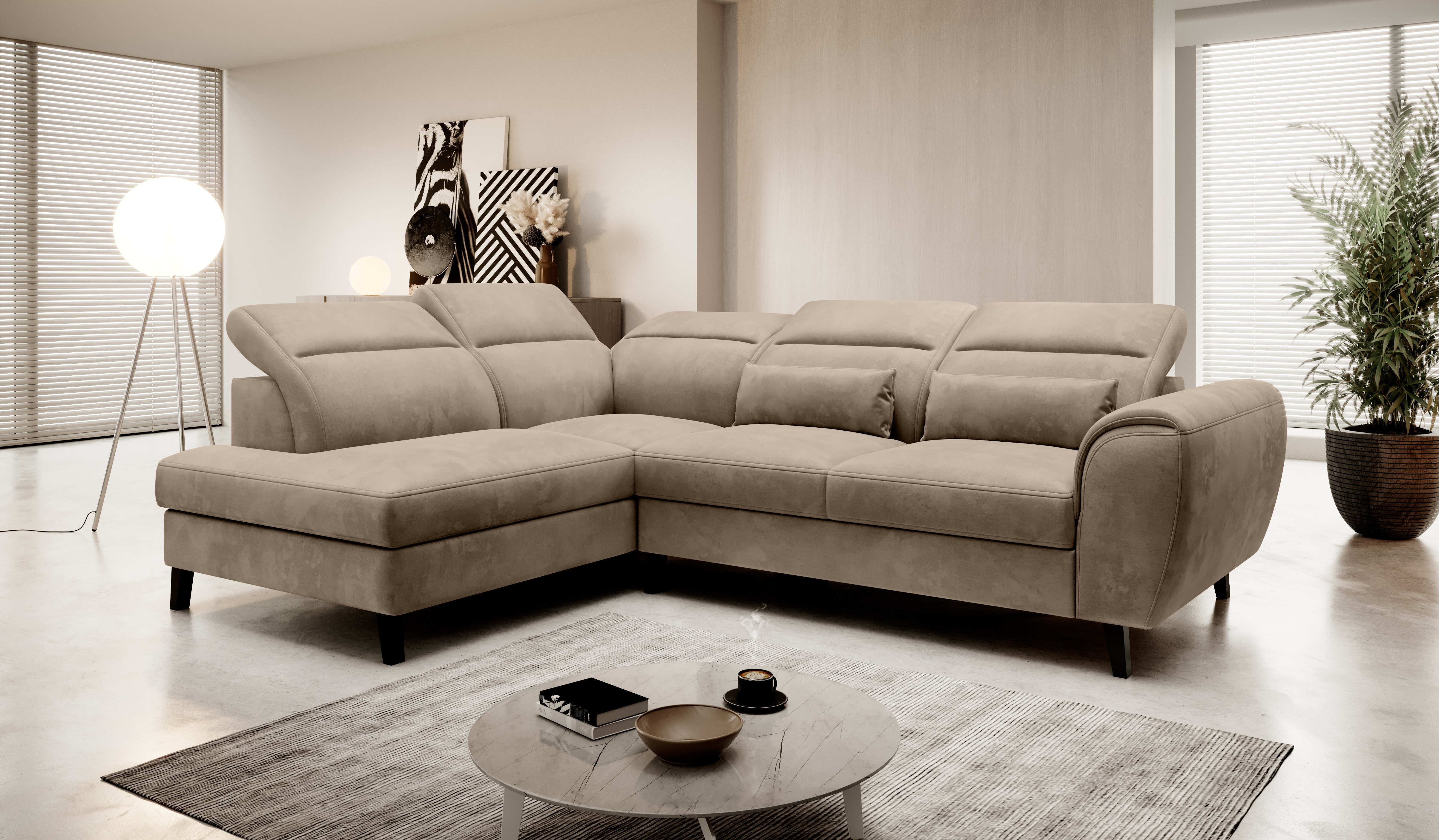 Sedací souprava Noble v provedení Nube 20 má rám z borovicového dřeva. Sedák má vyrobený z odolné vlnité pružiny typu B a vysoce flexibilní HR pěny. Výplň polštářů pěnový granulát. Rozkladem DL vznikne spací plocha 120x195 cm. Sedací souprava disponuje úložným prostorem a 5 nastavitelnými opěrkami hlavy. Nosnost pohovky 320 kg. Nohy jsou dřevěné černé o výšce 13 cm. Provedení rohu levé. Souprava je vhodná do prostoru. Zboží je částečně smontováno.