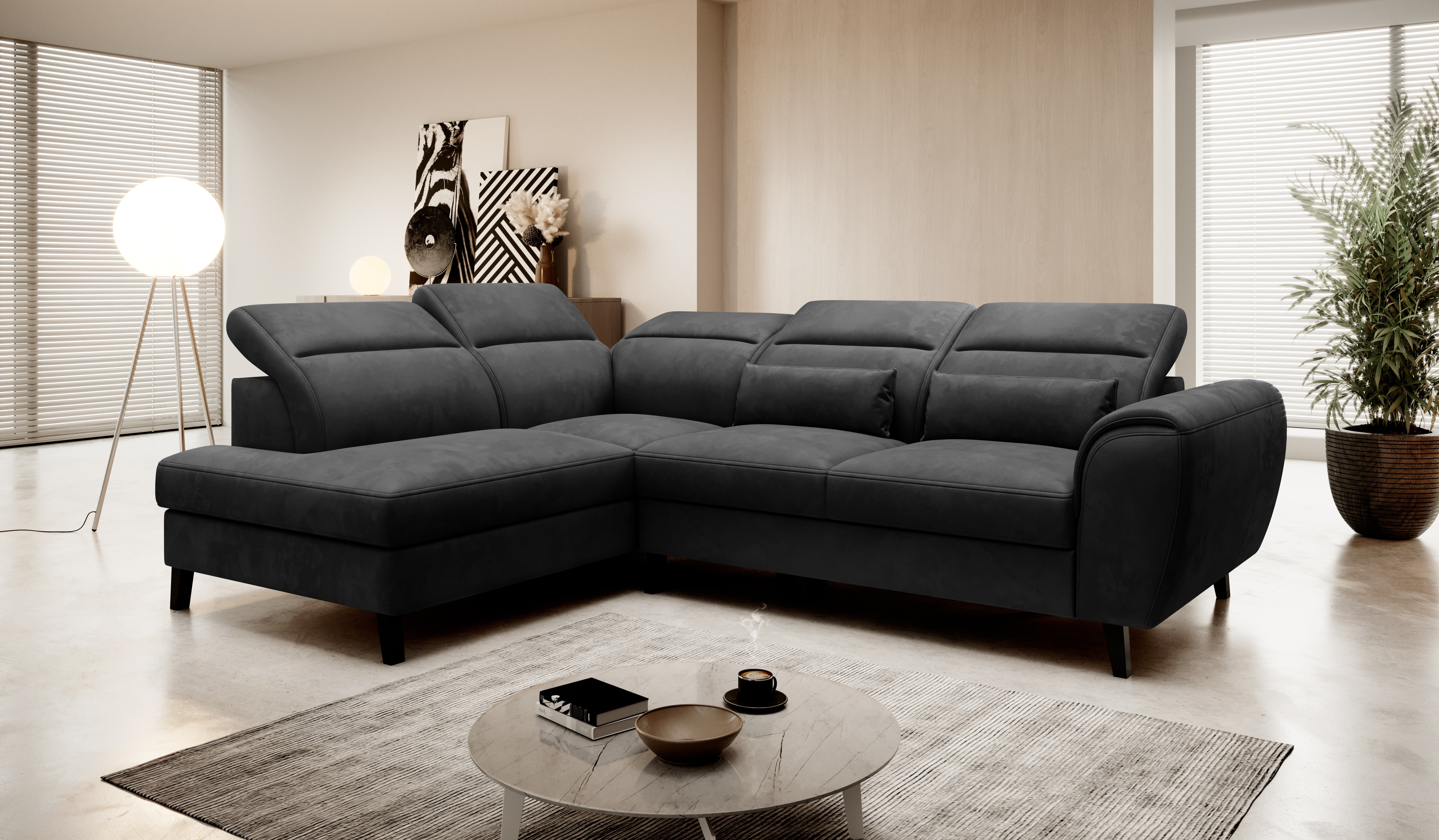 Sedací souprava Noble v provedení Nube 6 má rám z borovicového dřeva. Sedák má vyrobený z odolné vlnité pružiny typu B a vysoce flexibilní HR pěny. Výplň polštářů pěnový granulát. Rozkladem DL vznikne spací plocha 120x195 cm. Sedací souprava disponuje úložným prostorem a 5 nastavitelnými opěrkami hlavy. Nosnost pohovky 320 kg. Nohy jsou dřevěné černé o výšce 13 cm. Provedení rohu levé. Souprava je vhodná do prostoru. Zboží je částečně smontováno.