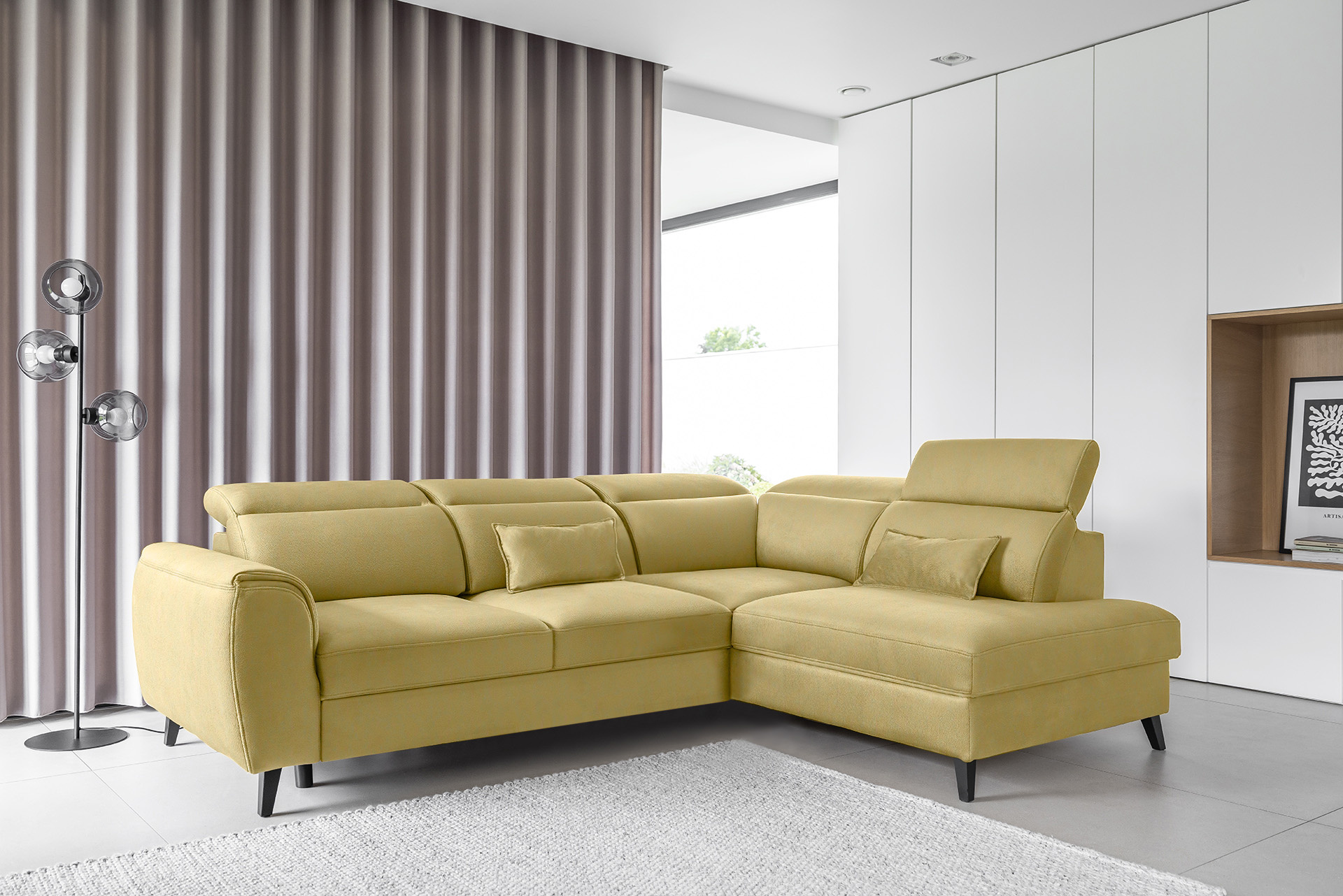 Sedací souprava Noble v provedení Savoi 45 má rám z borovicového dřeva. Sedák má vyrobený z odolné vlnité pružiny typu B a vysoce flexibilní HR pěny. Výplň polštářů pěnový granulát. Rozkladem DL vznikne spací plocha 120x195 cm. Sedací souprava disponuje úložným prostorem a 5 nastavitelnými opěrkami hlavy. Nosnost pohovky 320 kg. Nohy jsou dřevěné černé o výšce 13 cm. Provedení rohu pravé. Souprava je vhodná do prostoru. Zboží je částečně smontováno.