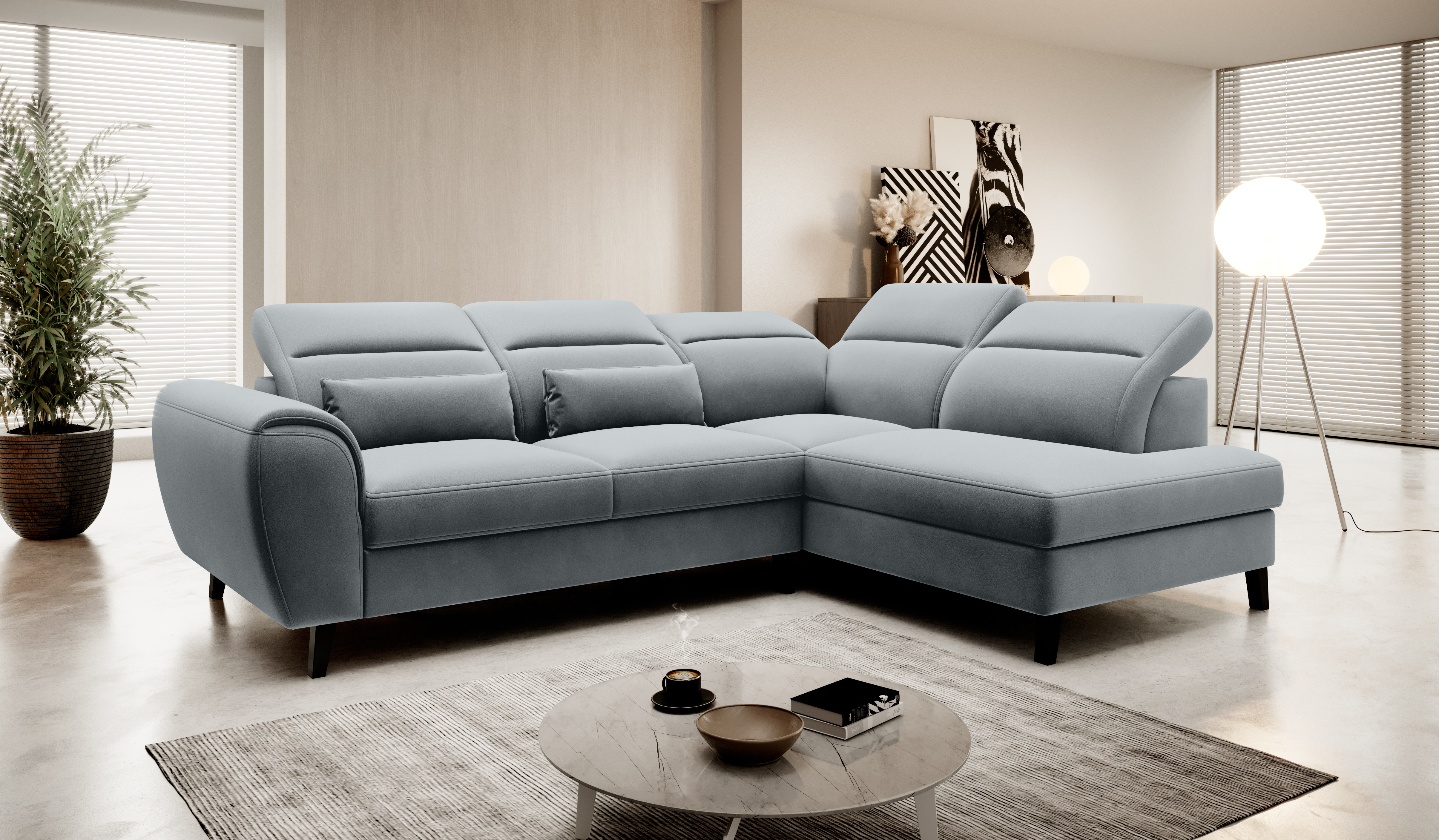 Sedací souprava Noble v provedení Velvetmat 4 má rám z borovicového dřeva. Sedák má vyrobený z odolné vlnité pružiny typu B a vysoce flexibilní HR pěny. Výplň polštářů pěnový granulát. Rozkladem DL vznikne spací plocha 120x195 cm. Sedací souprava disponuje úložným prostorem a 5 nastavitelnými opěrkami hlavy. Nosnost pohovky 320 kg. Nohy jsou dřevěné černé o výšce 13 cm. Provedení rohu pravé. Souprava je vhodná do prostoru. Zboží je částečně smontováno.