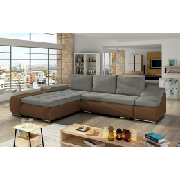 Sedací souprava Ontario v provedení Soro 13/ eko kůže Soft 15 má rám z borovicového dřeva. Sedadlo je vyplněno kombinací vlnitých pružin a pěny T3040. Opěradlo má výplň pěnou T2542. Pomocí mechanismu DL vznikne spací plocha o rozměru 240x140 cm. Nožky jsou stříbrné kovové. Disponuje úložným prostorem a rozšířenou loketní opěrkou na jedné straně (druhá strana má kratší vlnitou loketní opěrku). Nosnost soupravy 270 kg. Provedení rohu levé. Zboží je částečně smontováno.