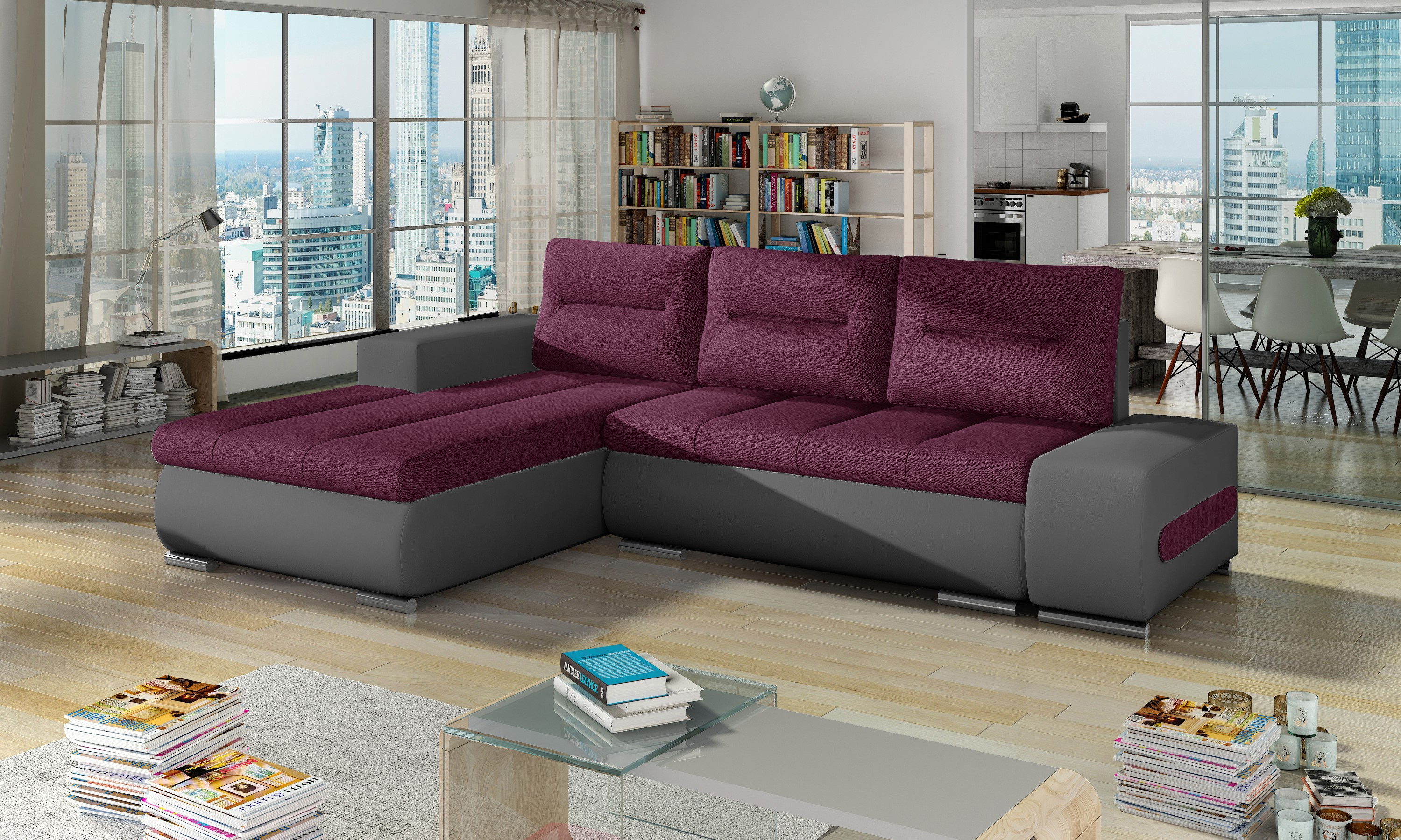 Sedací souprava Onttavio v provedení Lars 68/ eko kůže Soft 66 má rám z borovicového dřeva. Sedadlo je vyplněno vlnitou pružinou a vysoce kvalitní elastickou pěnou T30. Výplň opěradla pěnou T2540. Pomocí mechanismu DL vznikne spací plocha o rozměru 195x125 cm. Nožky jsou plastové stříbrné. Disponuje úložným prostorem. Nosnost soupravy 270 kg. Provedení rohu levé. Zboží je částečně smontováno.